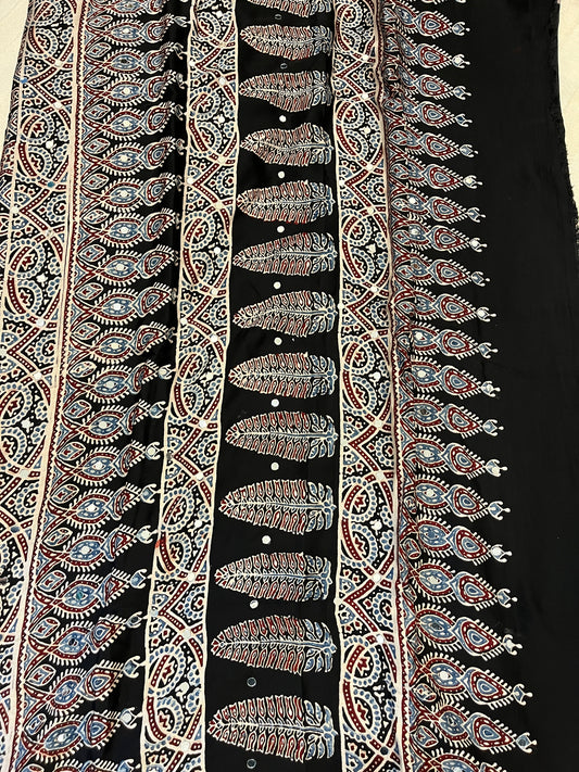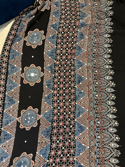 Ajrakh Modal Silk Saree with Mirror Work - Black Half & Half