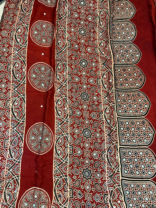 Ajrakh Modal Silk Saree -Red Badam Block