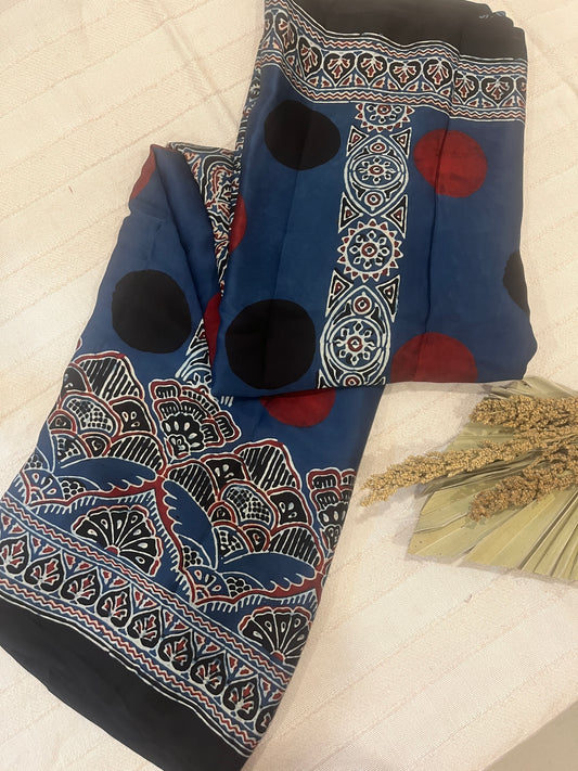 Contemporary Ajrakh Modal Silk Saree- Indigo with Polka Dots