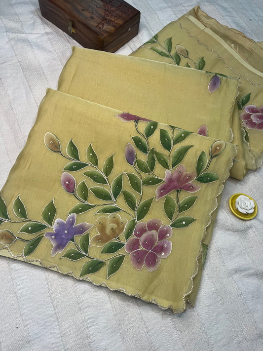 Crepe Organza Handpainted Saree with Embroidery- Lemon Yellow