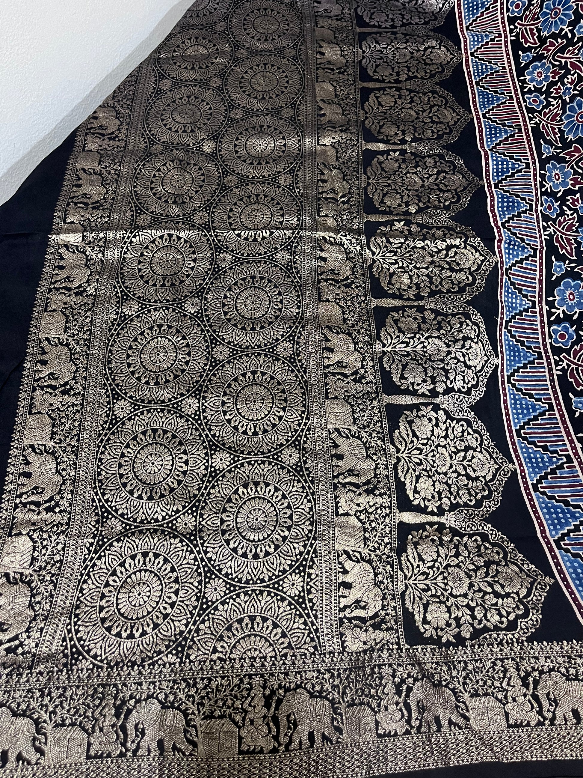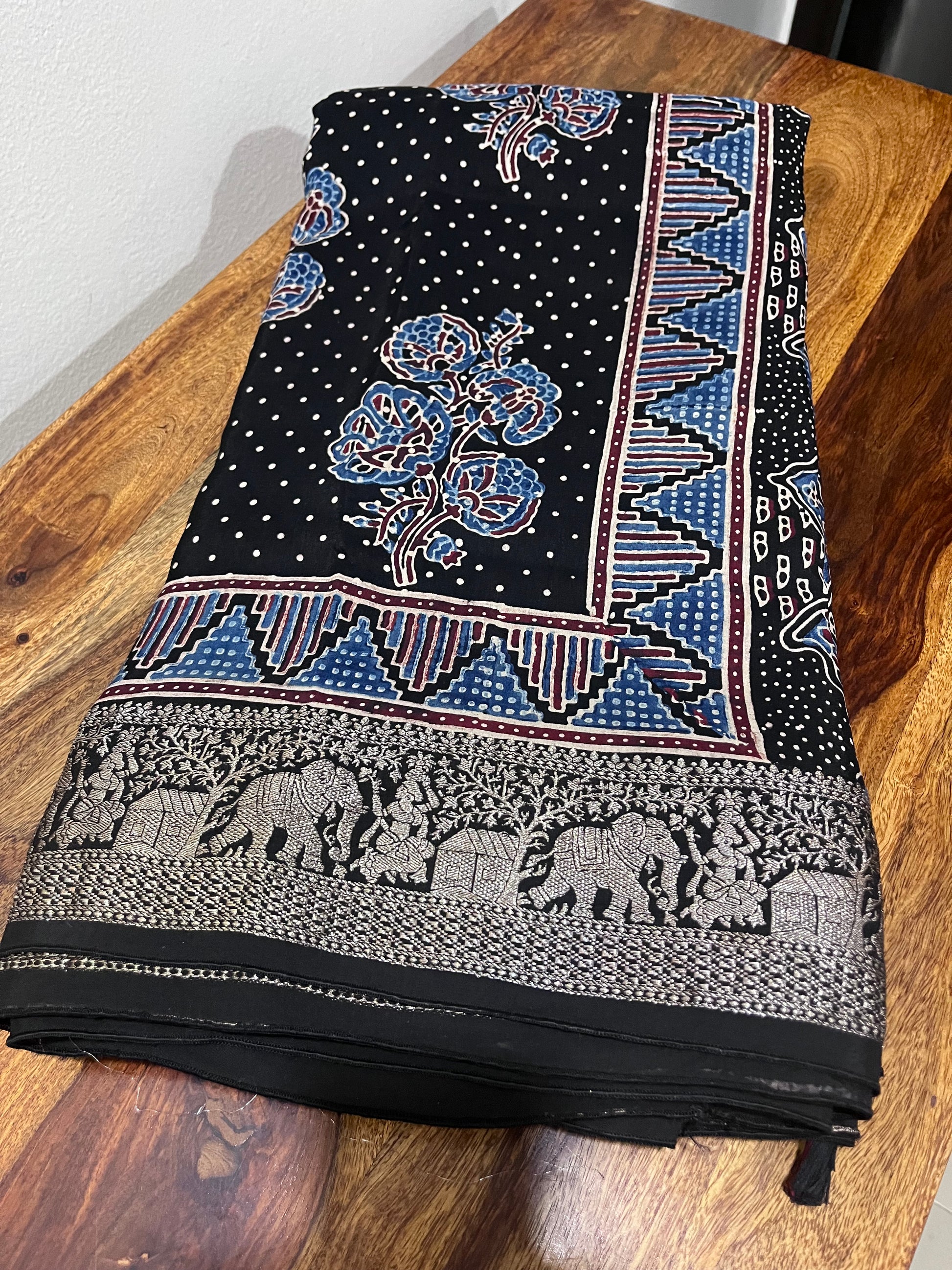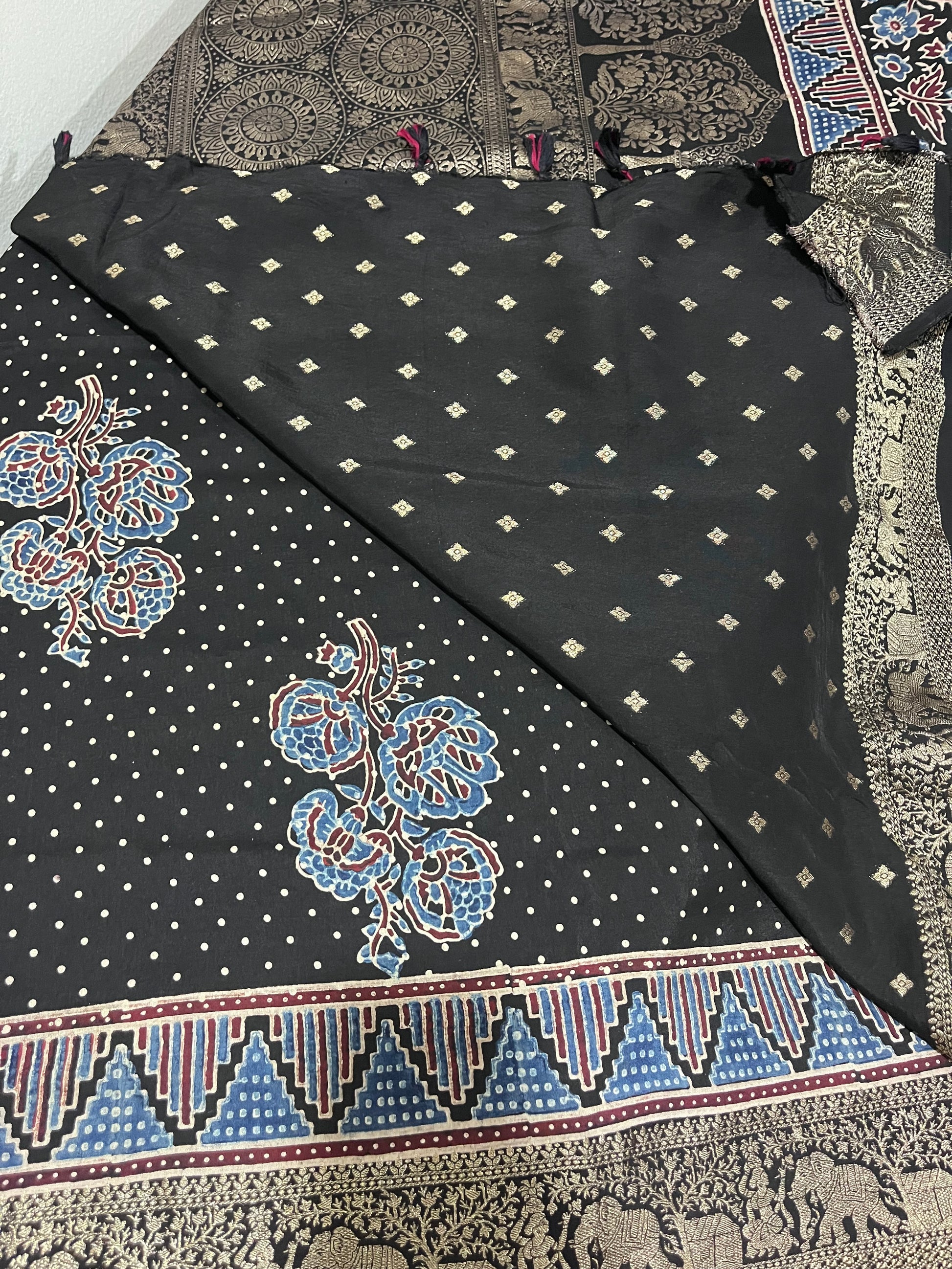 Ajrakh Dola Silk Saree - Black (with tassels)