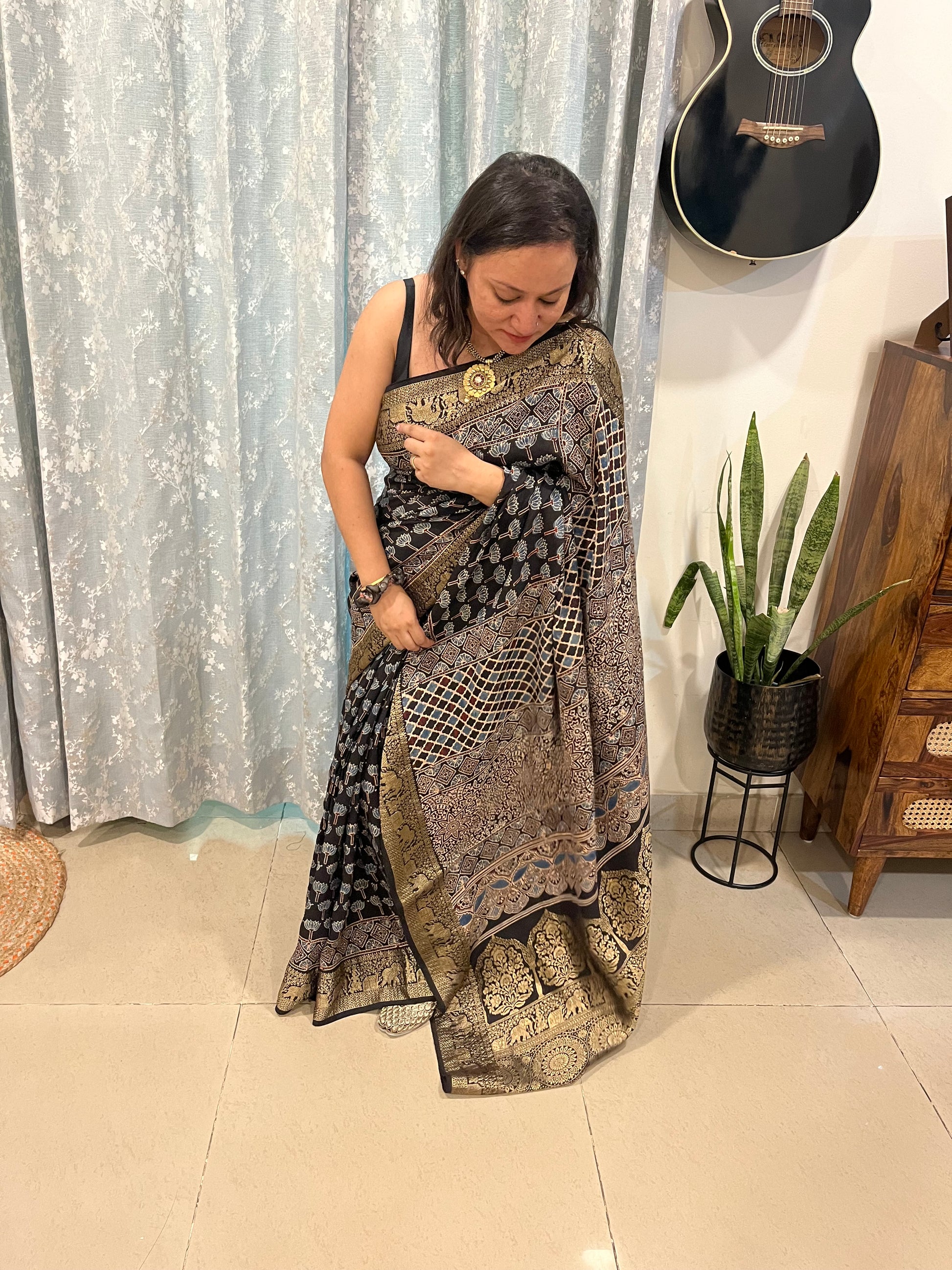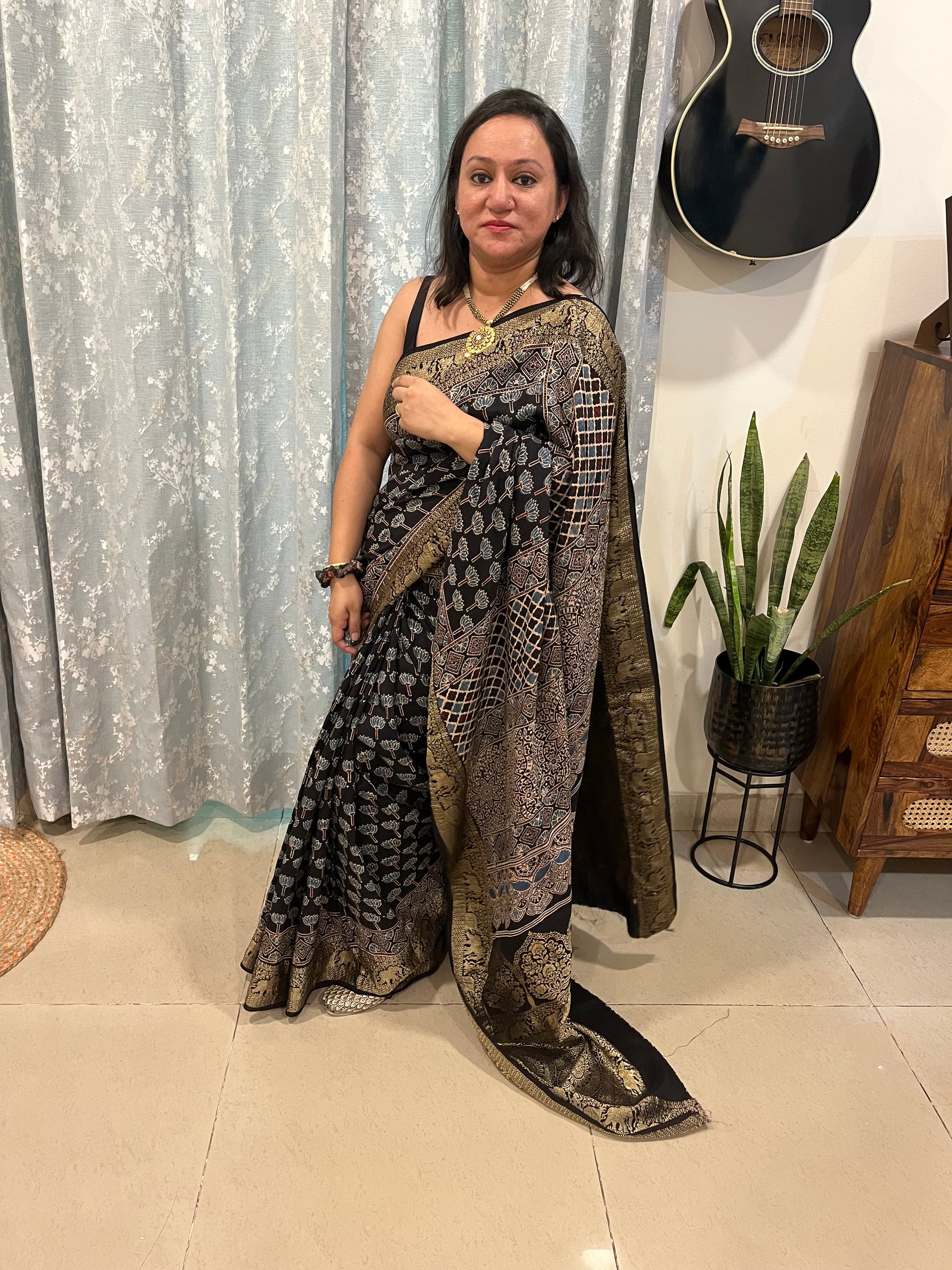 Ajrakh Dola Silk Saree - Black Lotus Print