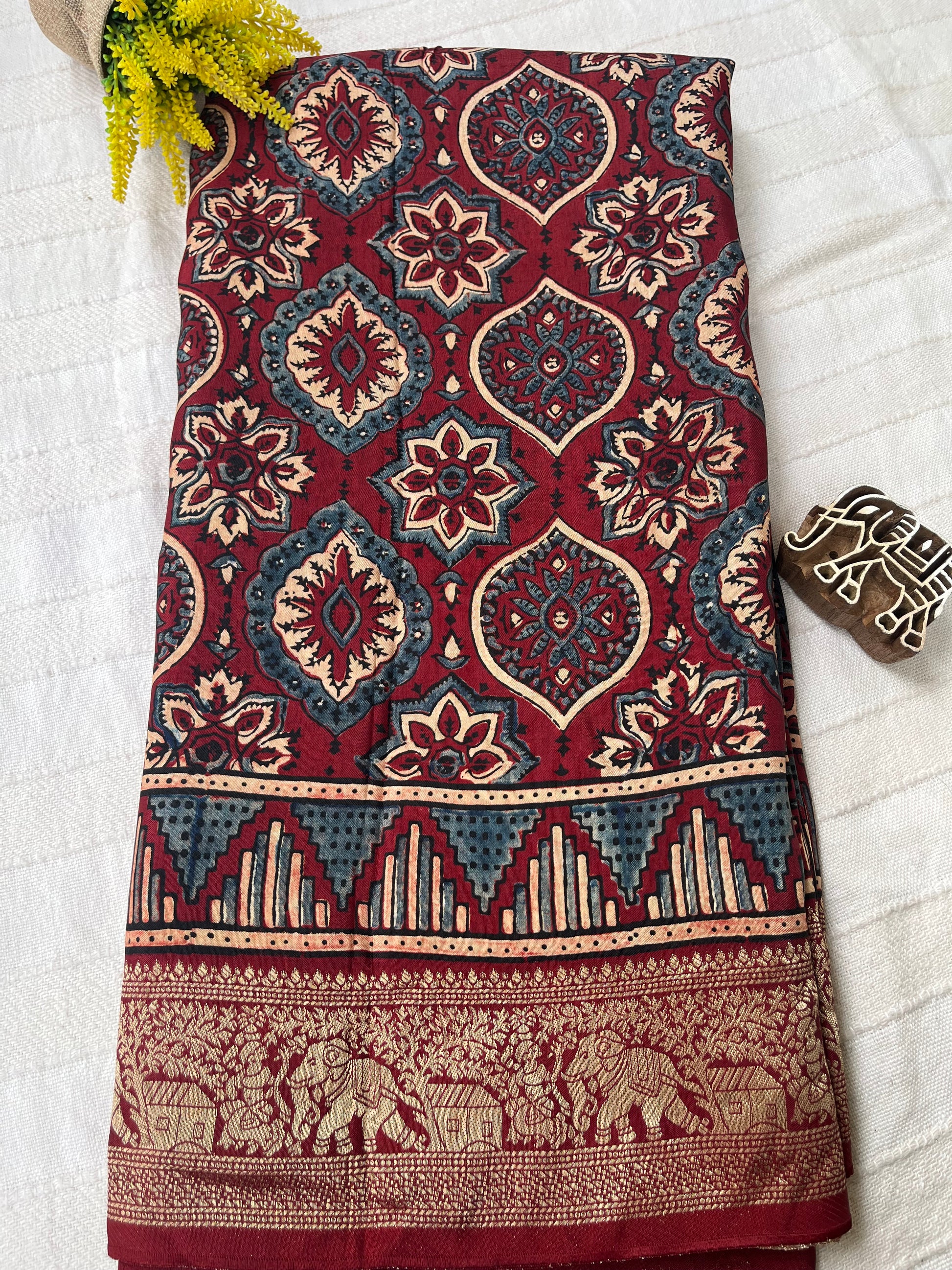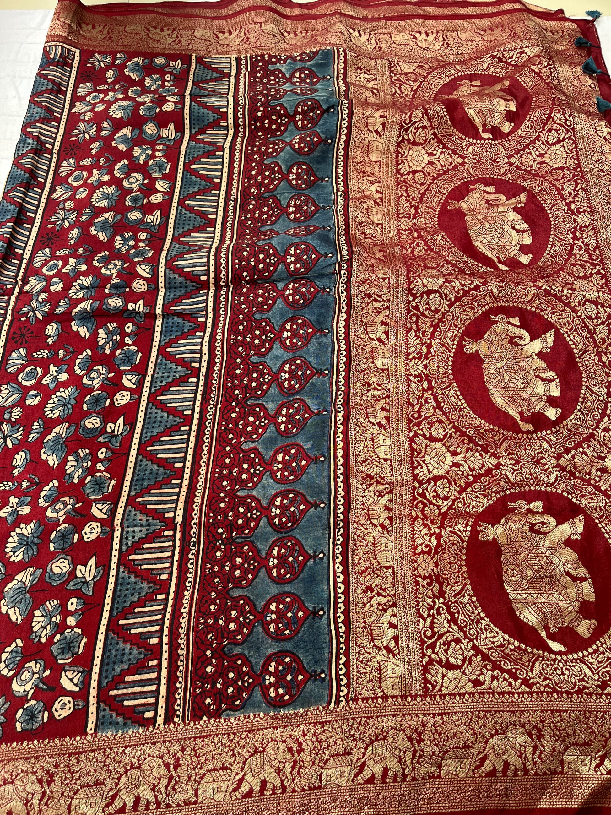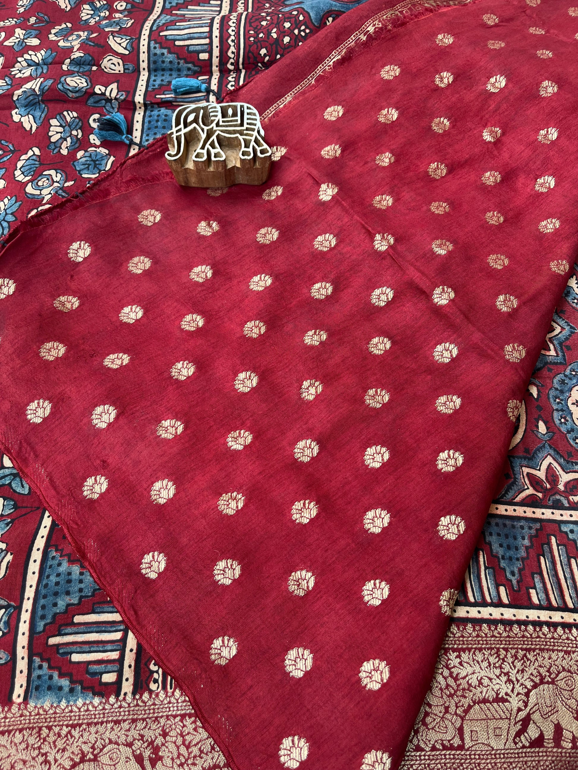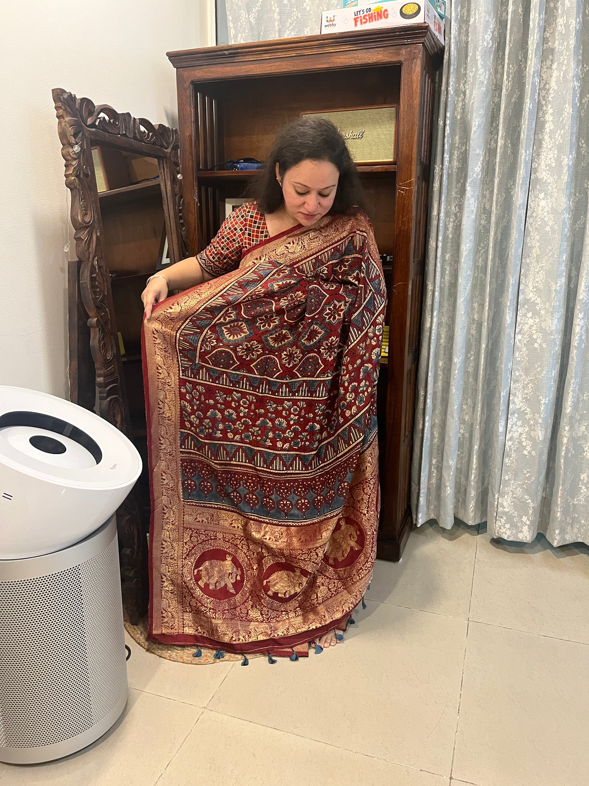 Ajrakh Dola Silk Saree - Deep Red Badam Block (with tassels)