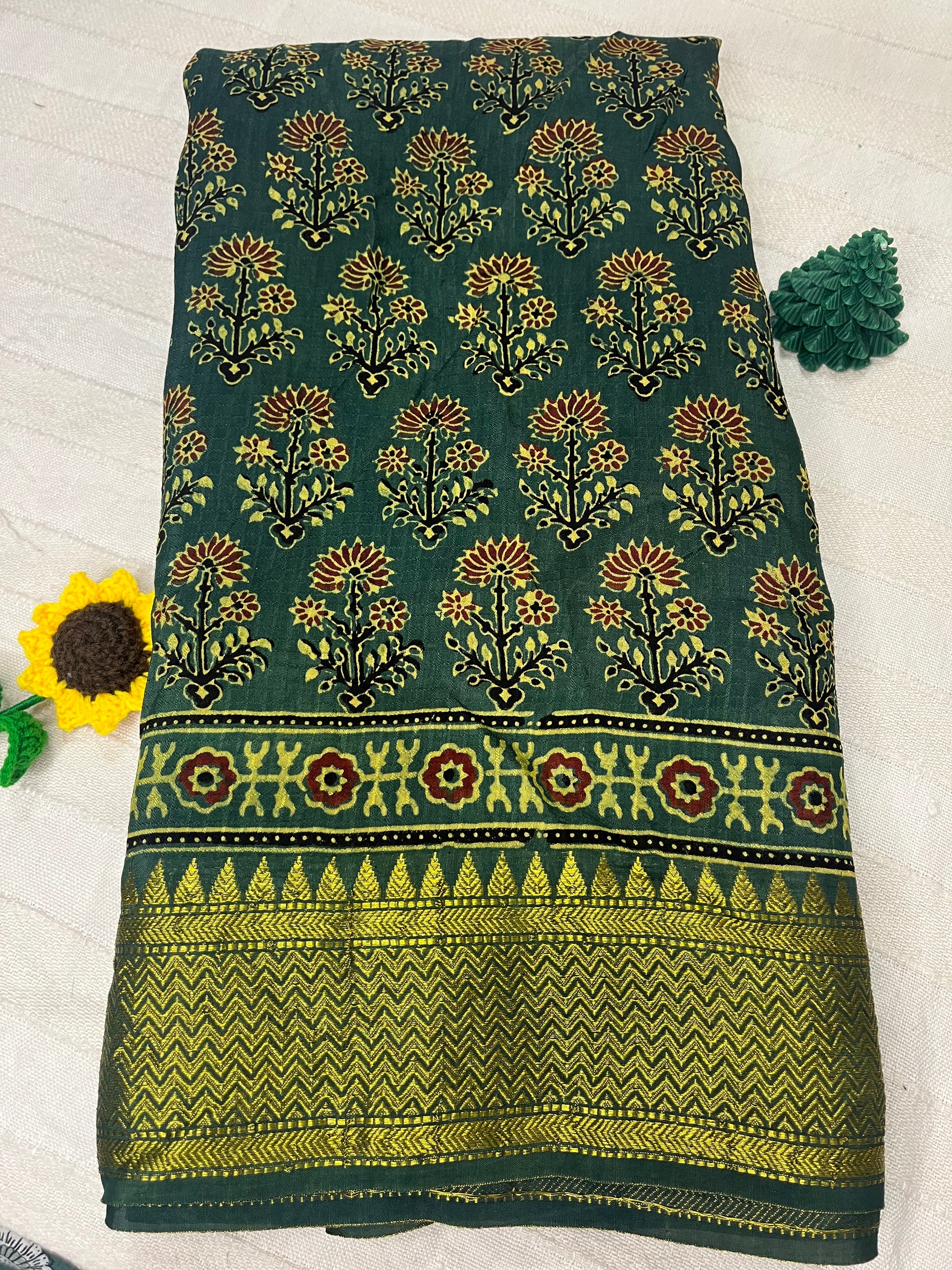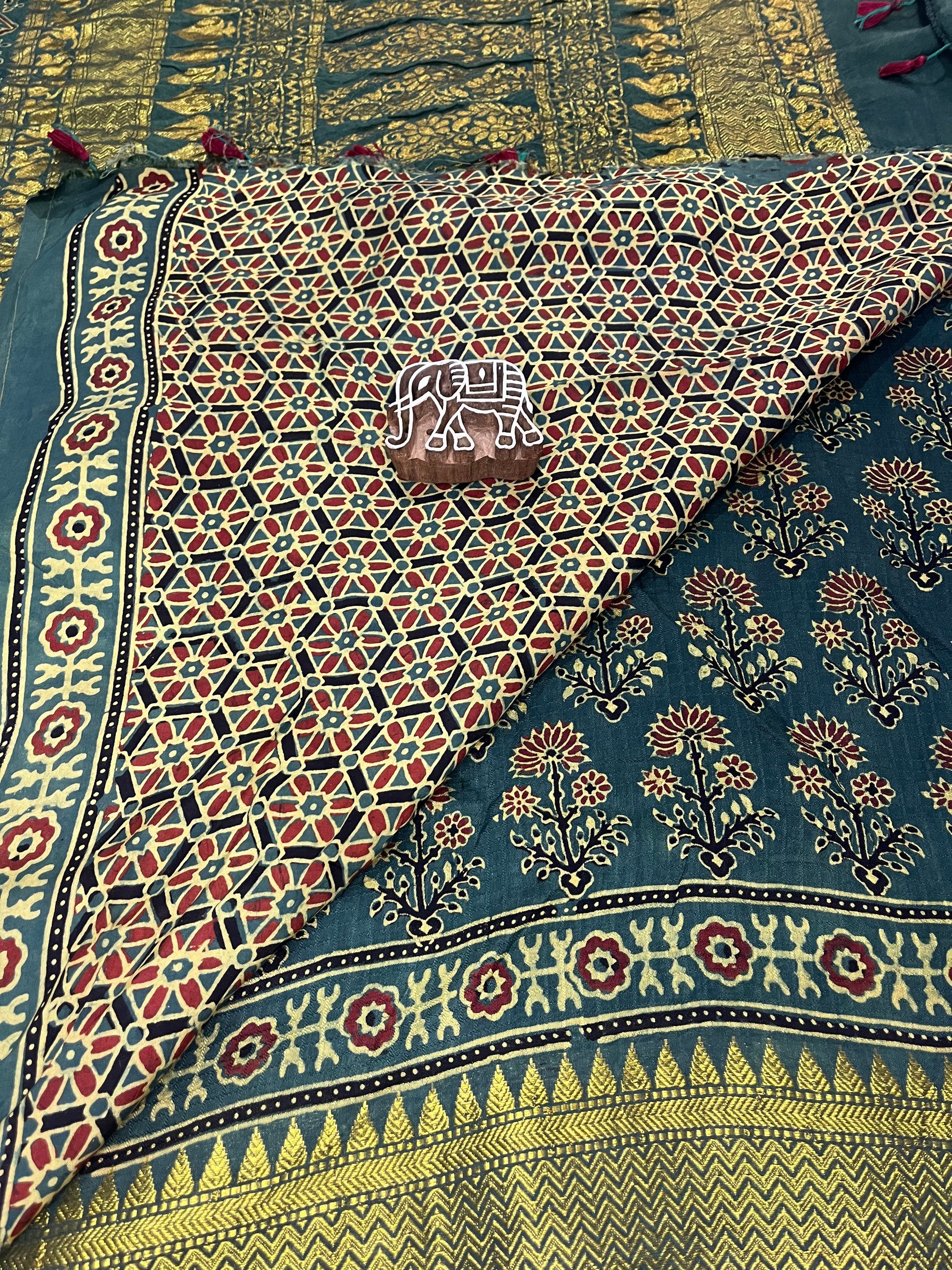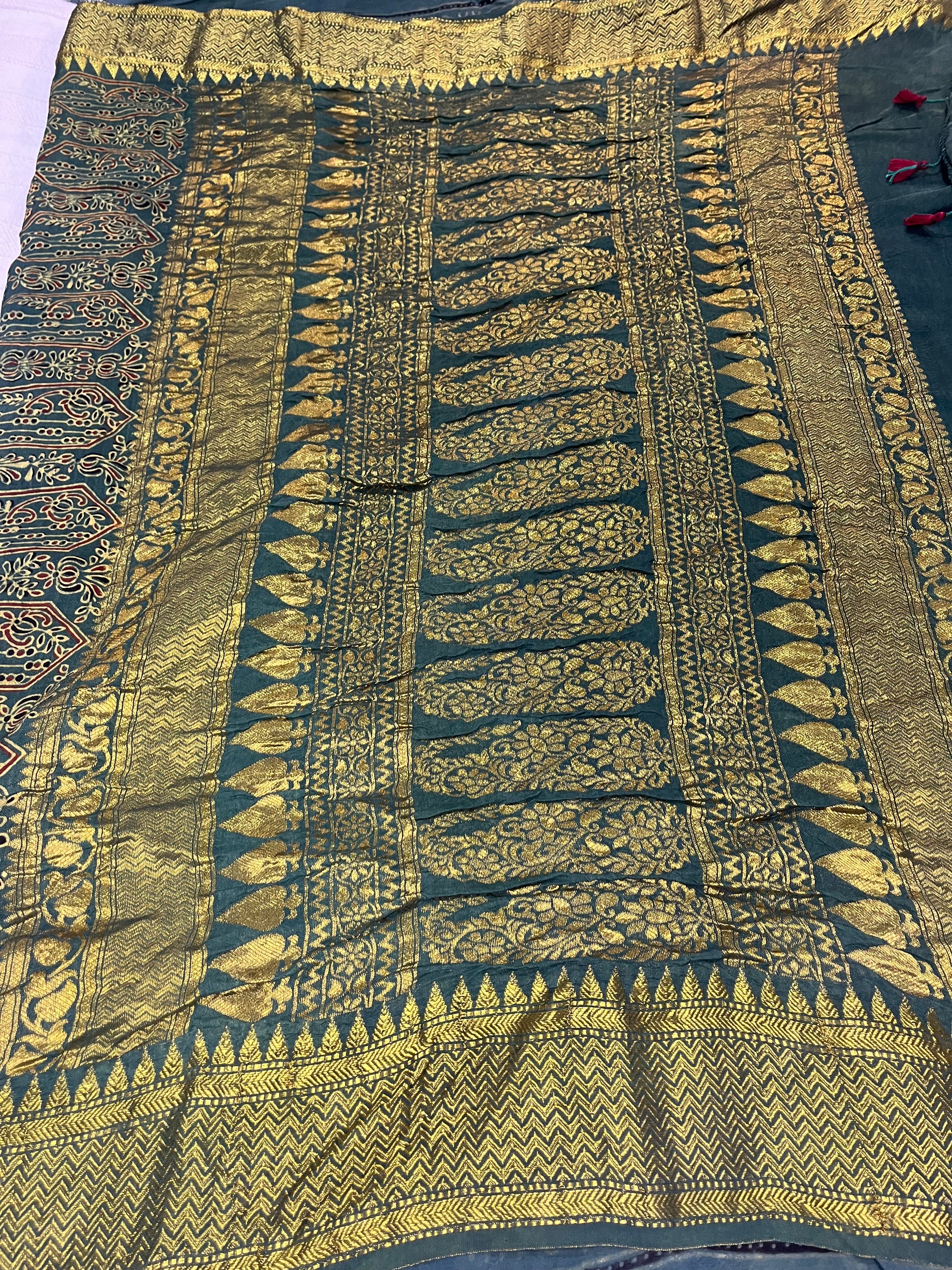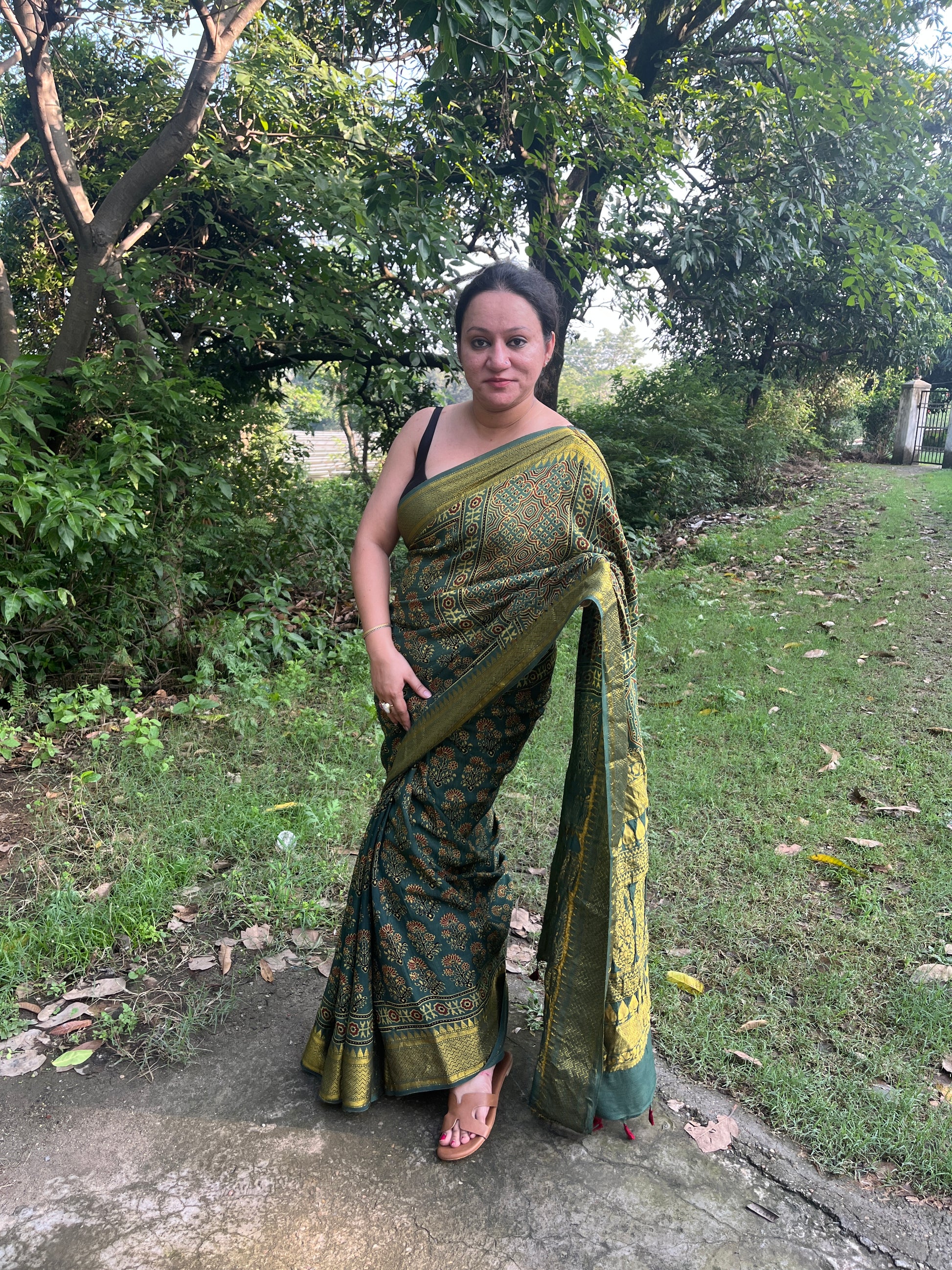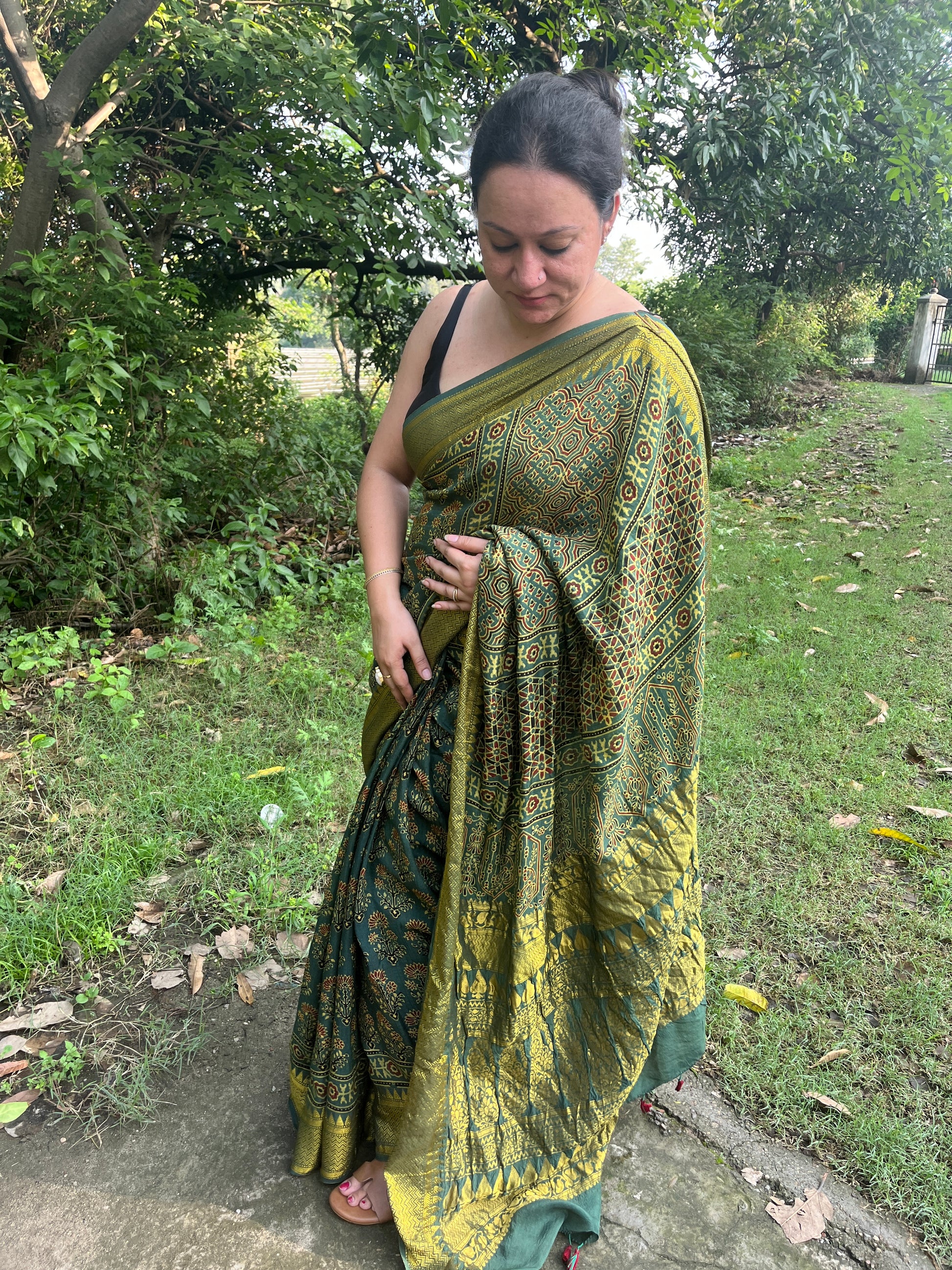 Ajrakh Dola Silk Saree - Green (with tassels)