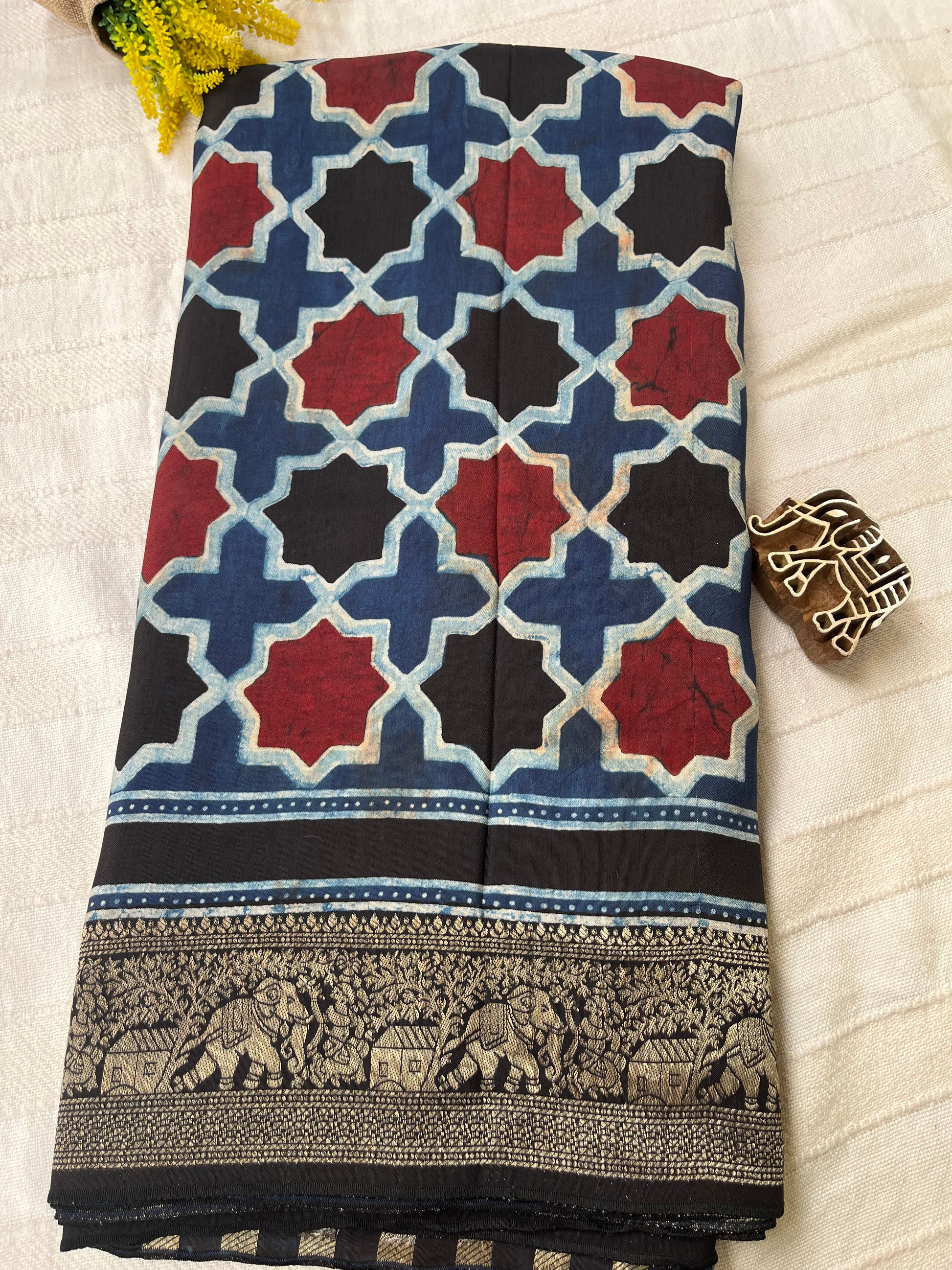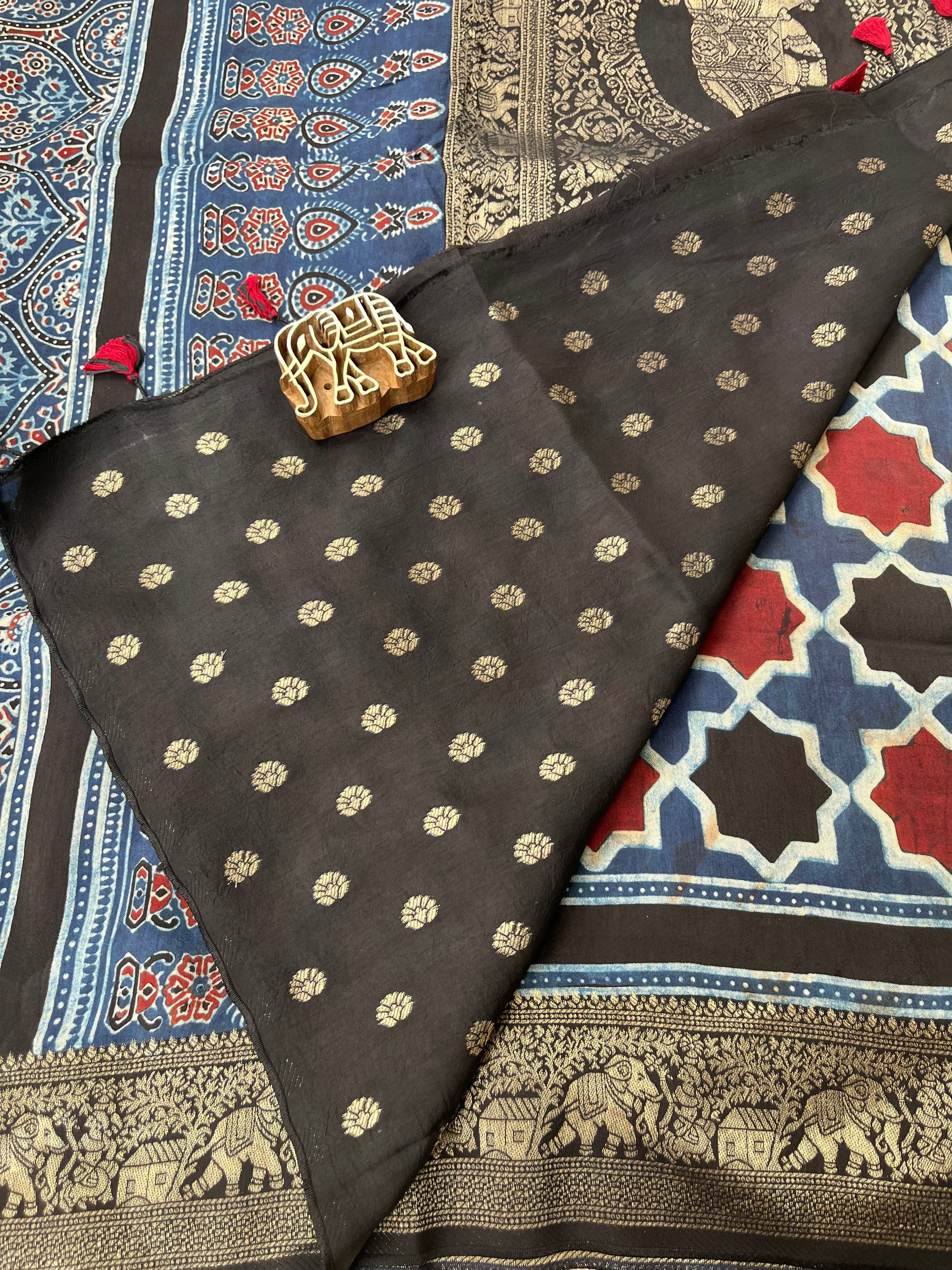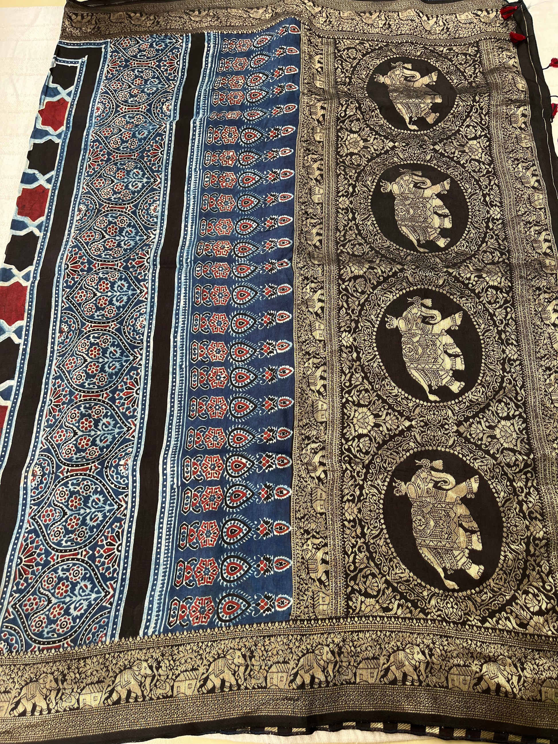 Ajrakh Dola Silk Saree - Indigo Cobra (with tassels)