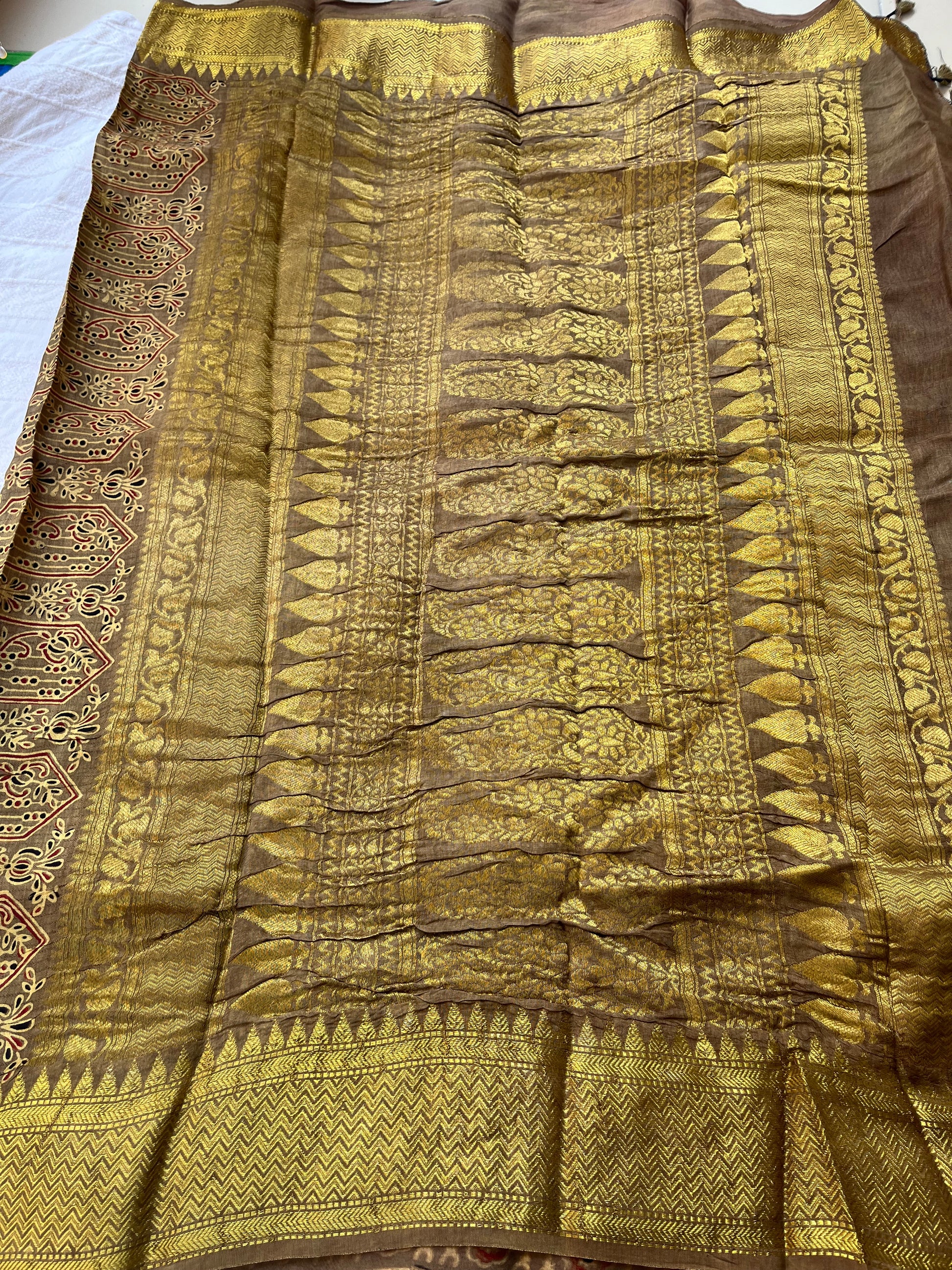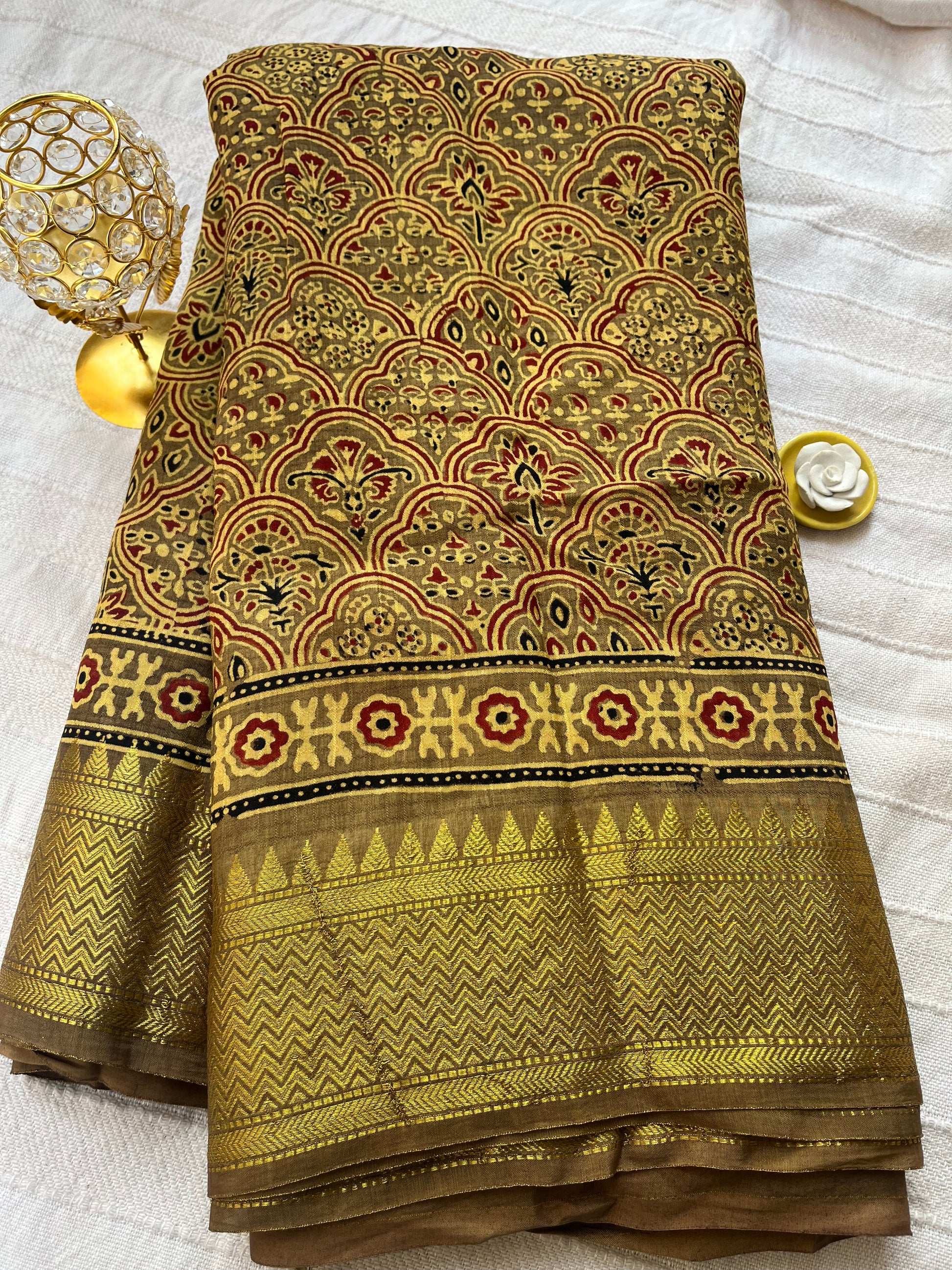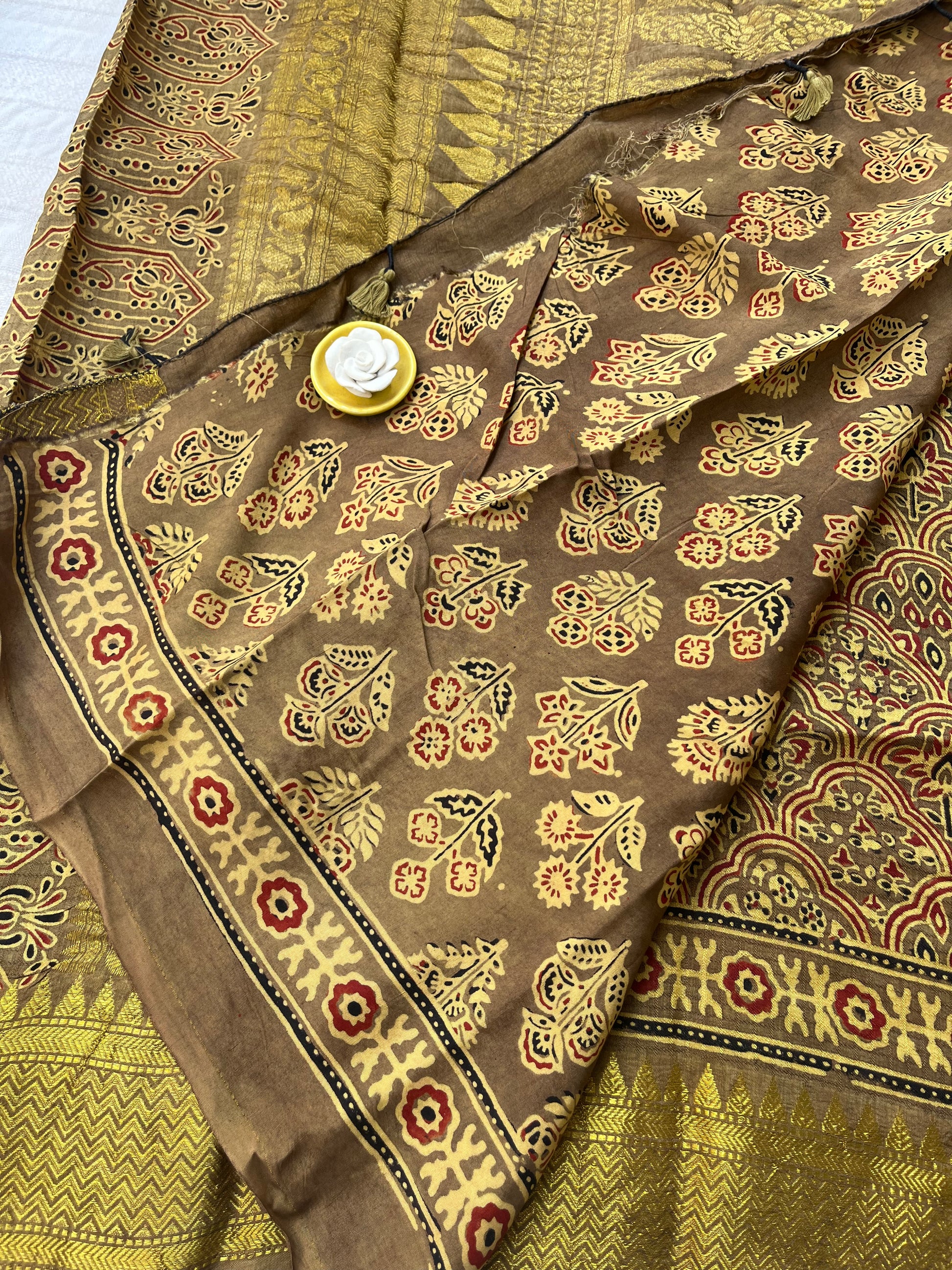 Ajrakh Dola Silk Saree - Mustard Gold (with tassels)