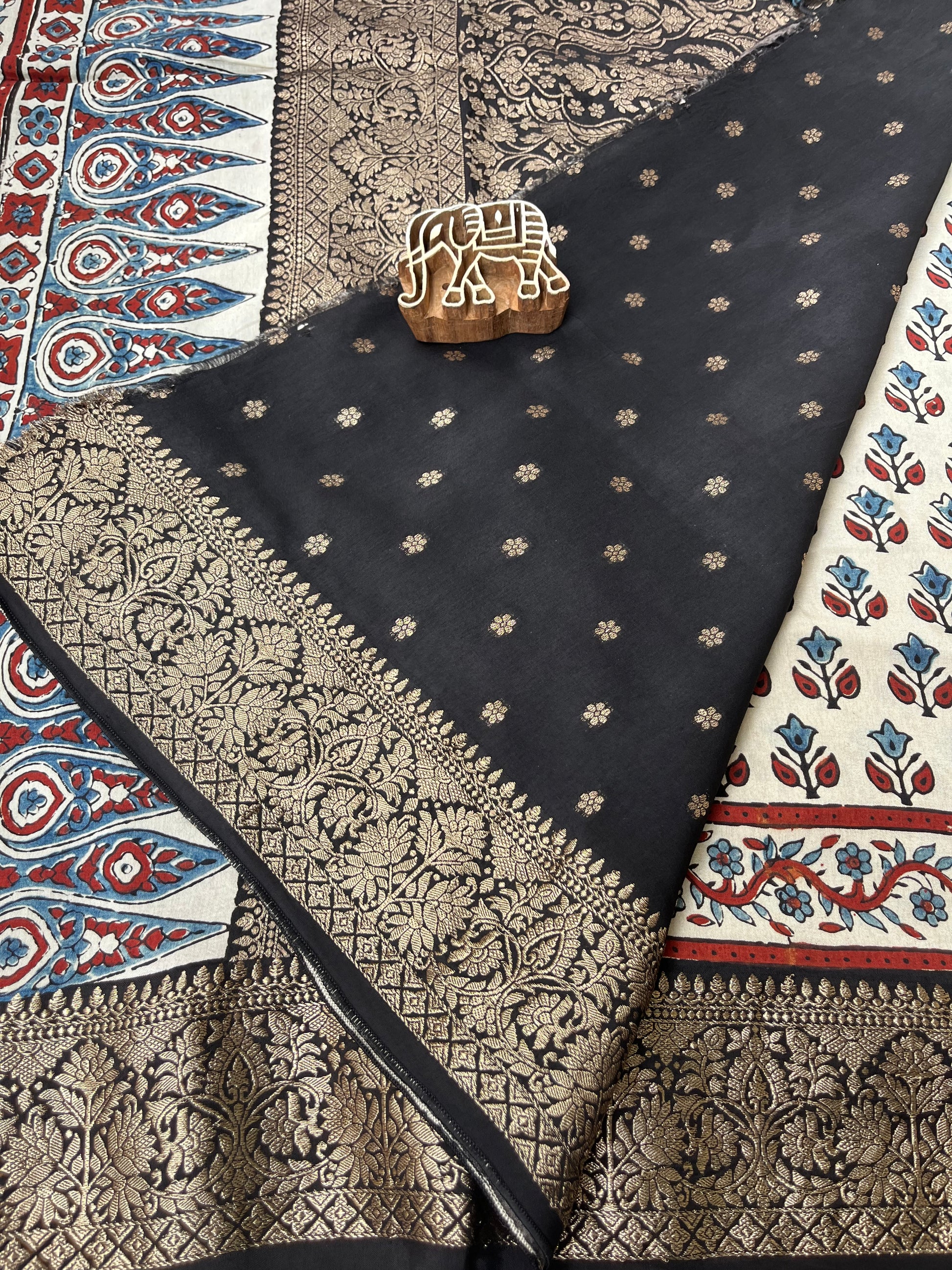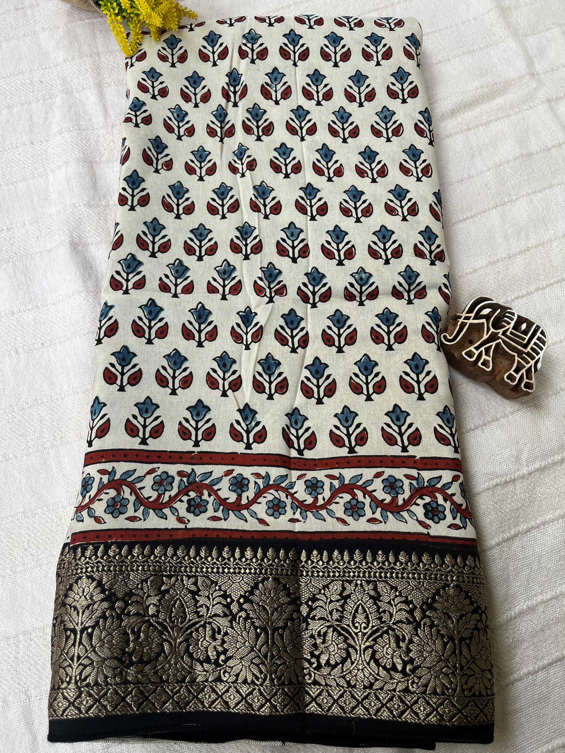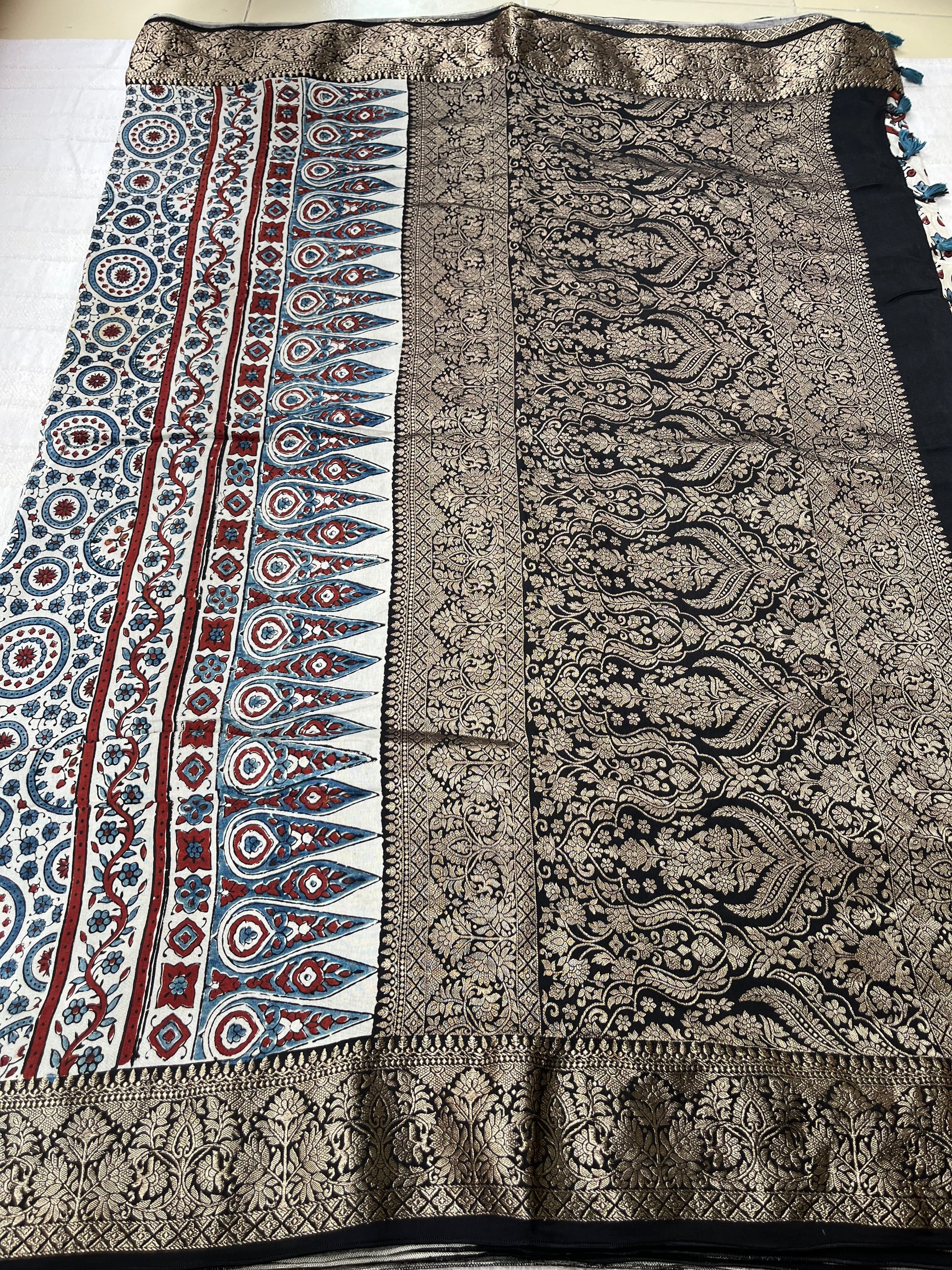 Ajrakh Dola Silk Saree - Pearl White Buttis (with tassels)