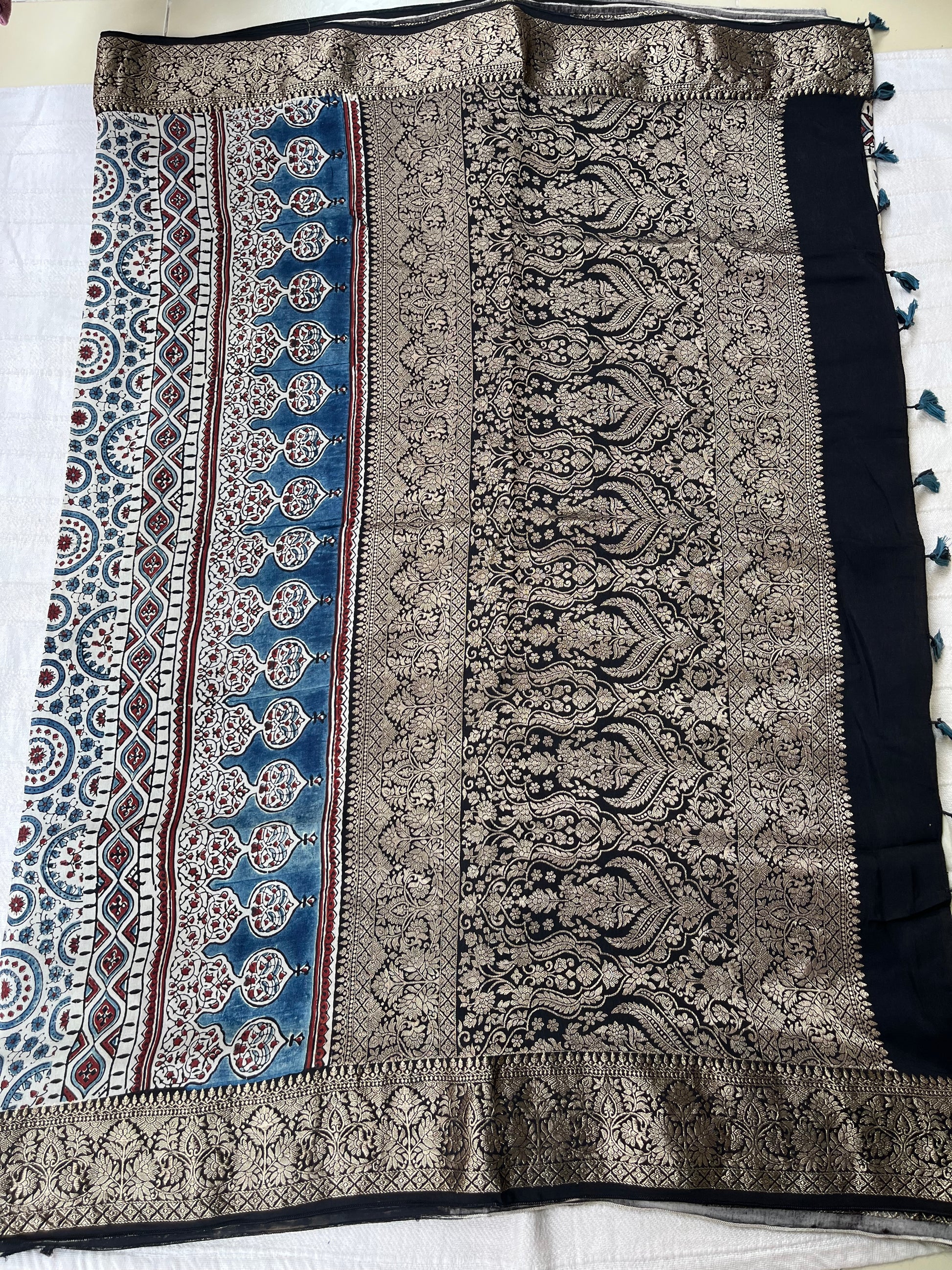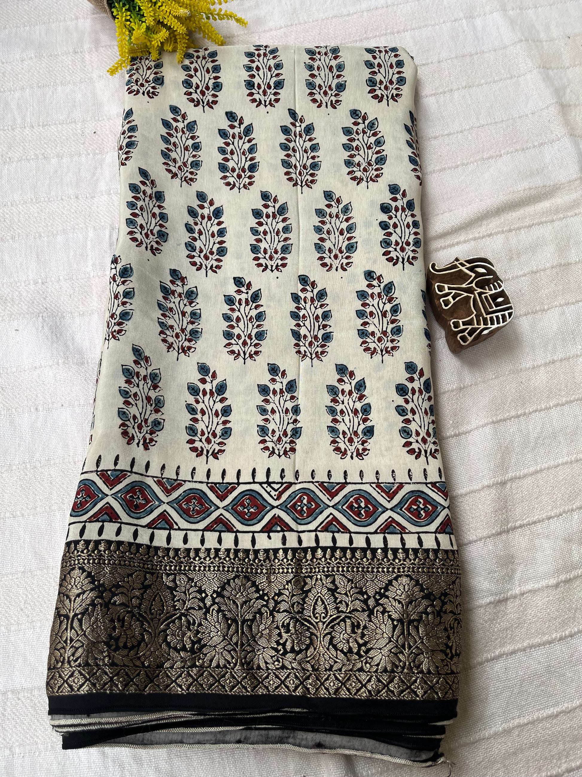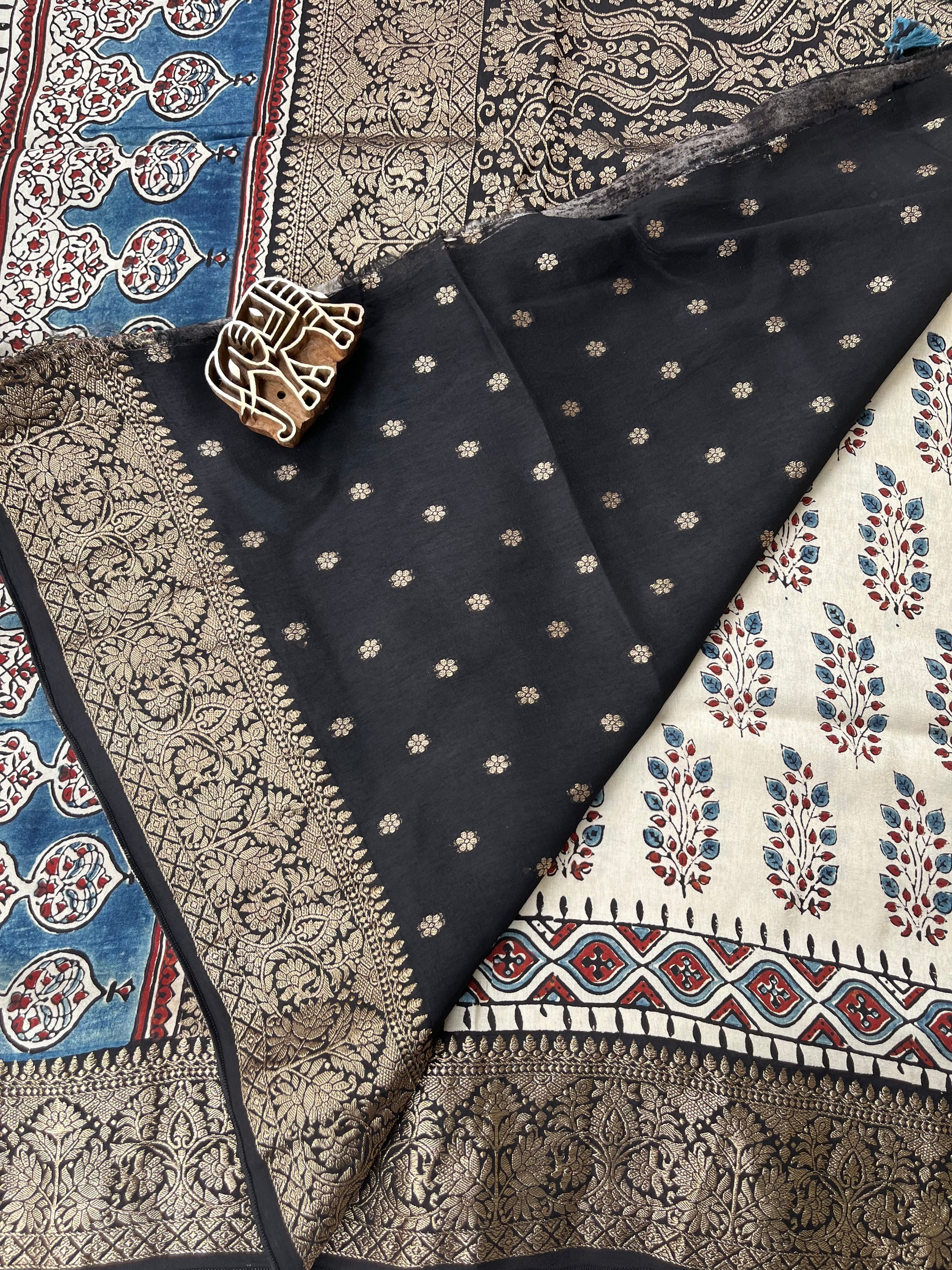 Ajrakh Dola Silk Saree - Pearl White (with tassels)