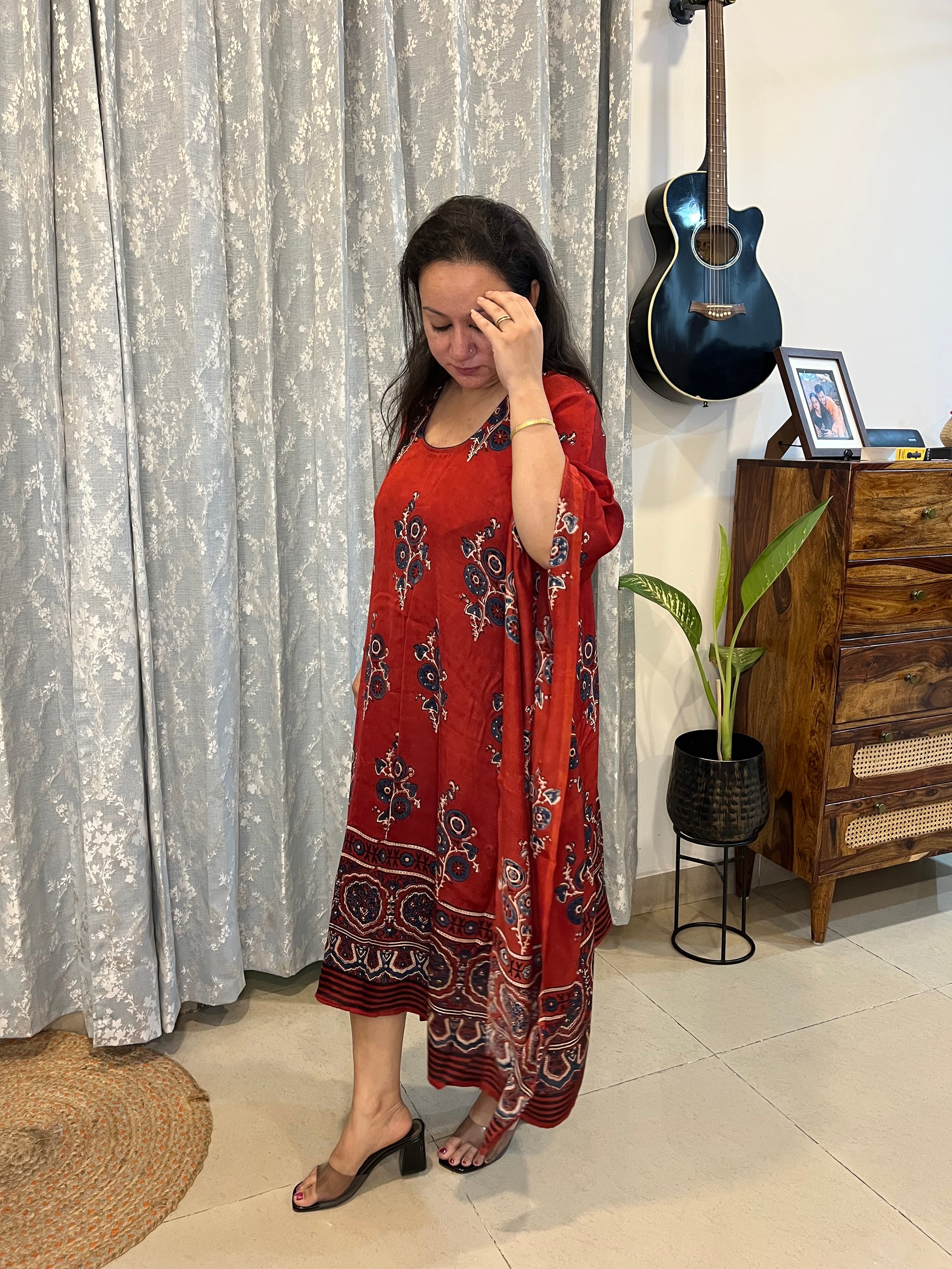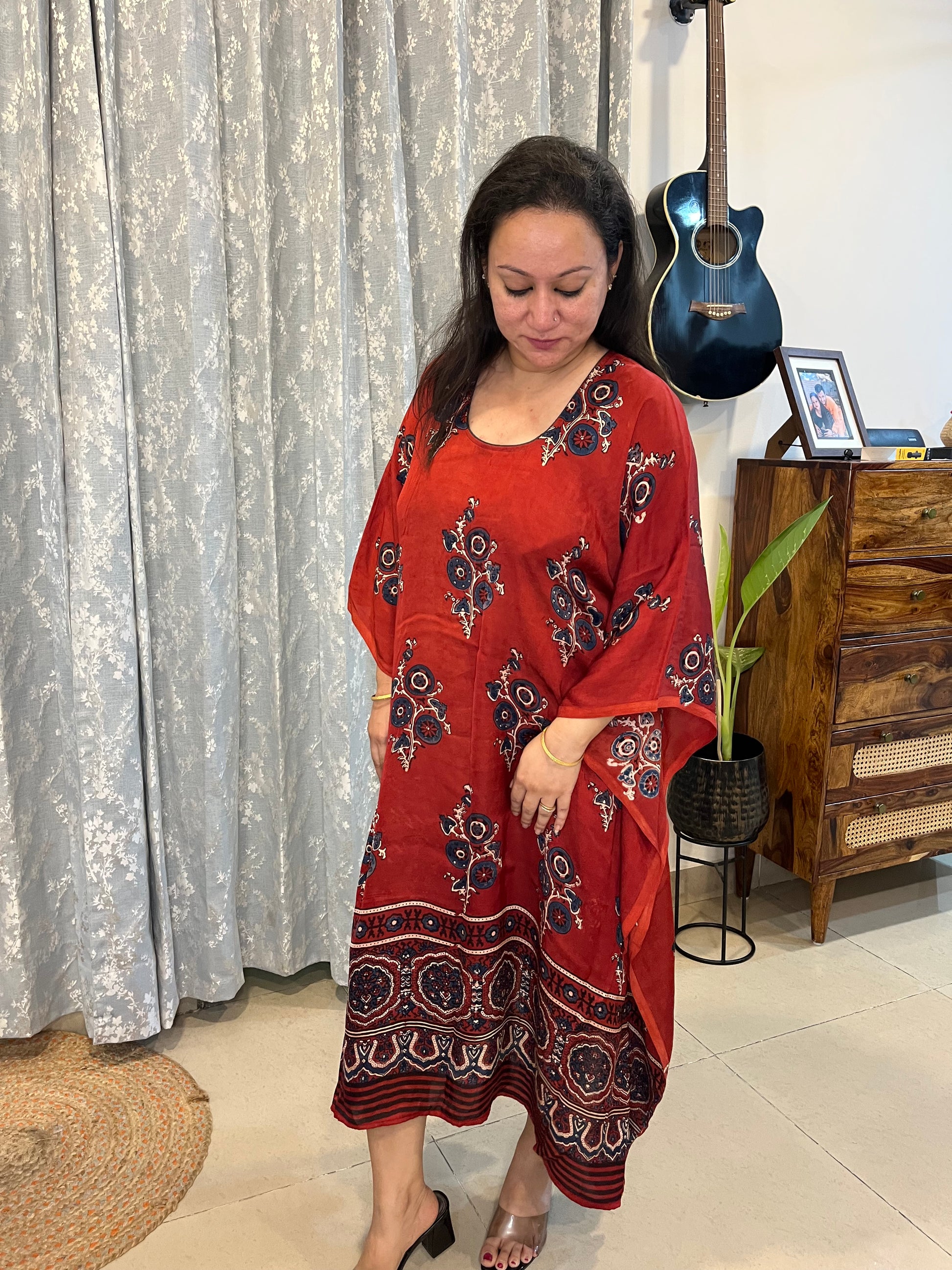 Effortlessly elegant and incredibly comfortable, our customisable handblock ajrakh modal silk Kaftans are a beautiful blend of tradition and ease.