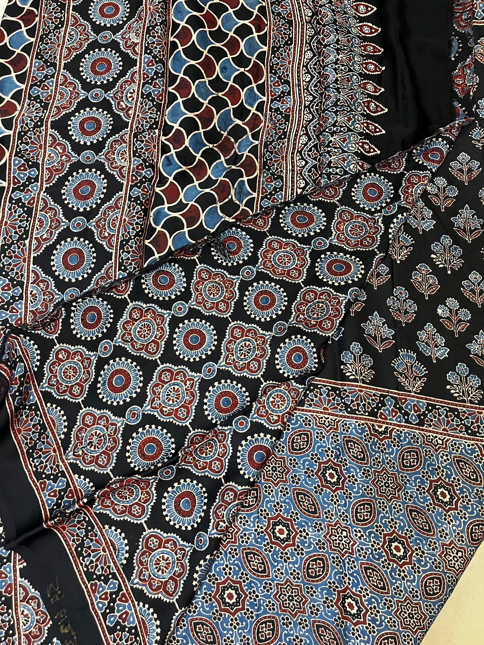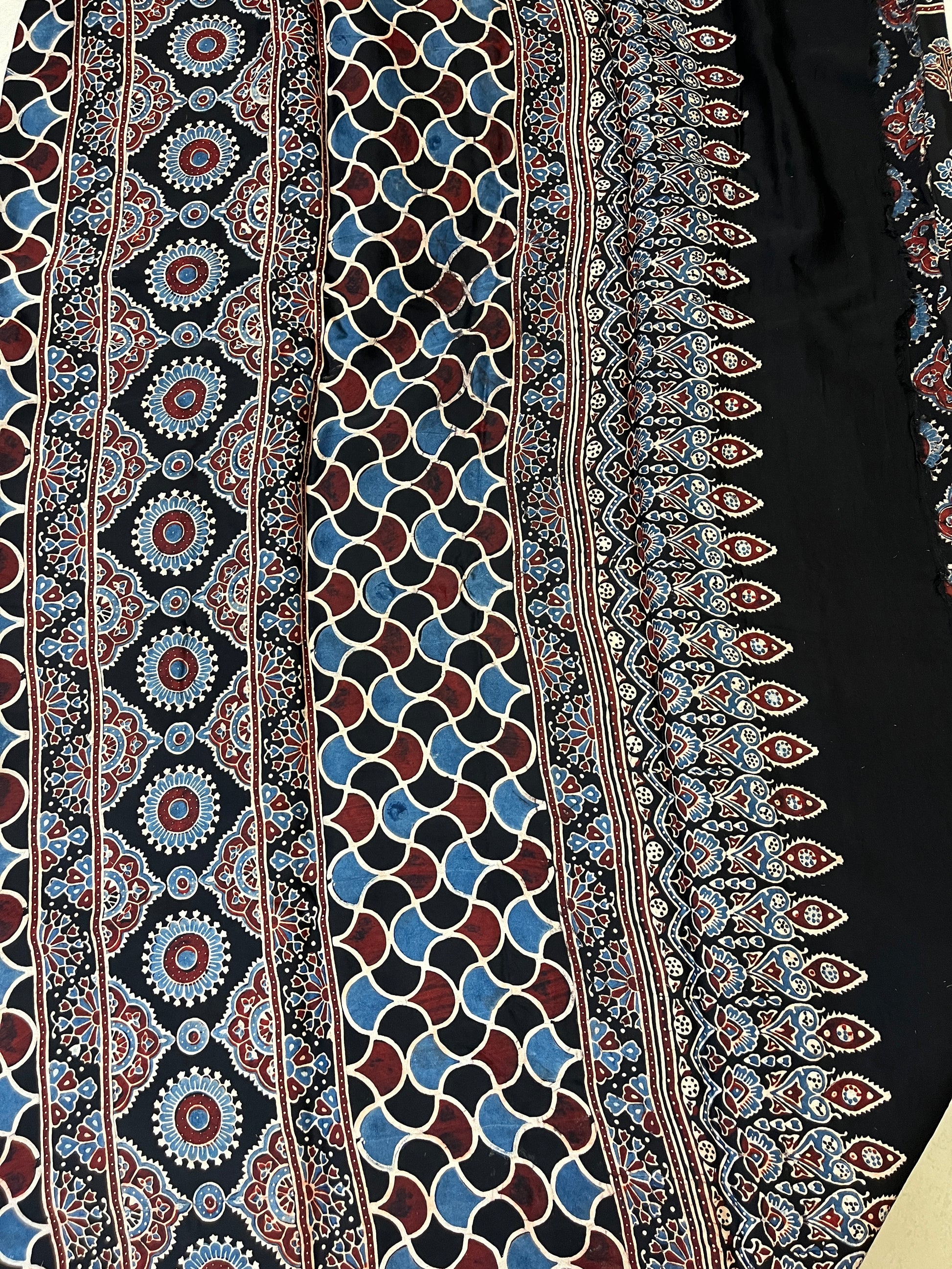 Ajrakh Modal Silk Saree - Black Flower Motifs