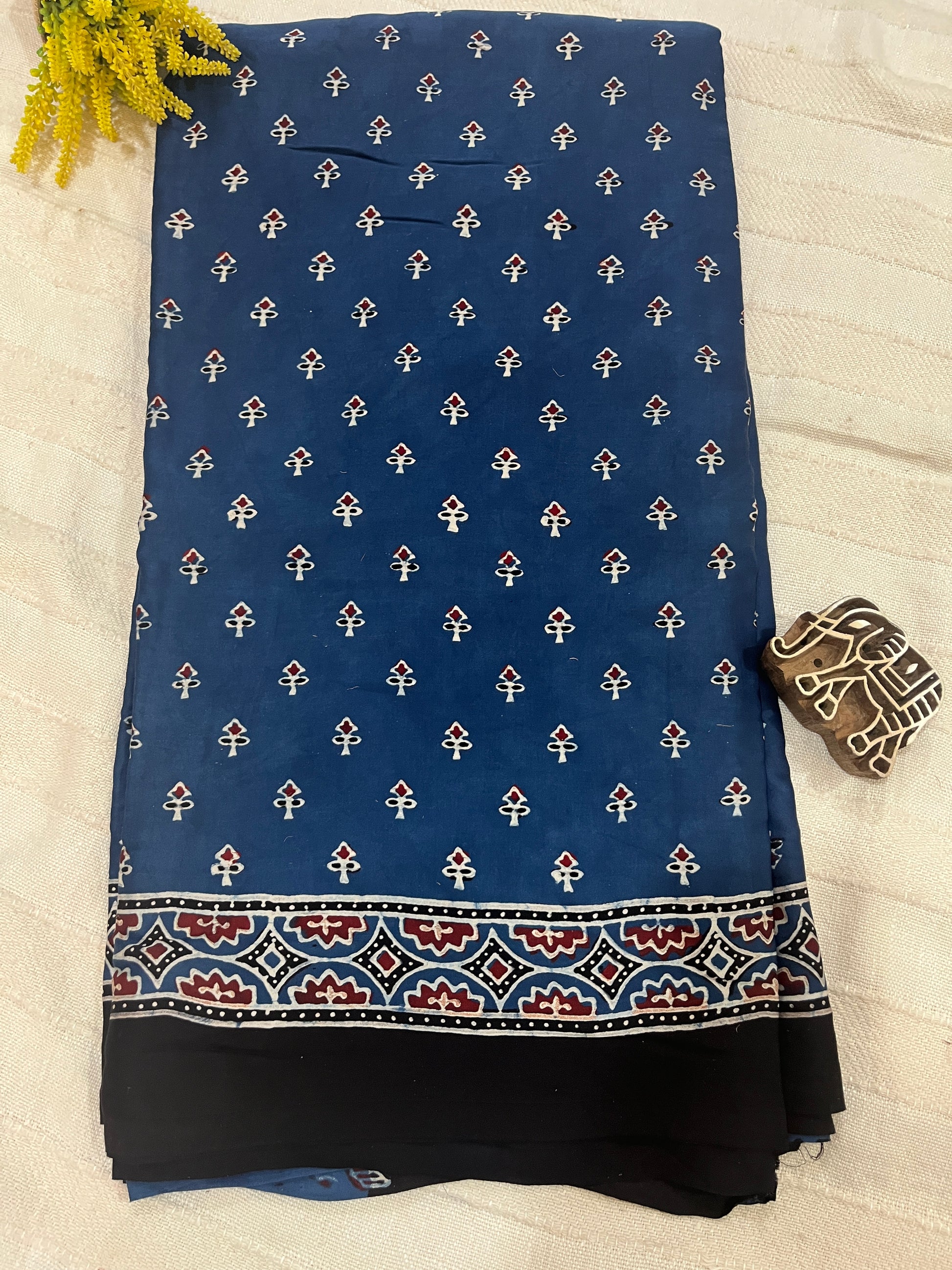 Ajrakh Modal Silk Saree - Indigo Small Buttis