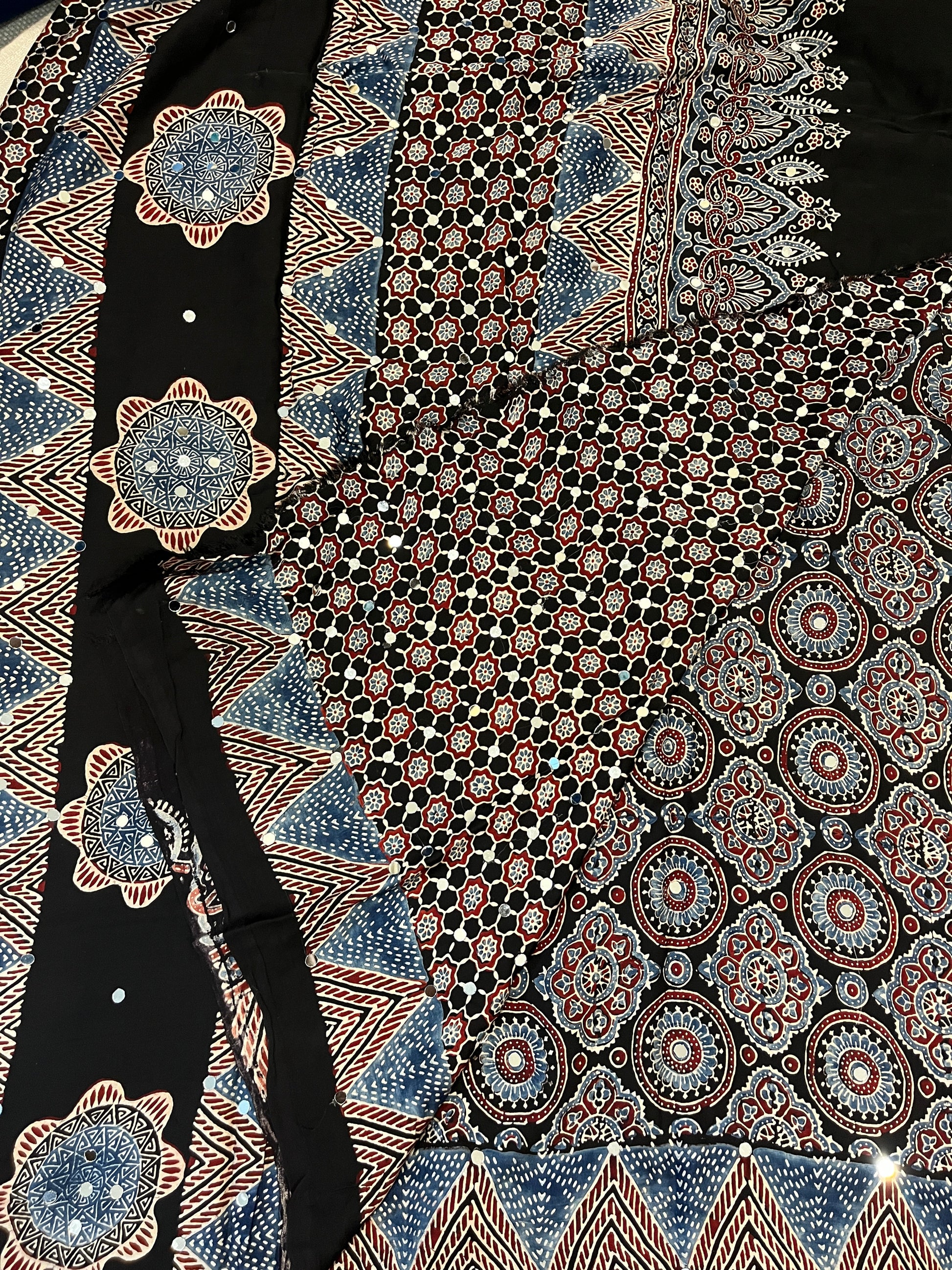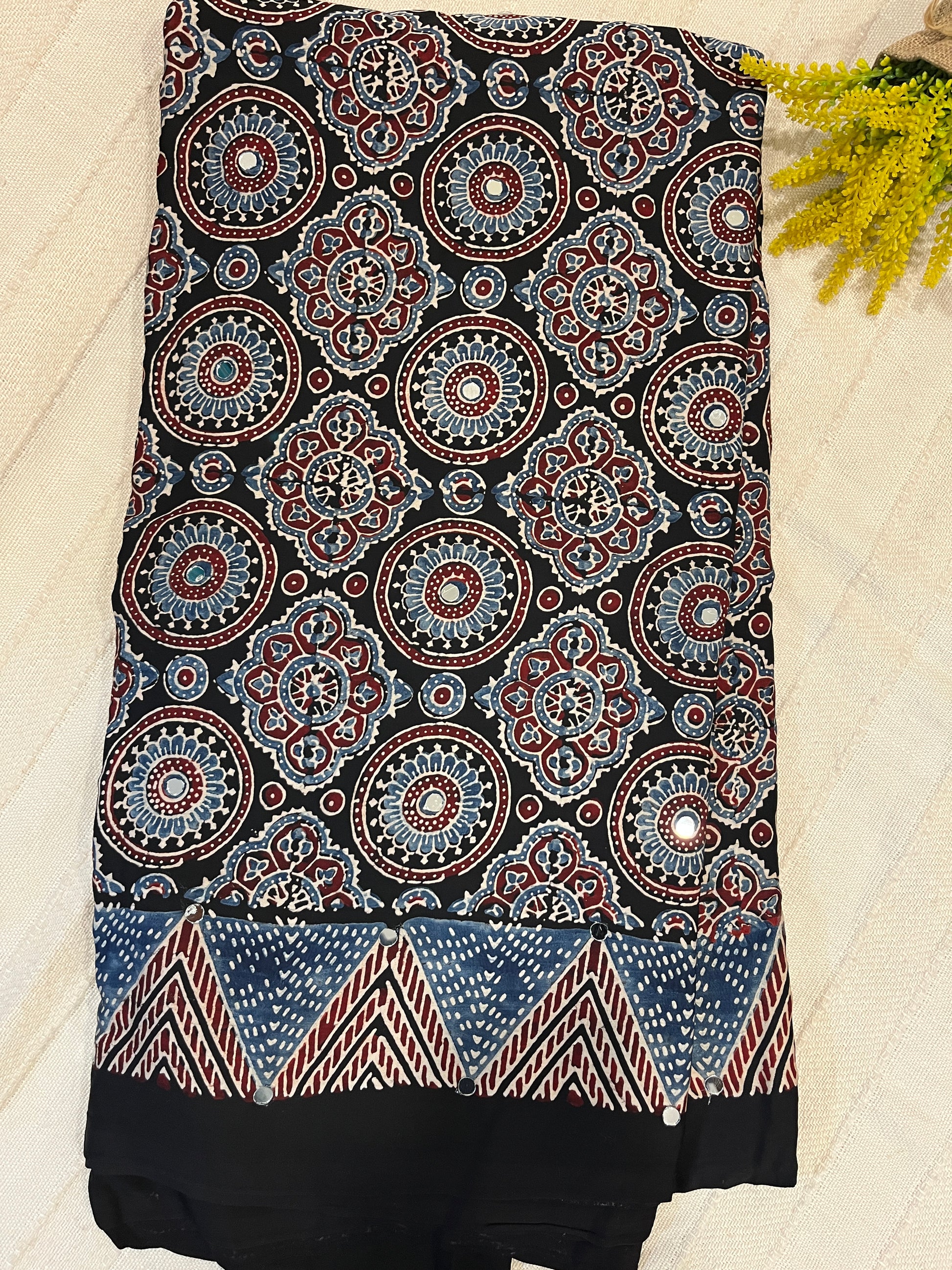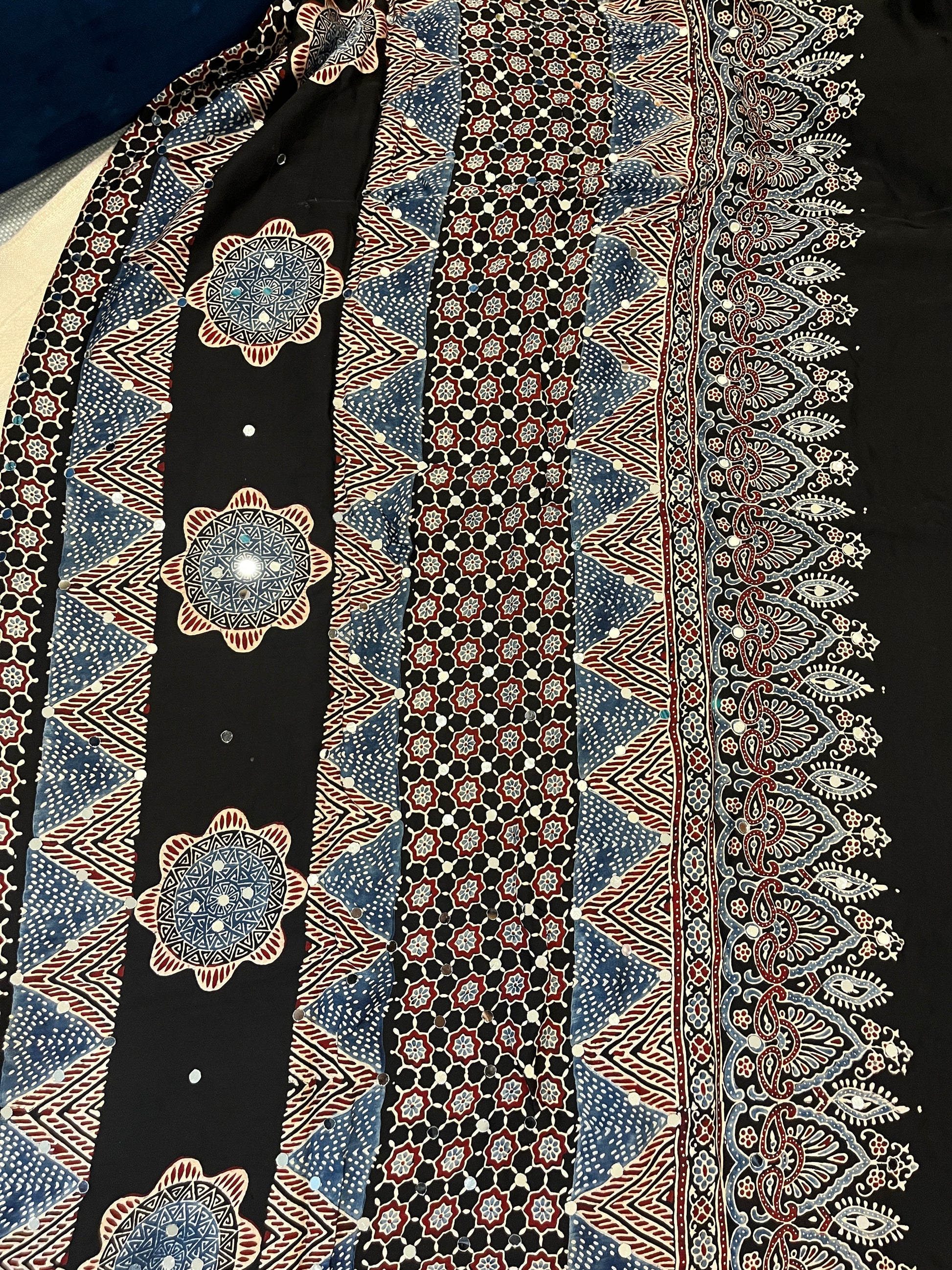 Ajrakh Modal Silk Saree with Mirror Work - Black