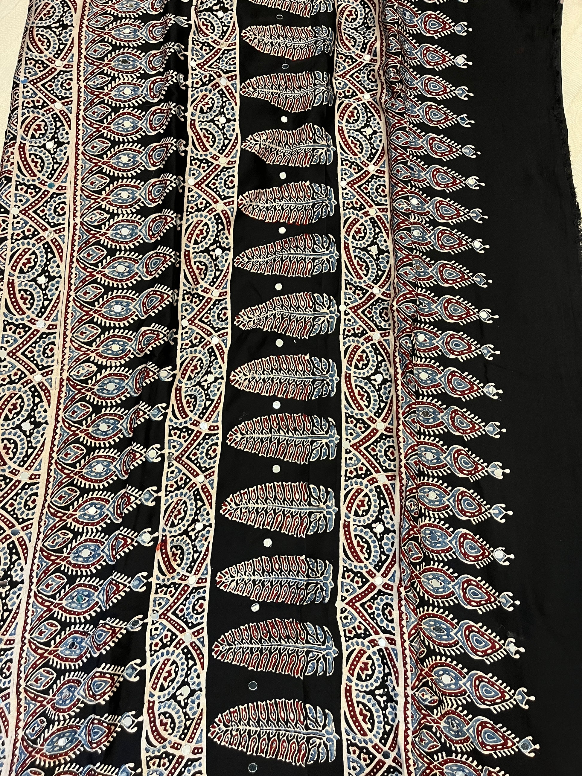 Ajrakh Modal Silk Saree with Mirror Work - Black Half & Half