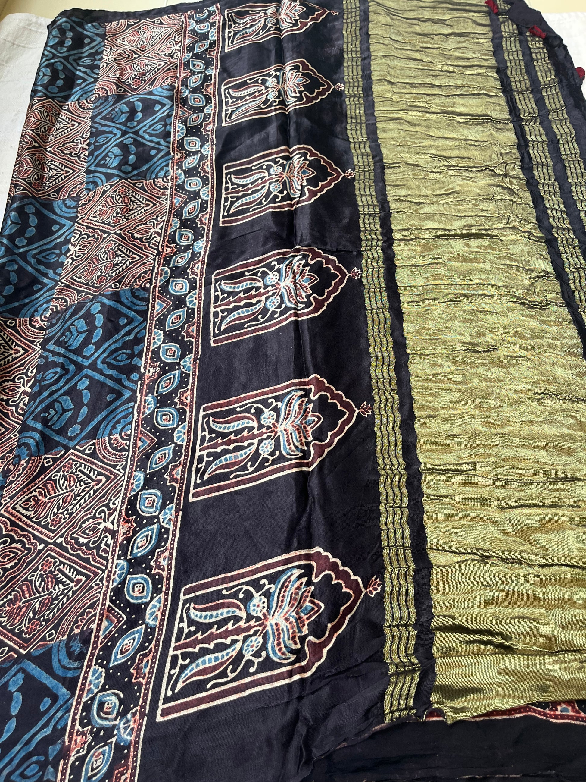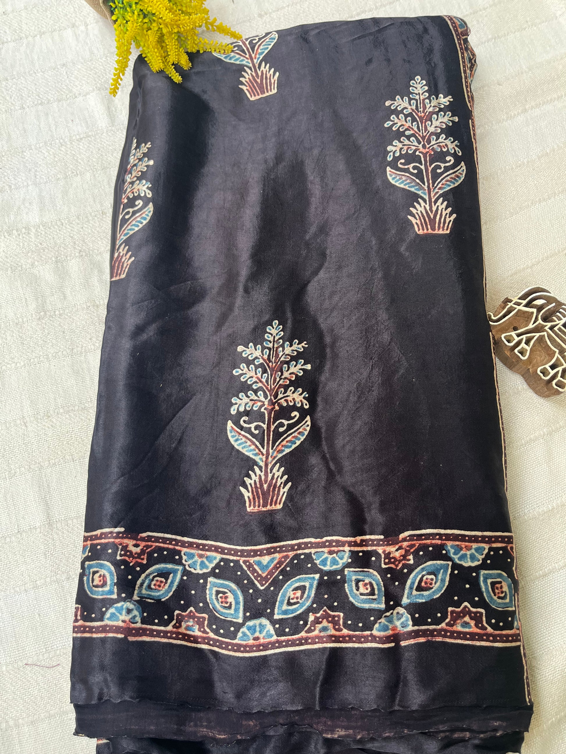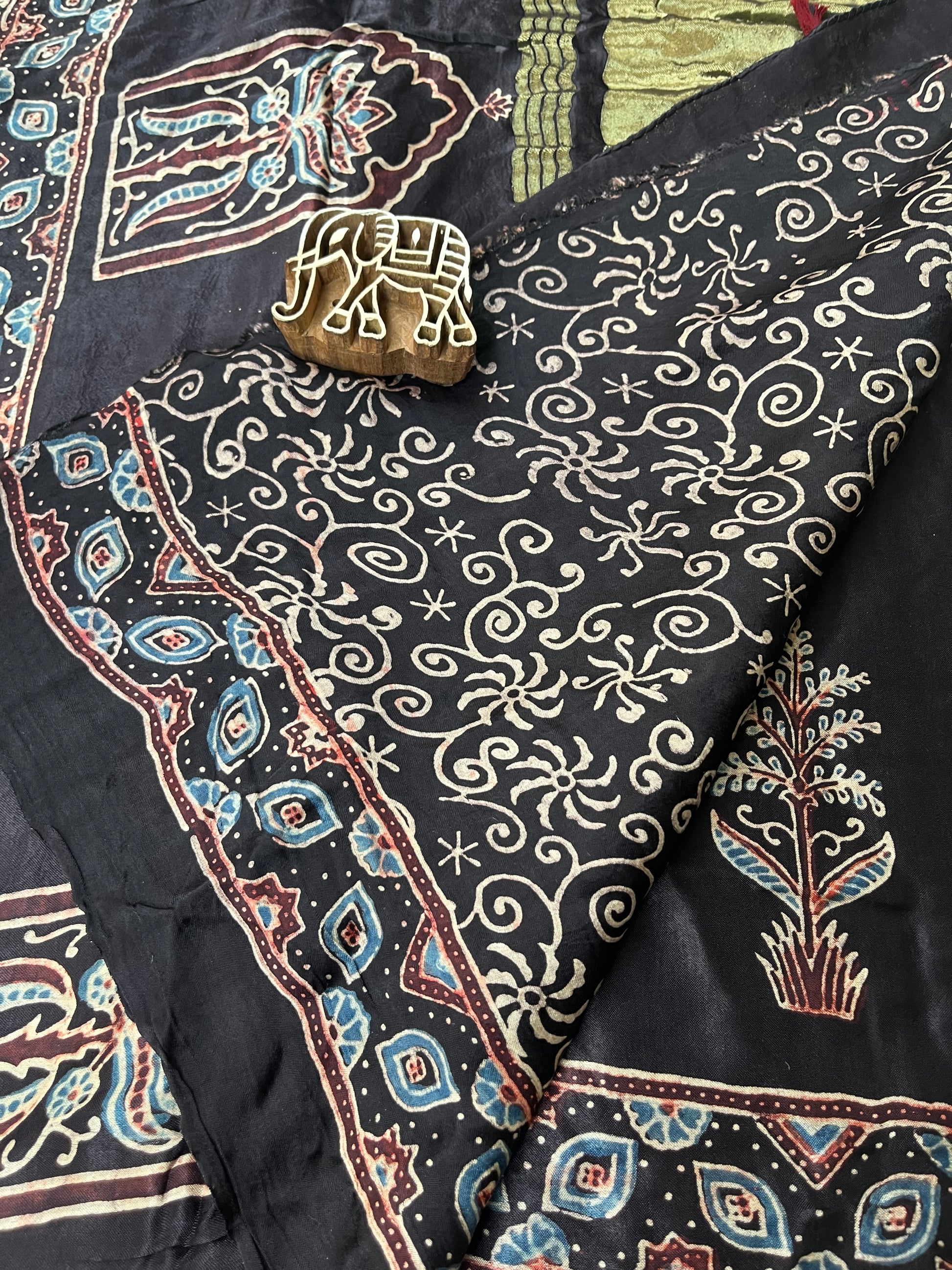 Ajrakh Modal Silk Saree with Tissue Palla - Black