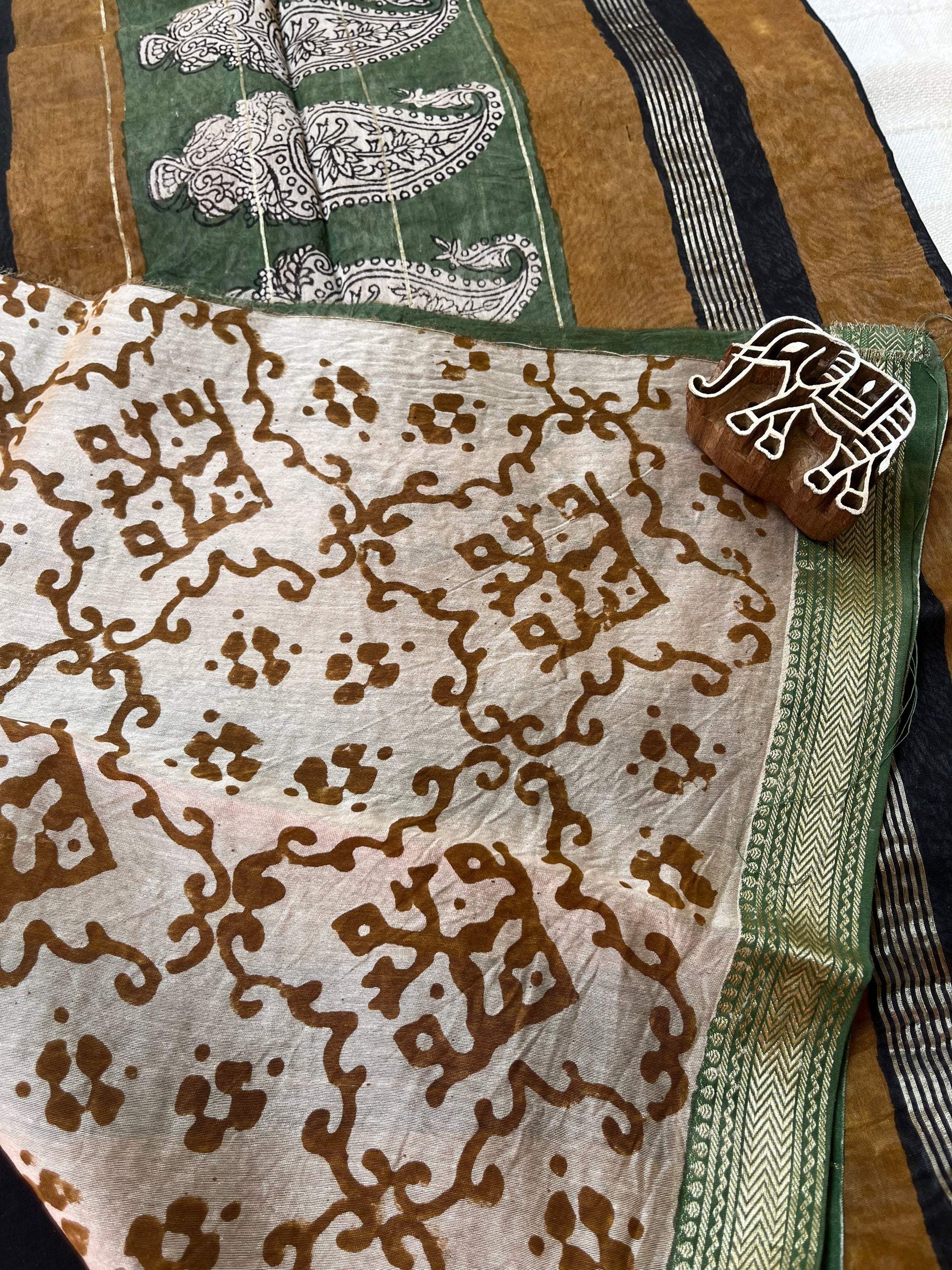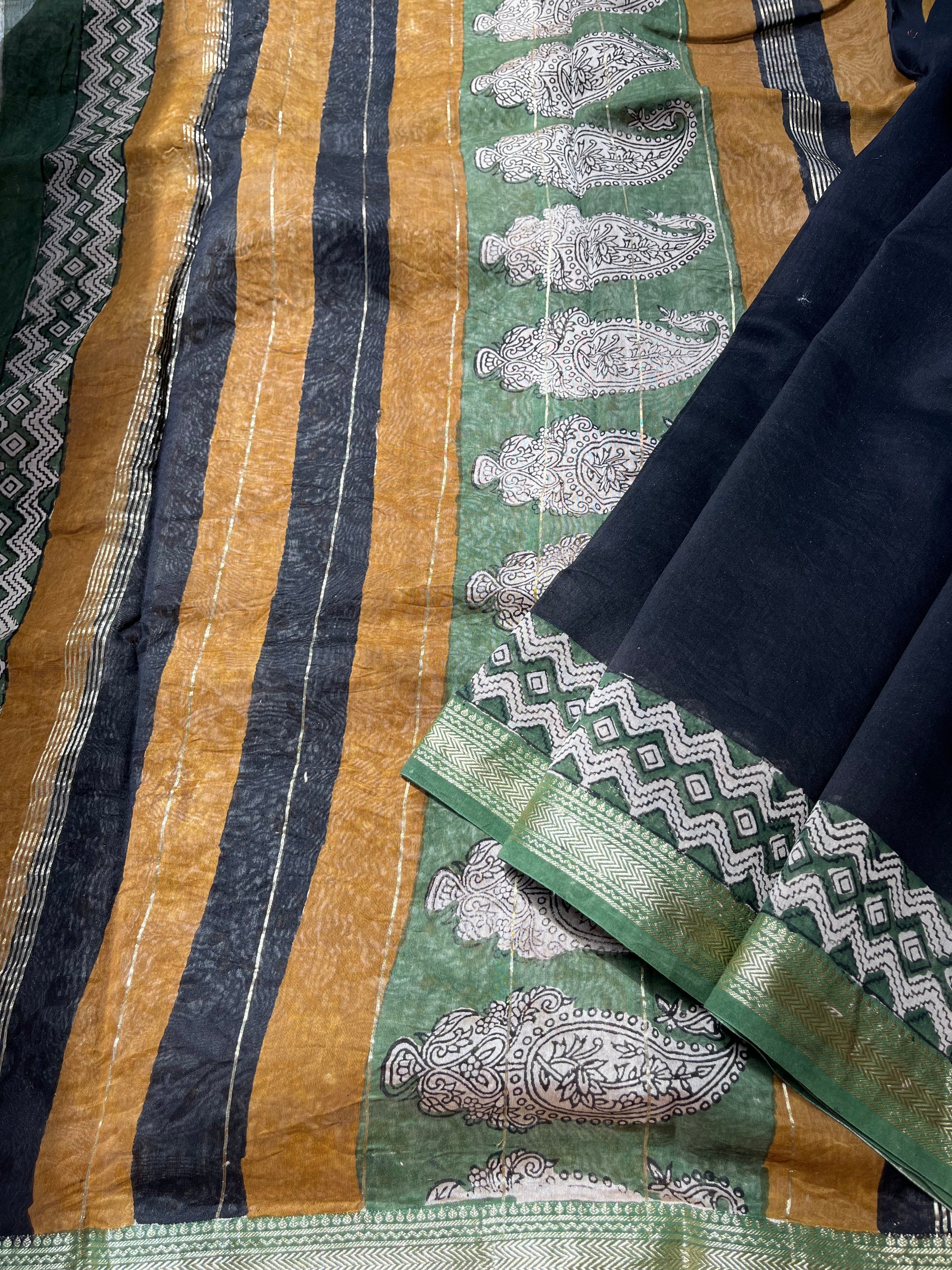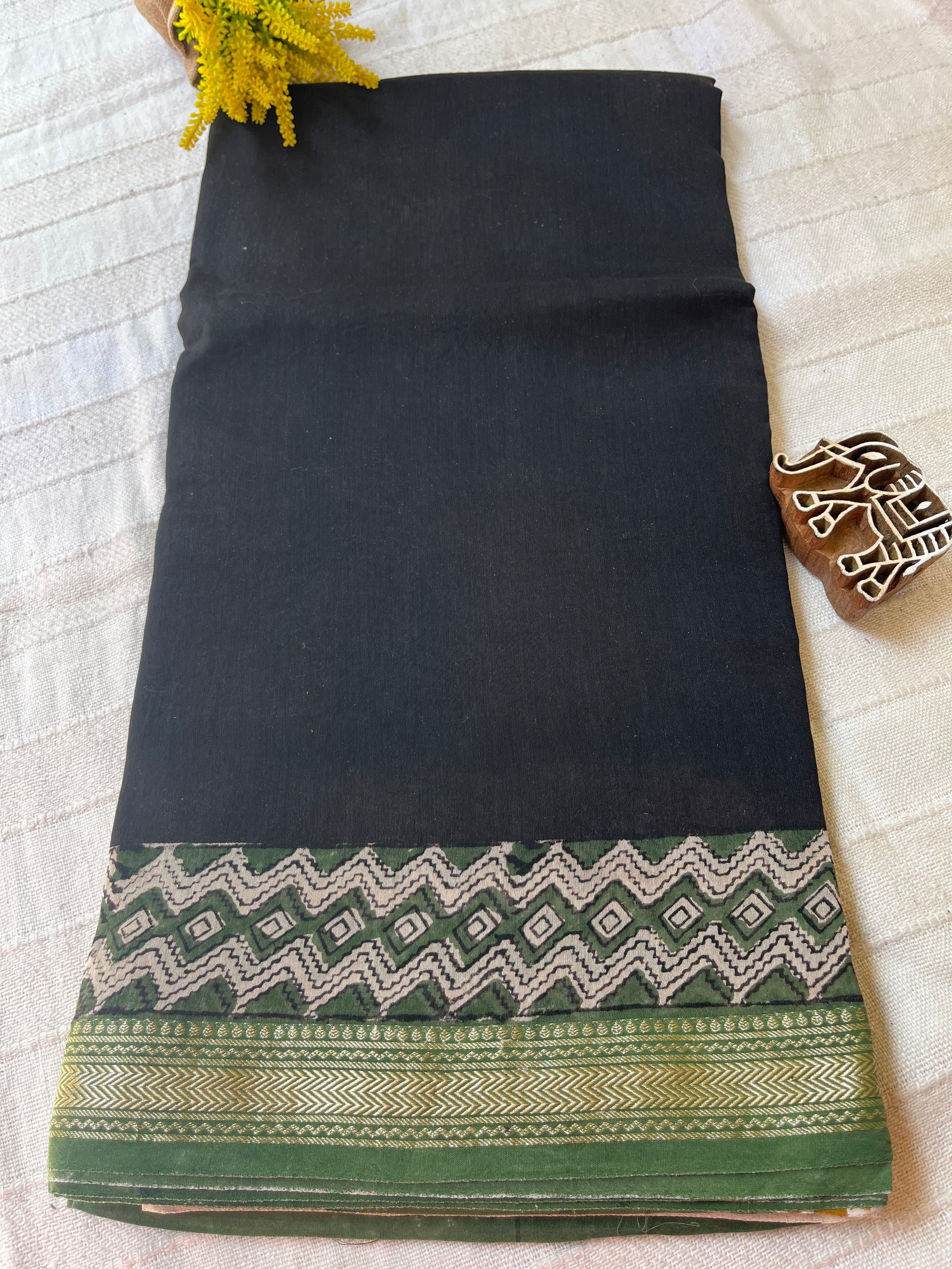 Bagru Handblock Maheshwari Cotton Silk Saree - Black Green