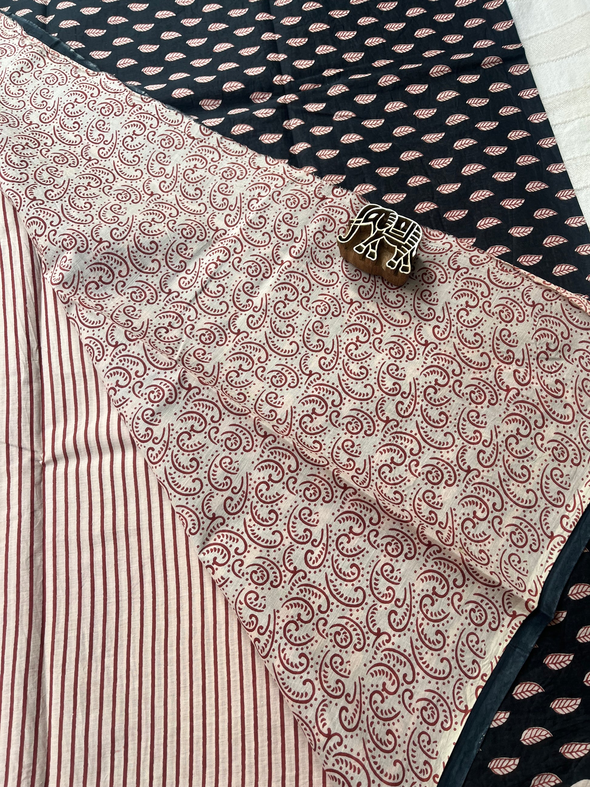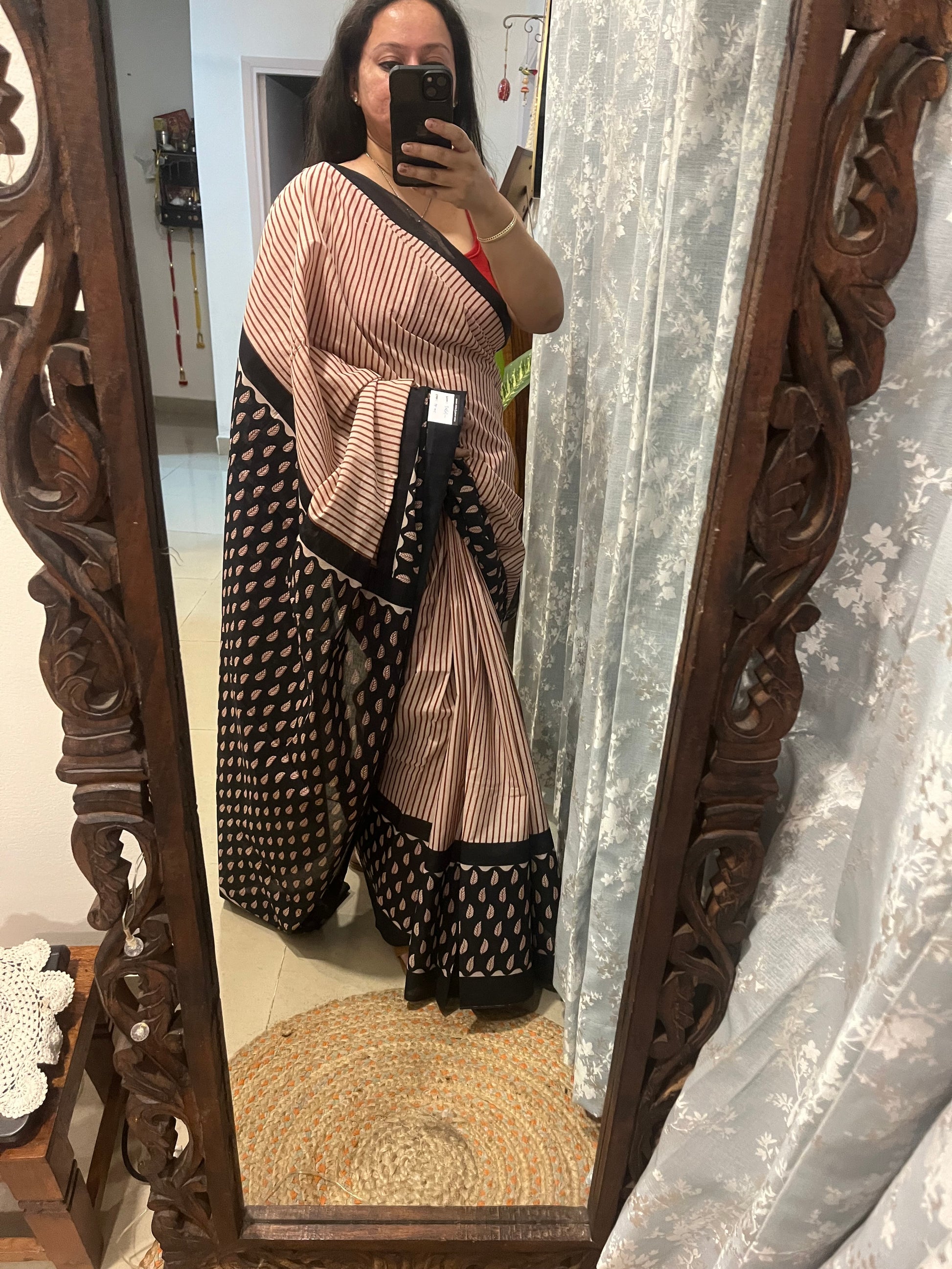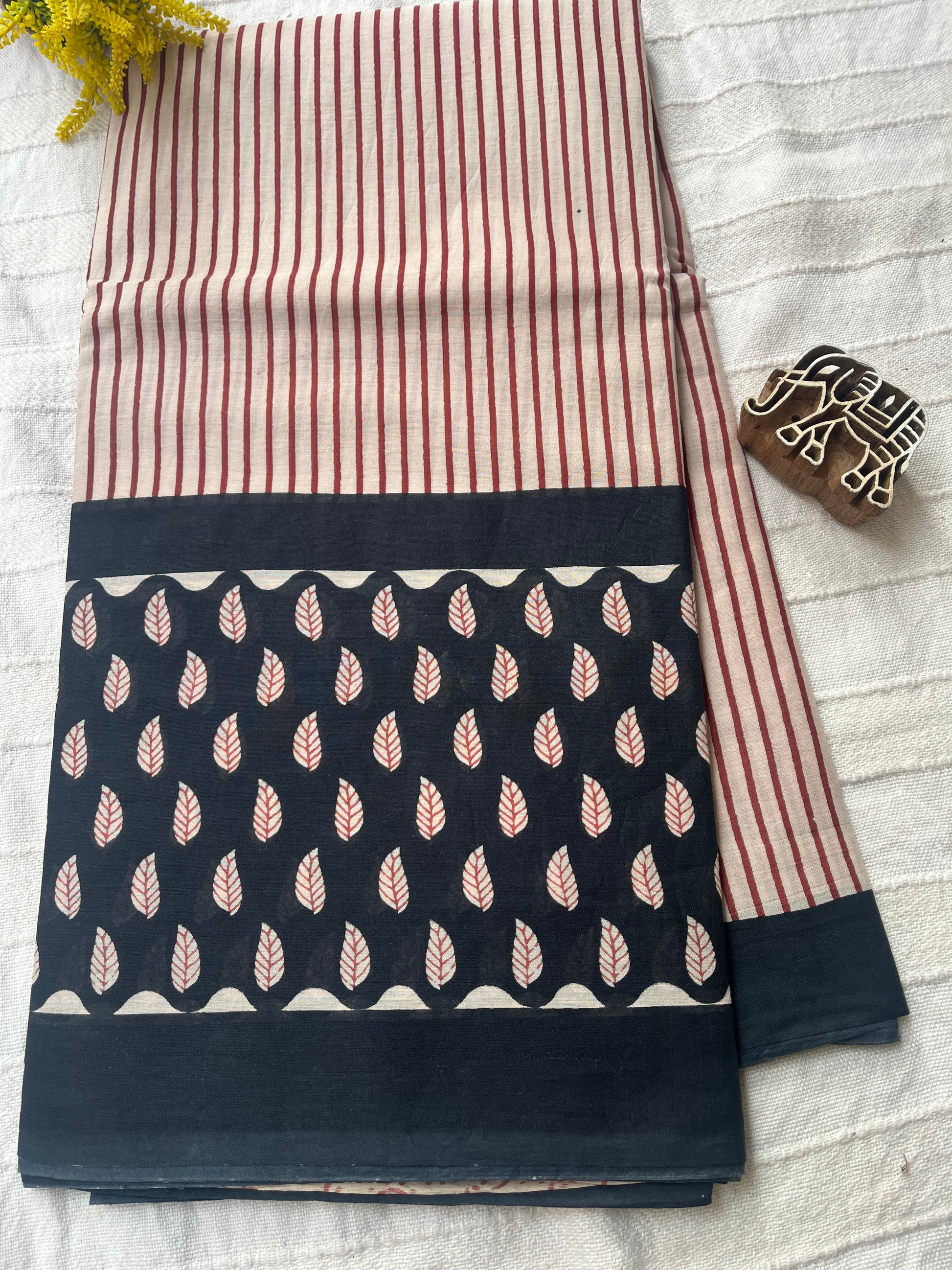 Bagru Handblock Mul Cotton Saree - off-white & Red Stripes