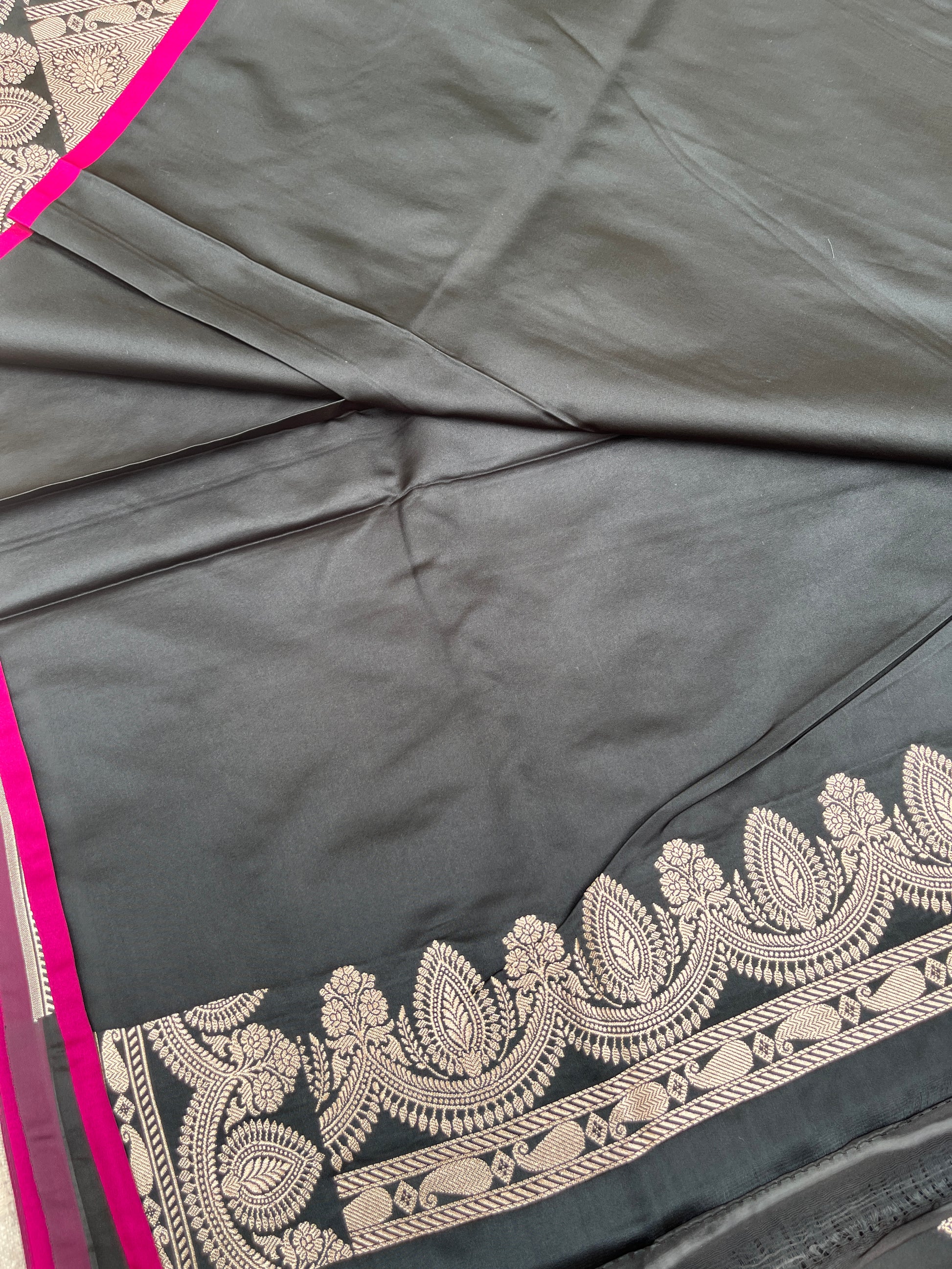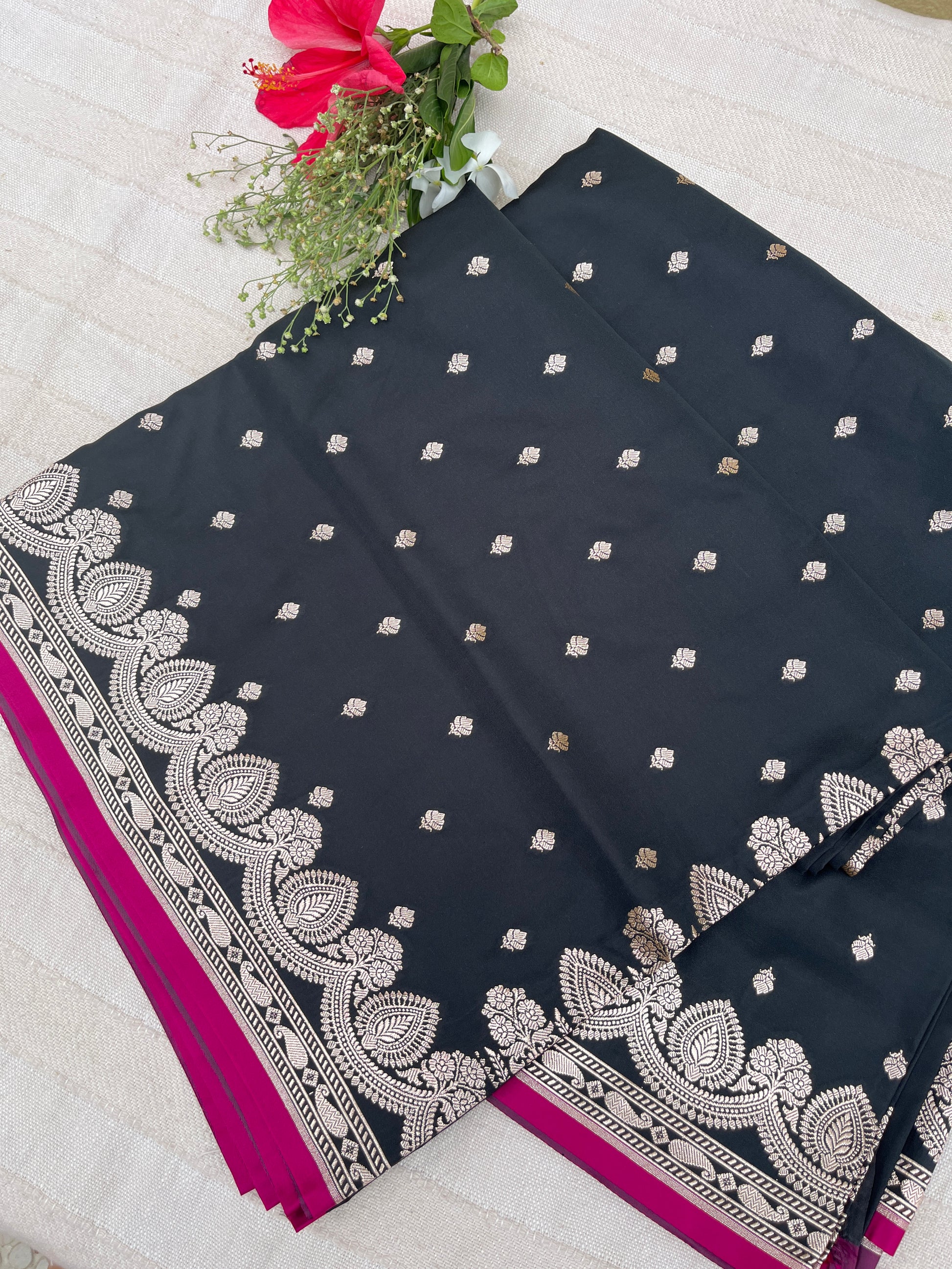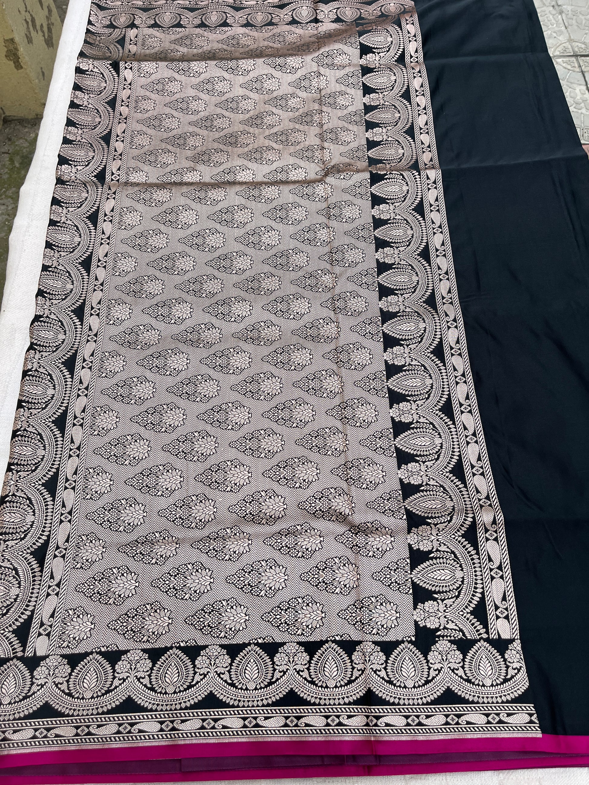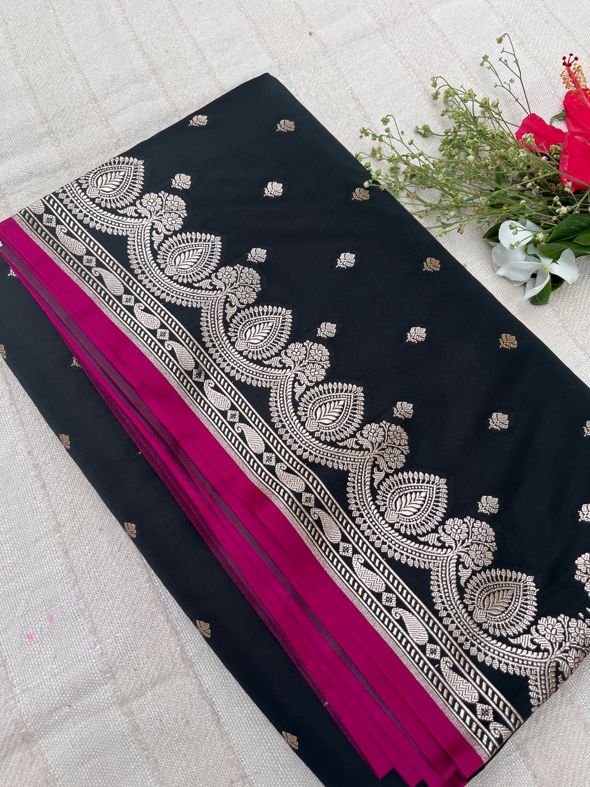 Experience the luxurious embrace of our Banarasi Mashru Satin Silk Saree – where rich satin sheen meets the heritage of Banarasi craftsmanship.
