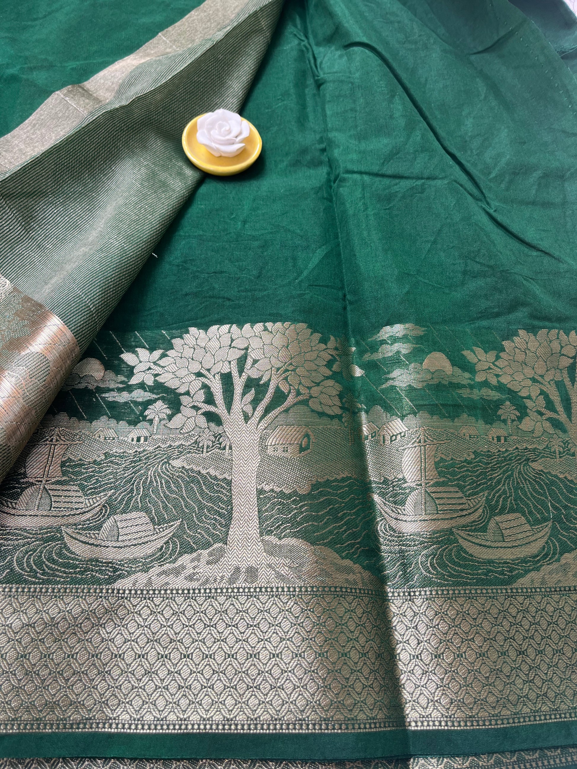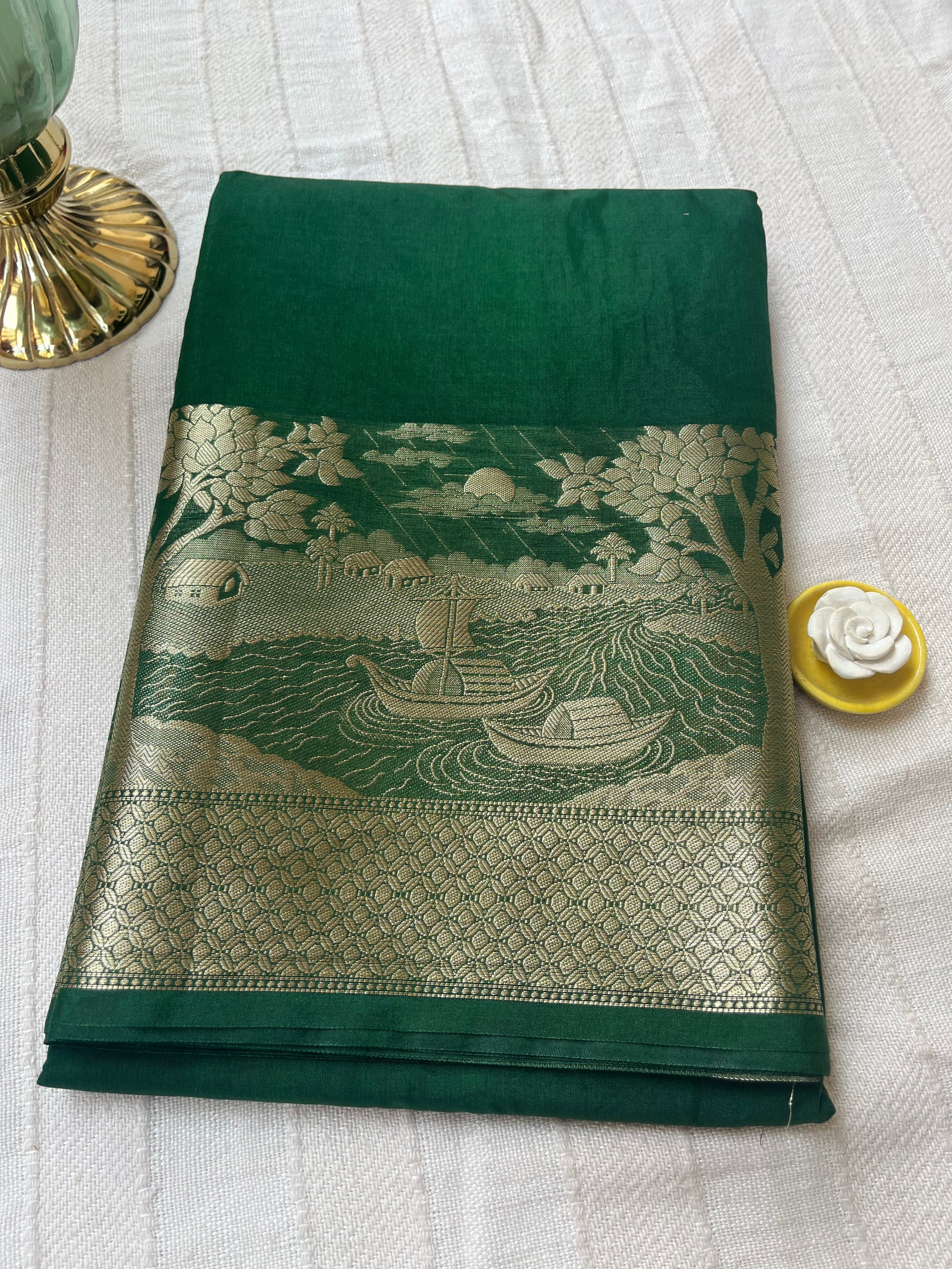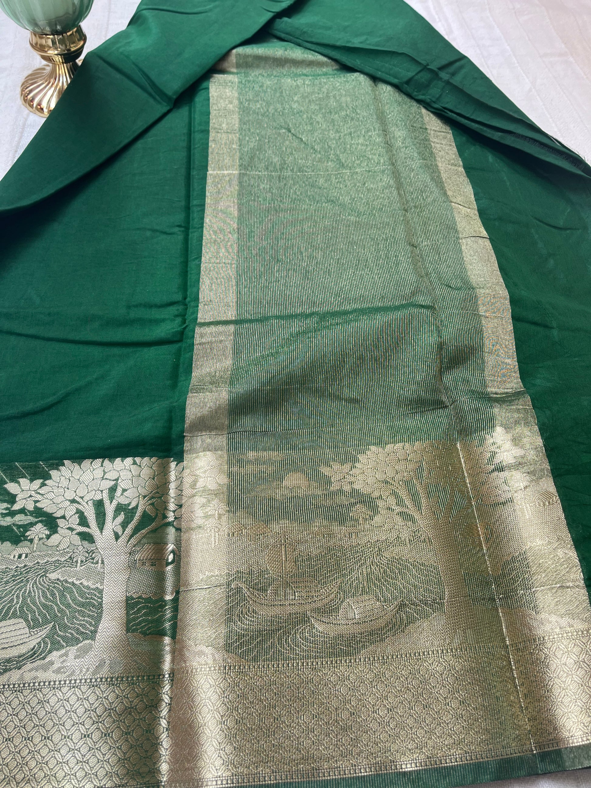 Banarasi Semi Georgette Ganga Ghat Saree - Bottle Green