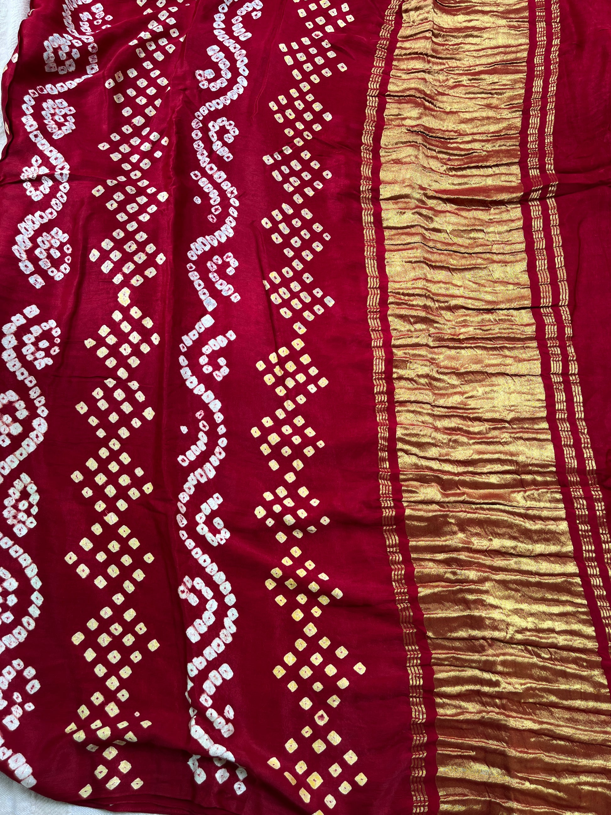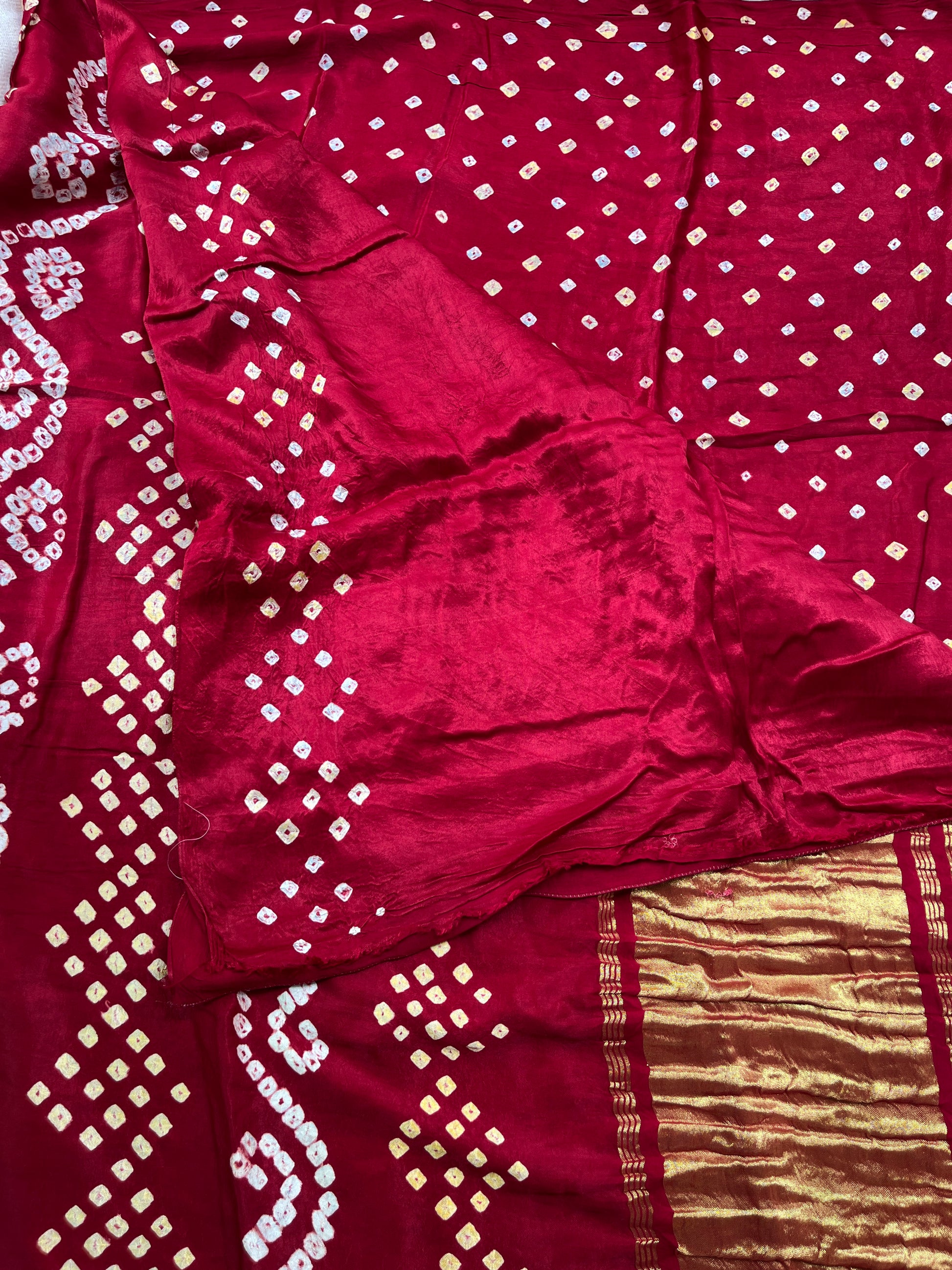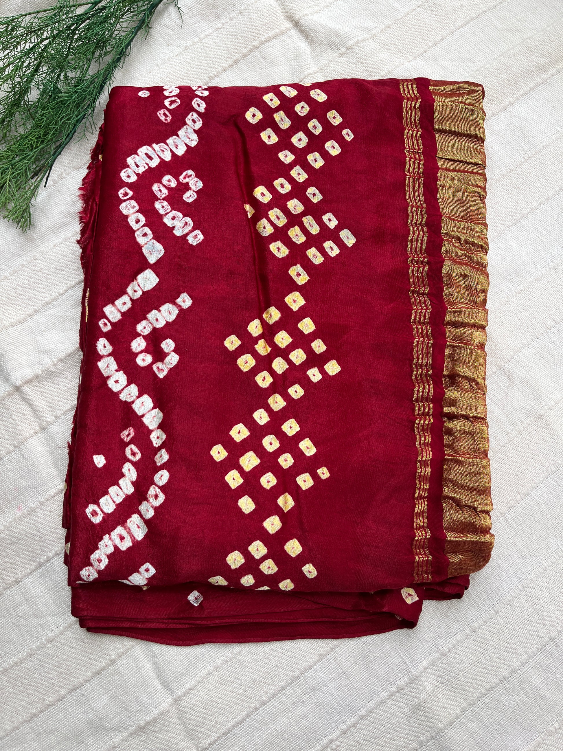 Bandhani Modal Silk saree with Tissue Palla - Deep Red with White Yellow Dot Bandhej