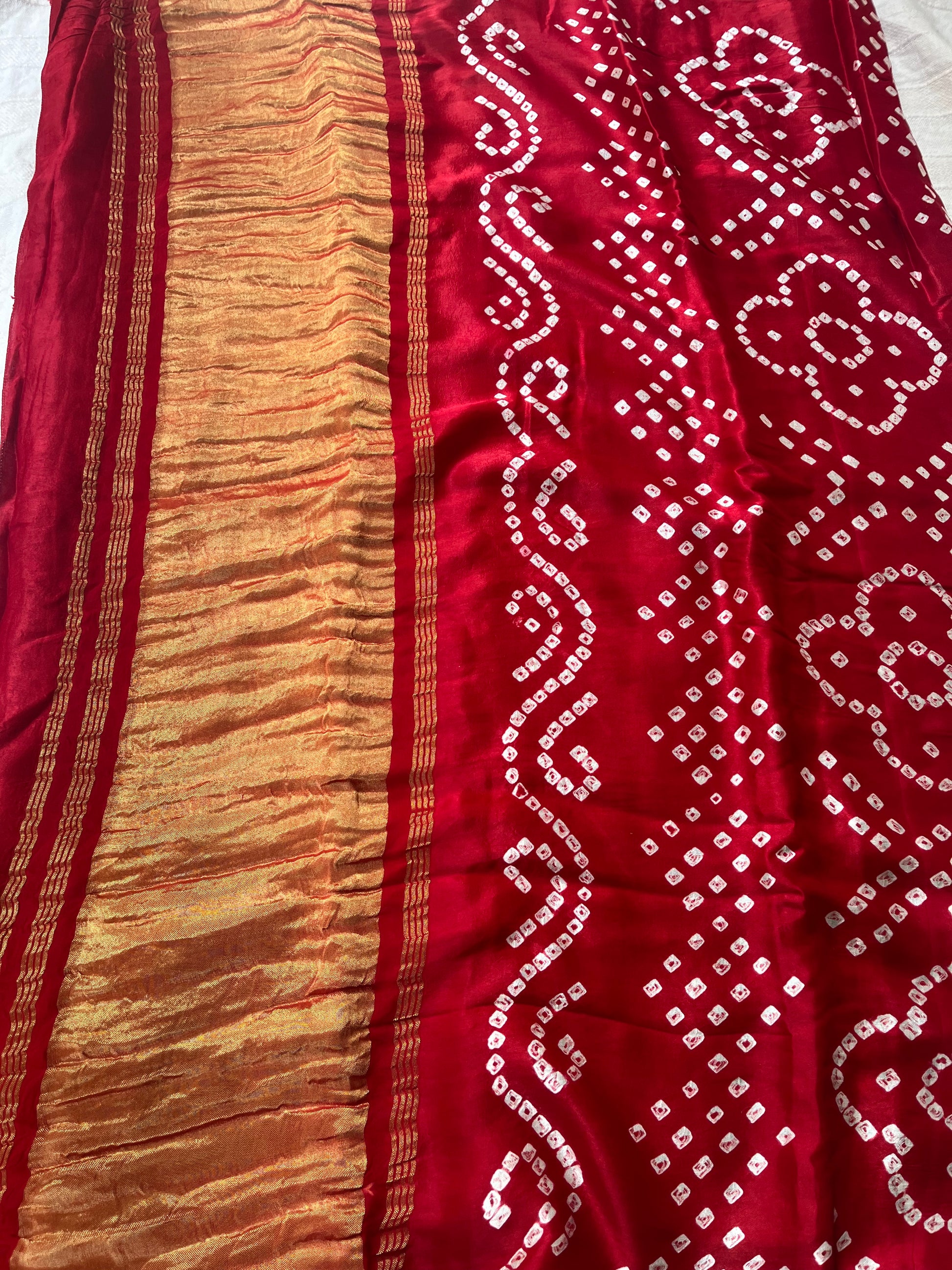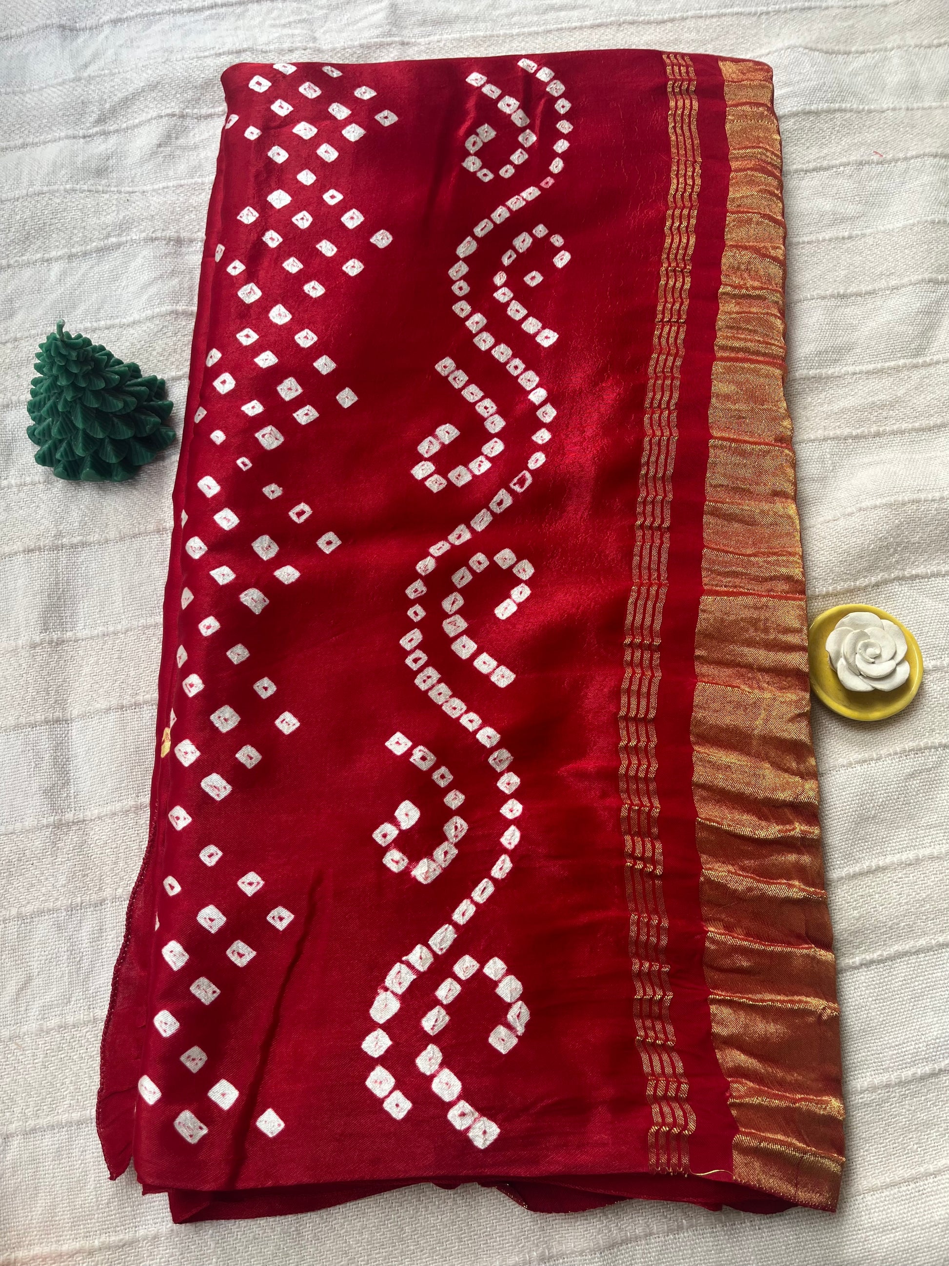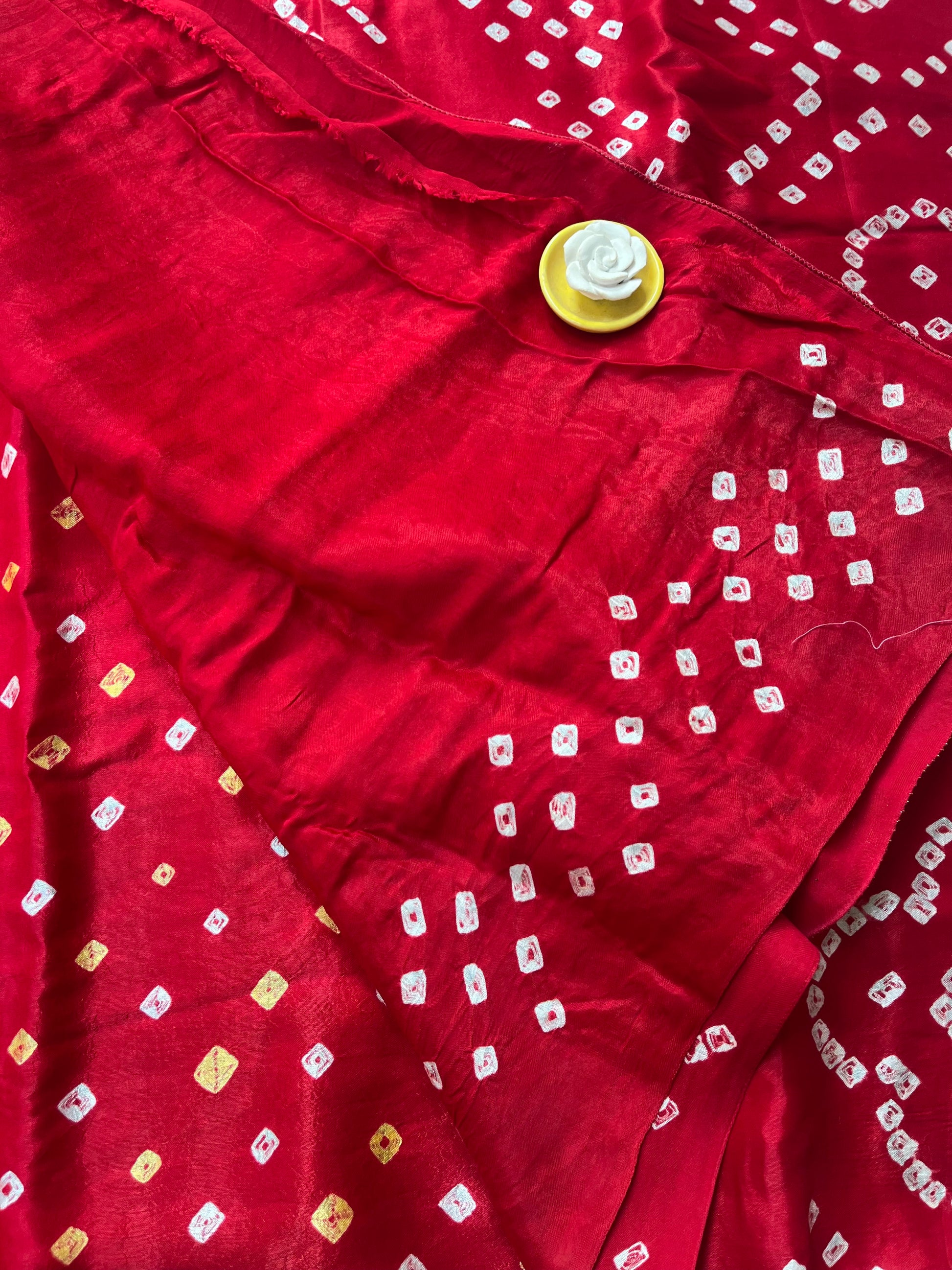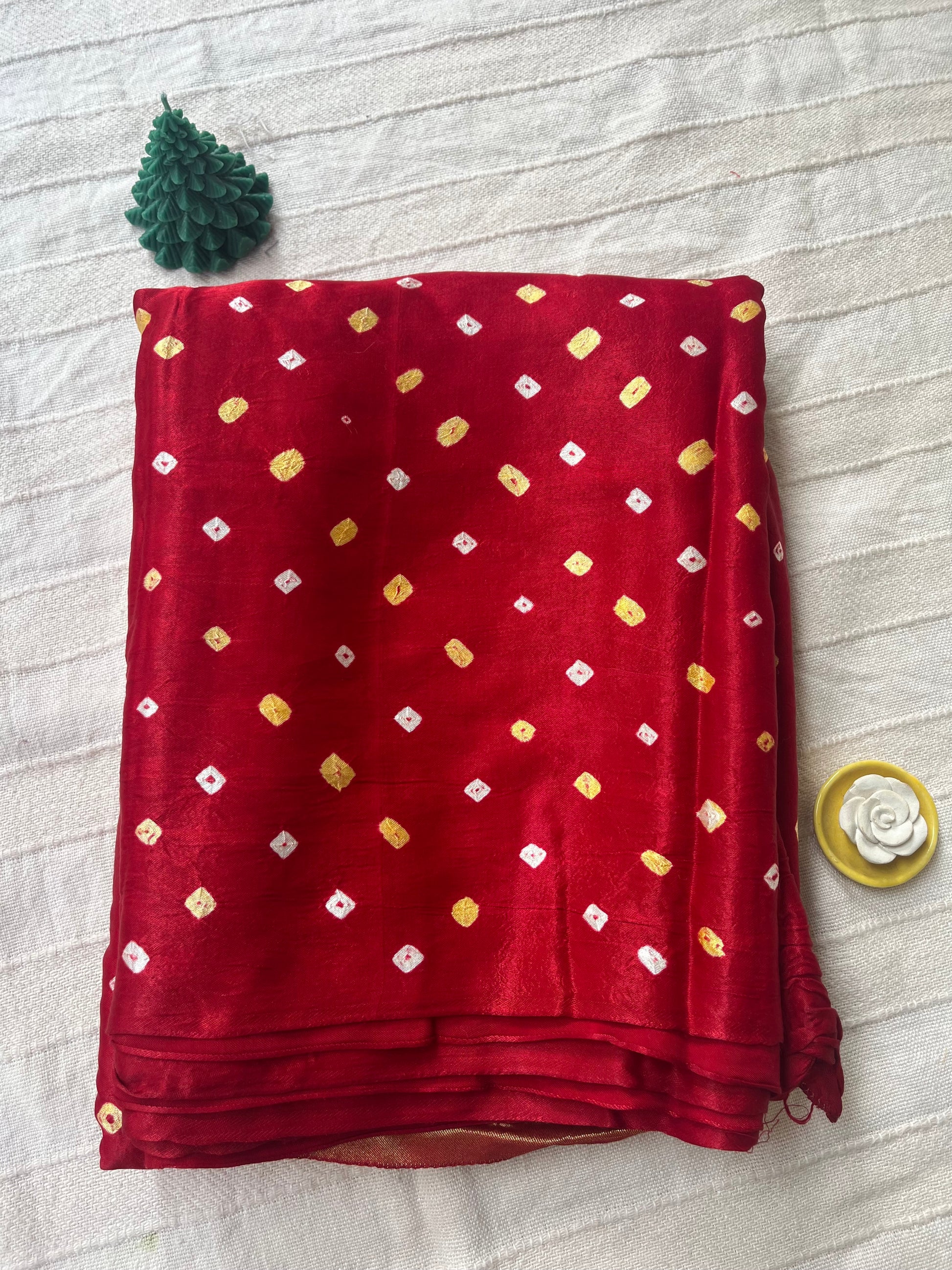 Bandhani Modal Silk saree with Tissue Palla - Red with White Yellow Dot Bandhej