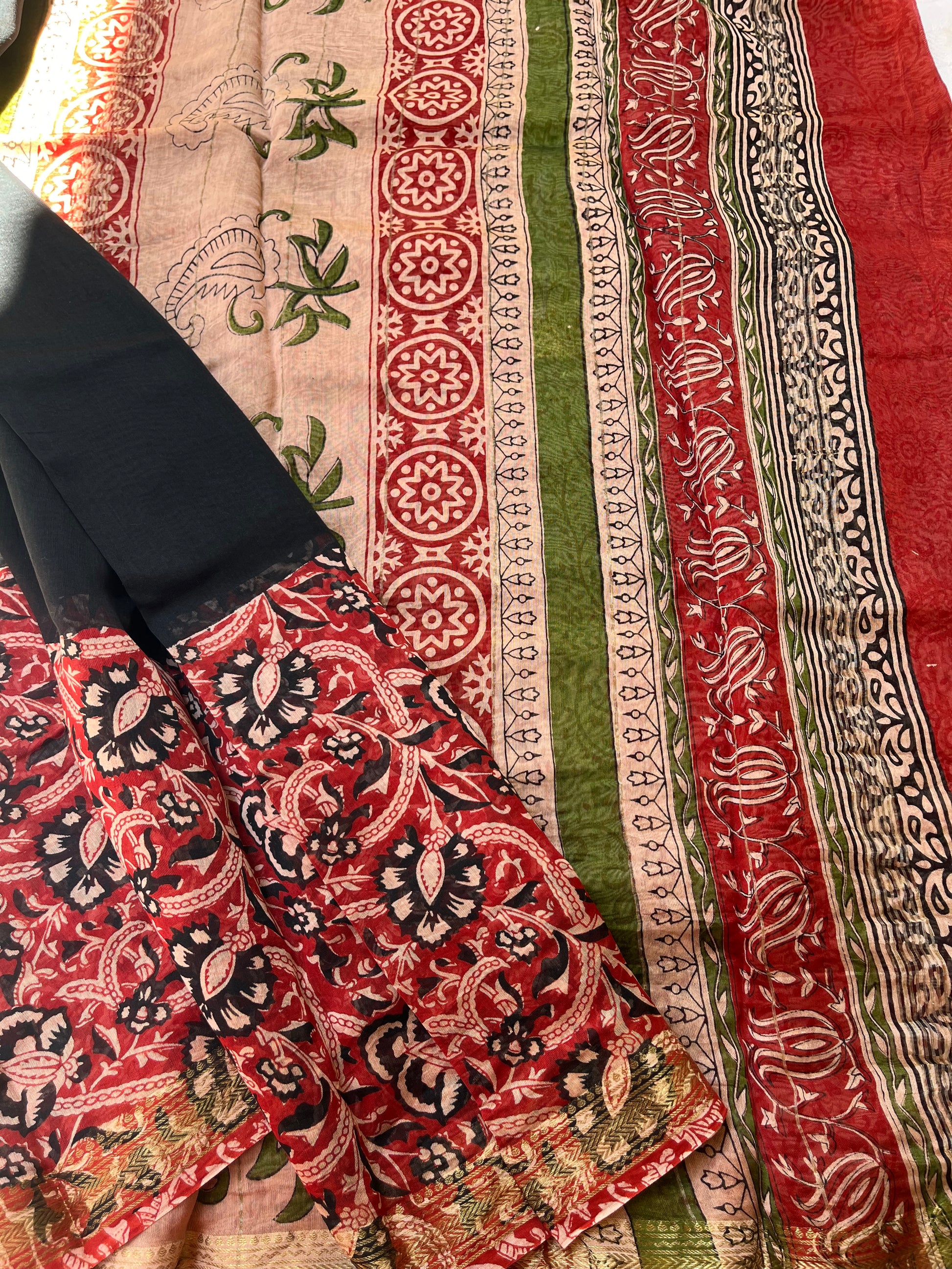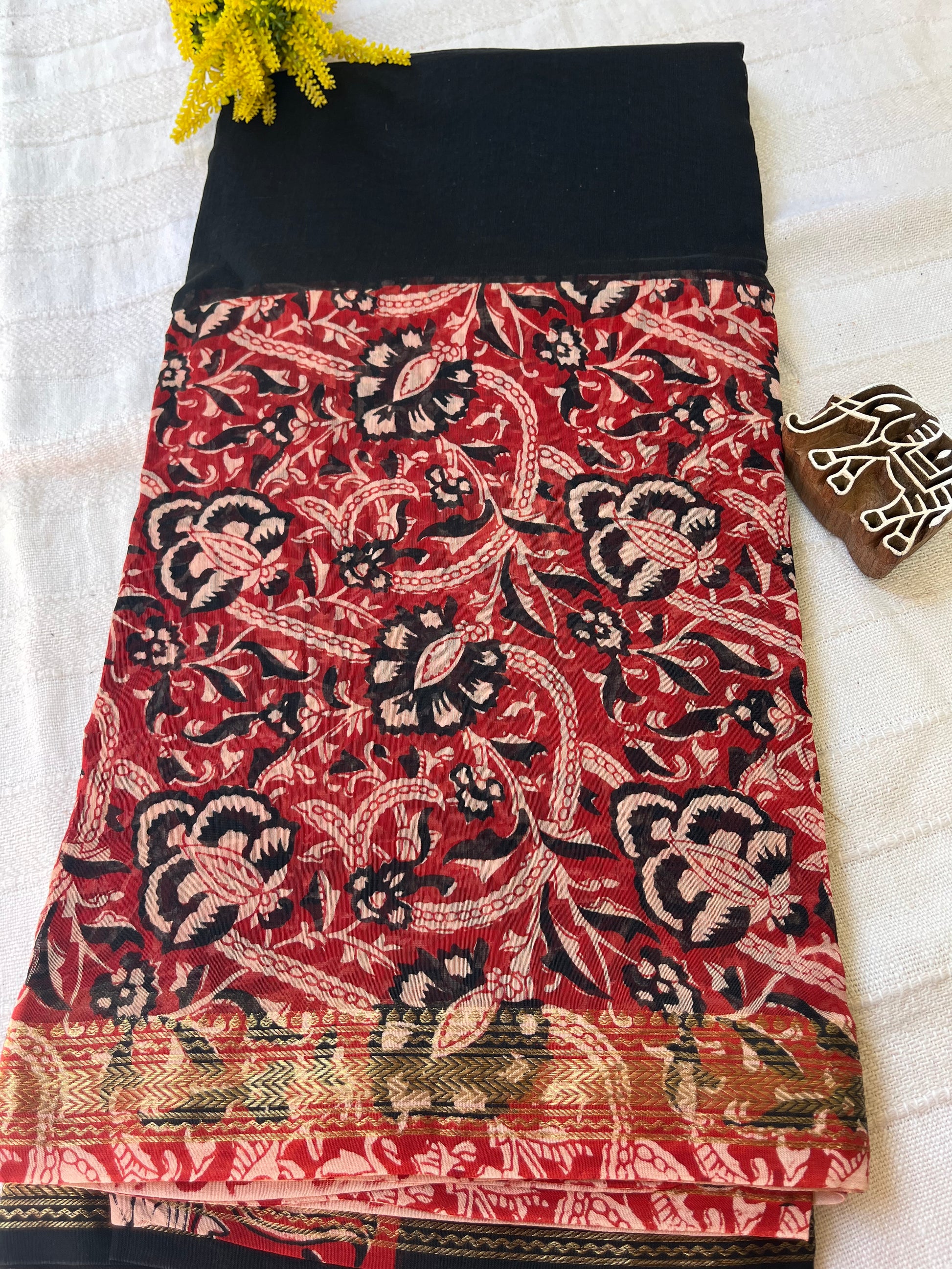 Black-Red Handblock Maheshwari Cotton Silk Saree