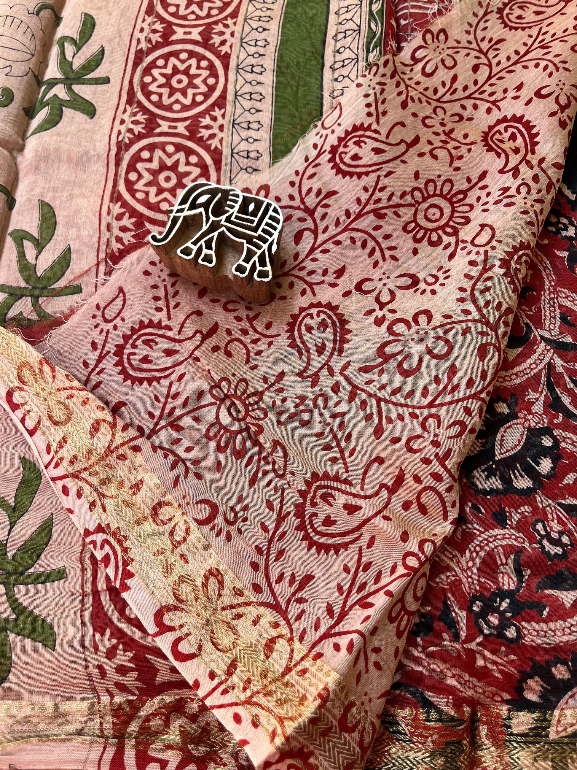 Experience the timeless elegance of our Handblock Maheshwari Cotton Silk Saree. This exquisite piece combines the soft, luxurious feel of silk with the lightness and comfort of cotton, creating a perfect blend for any occasion.