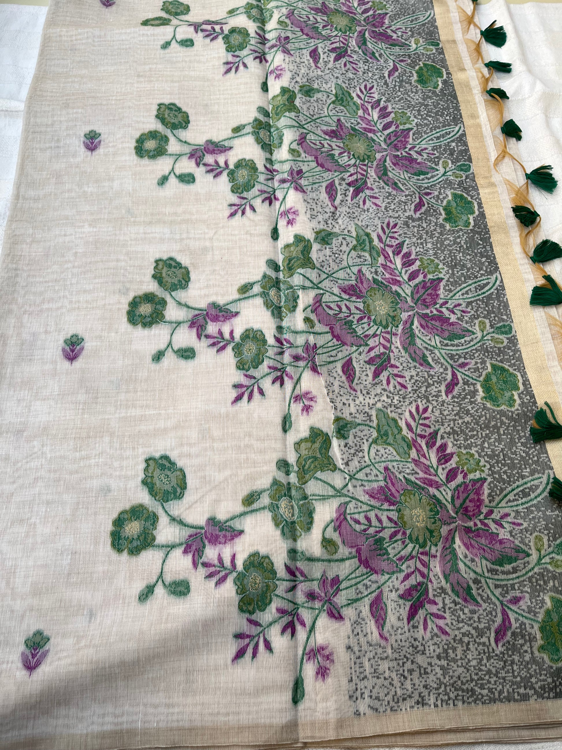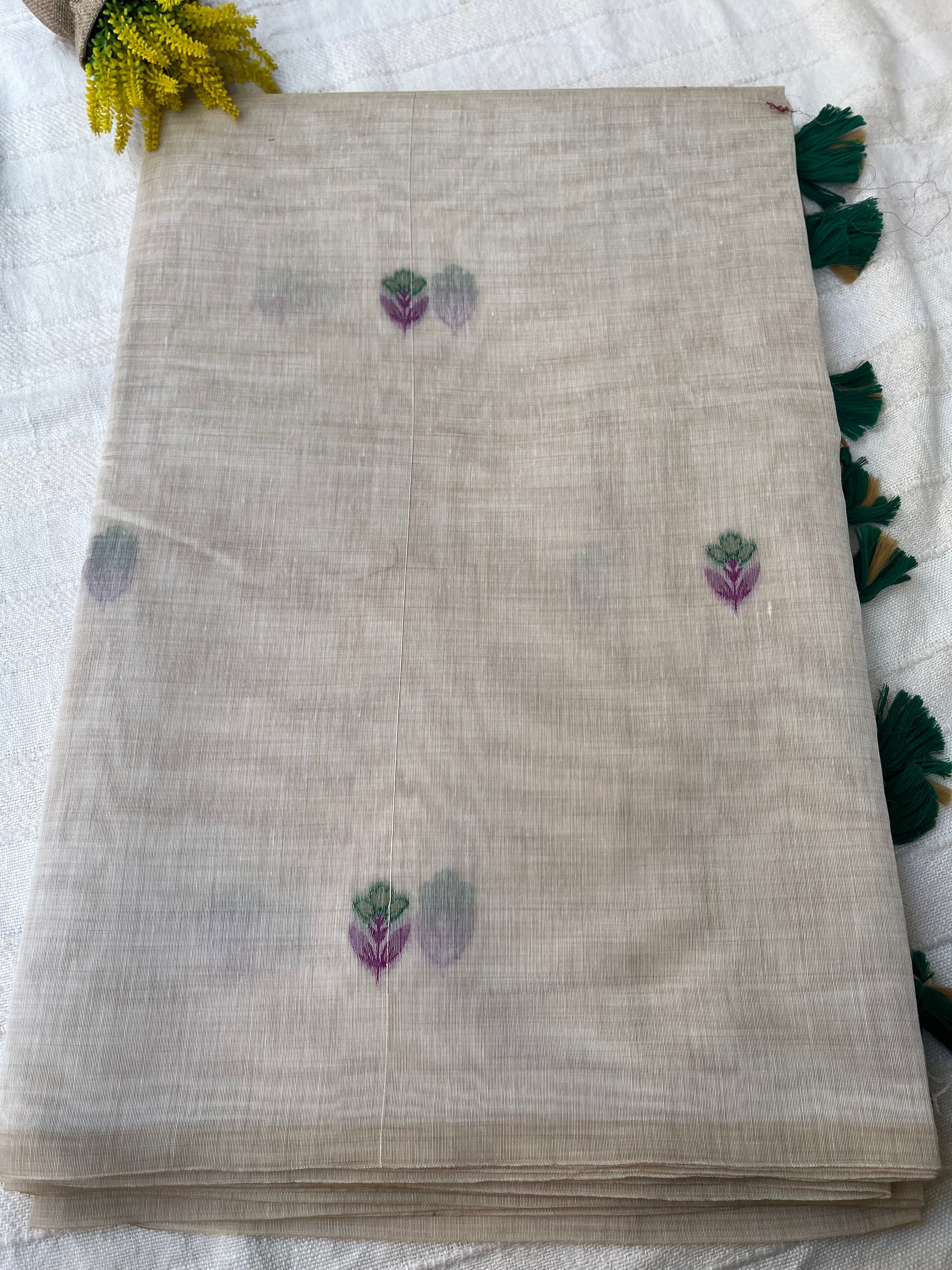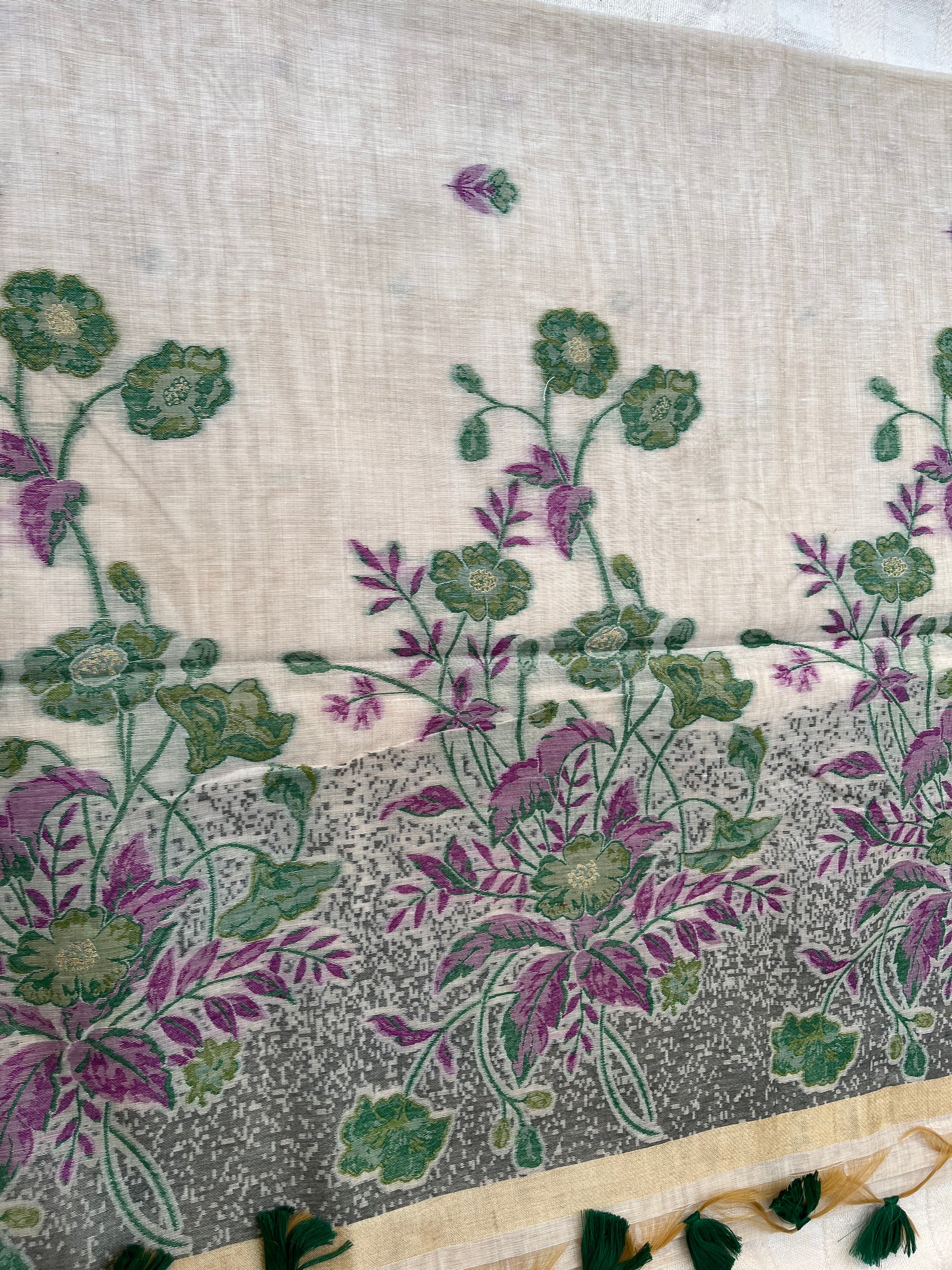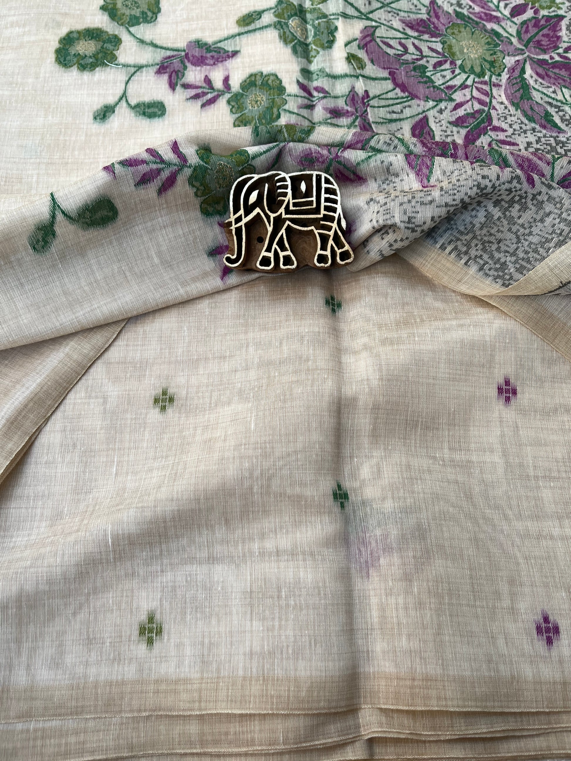 Chanderi Cotton Jamdani Saree - Ivory Flower Weaving