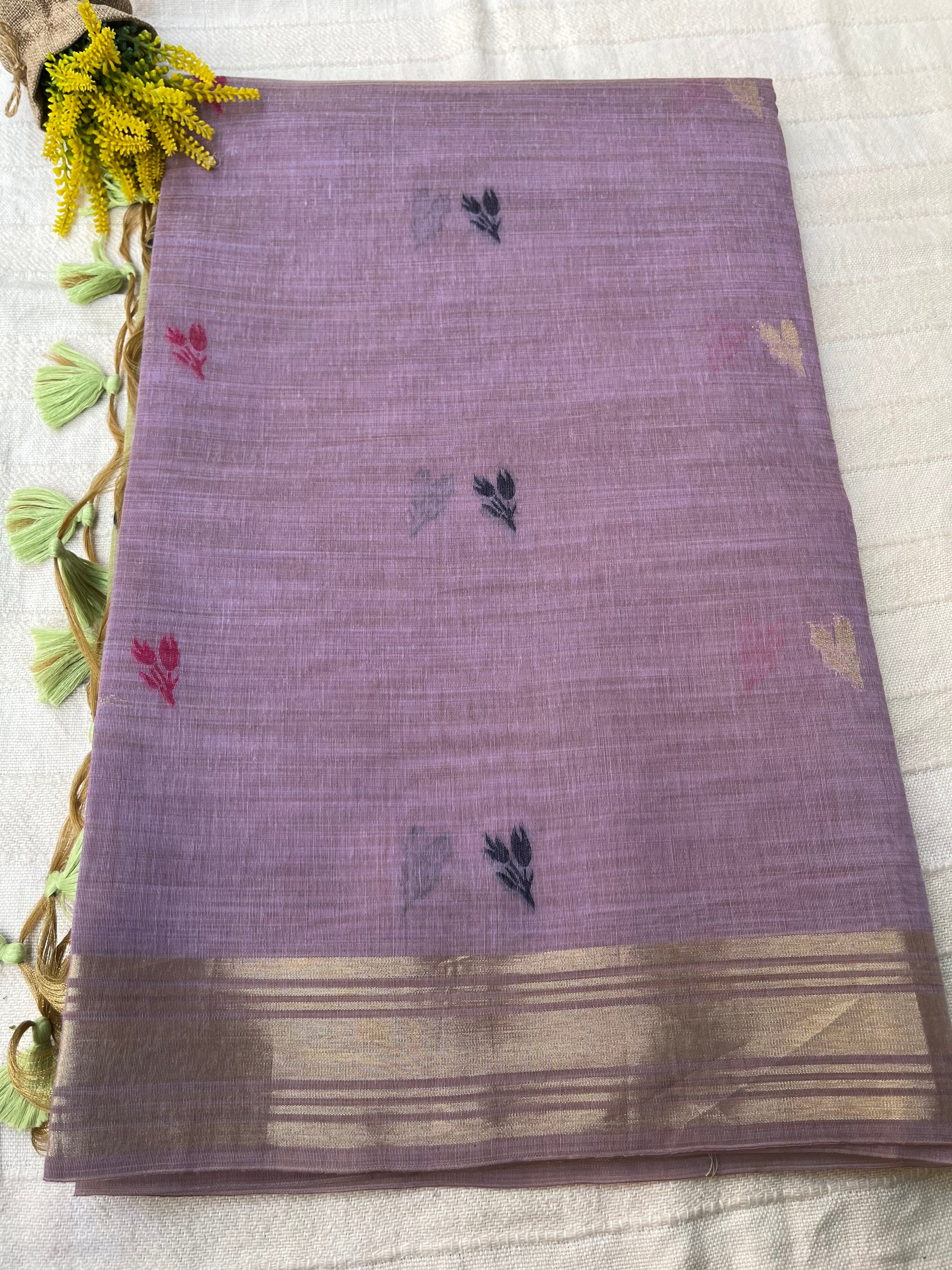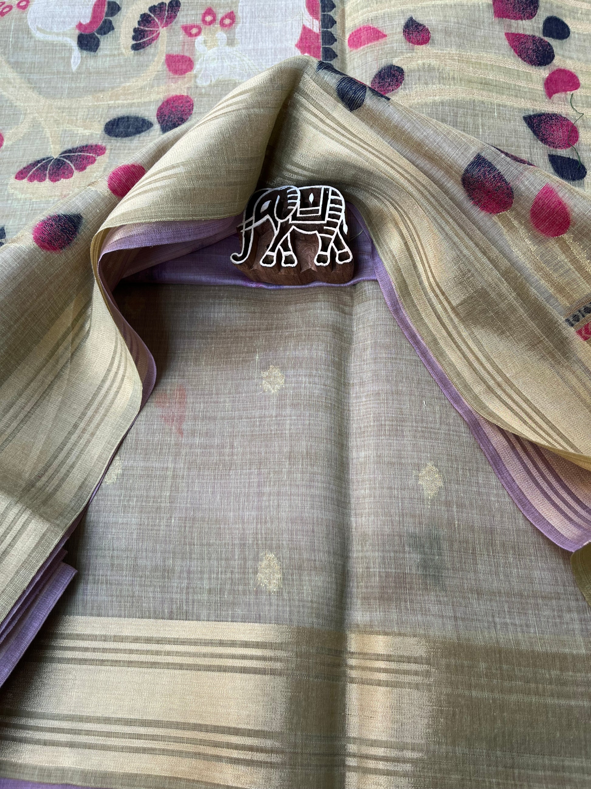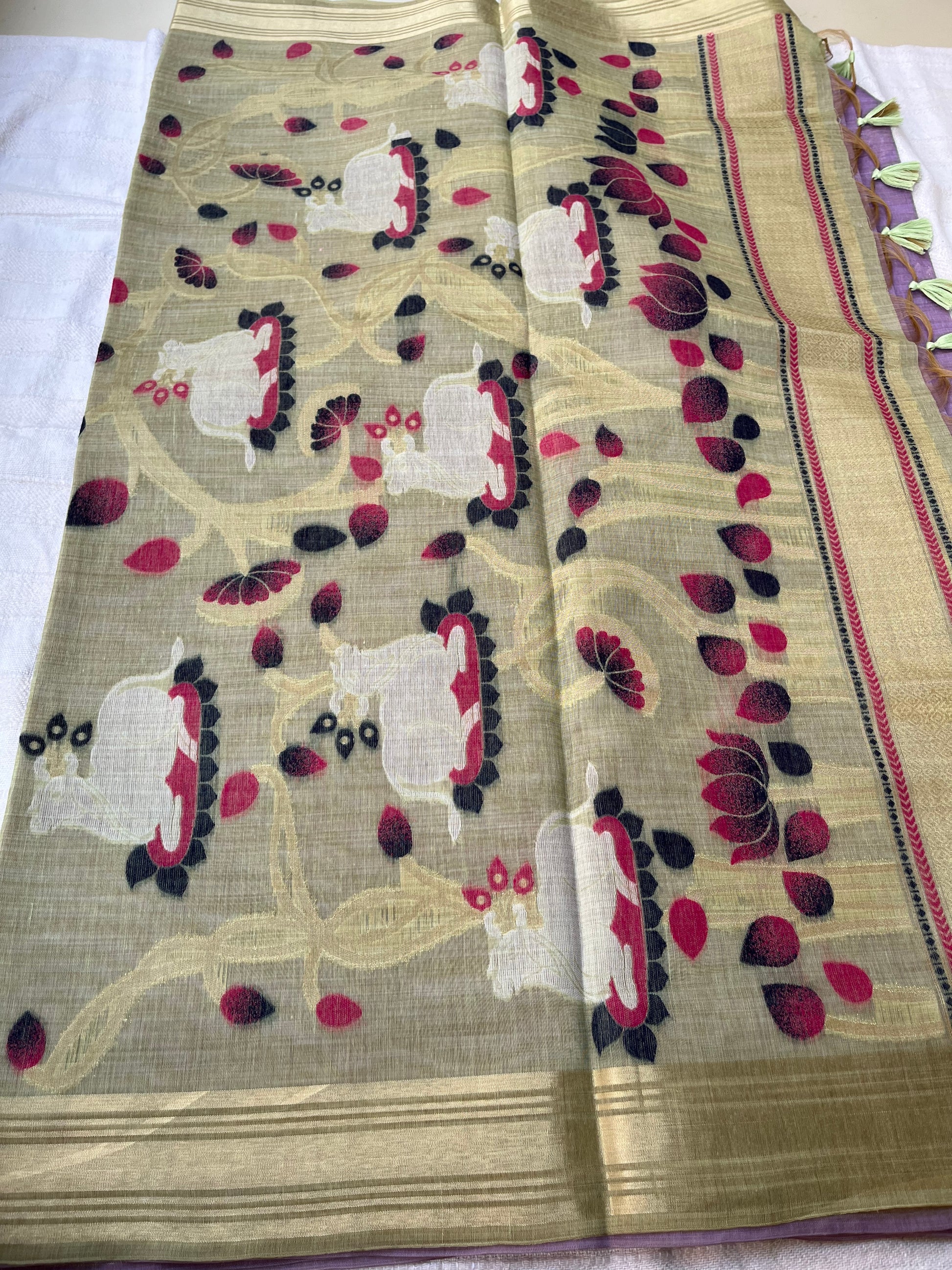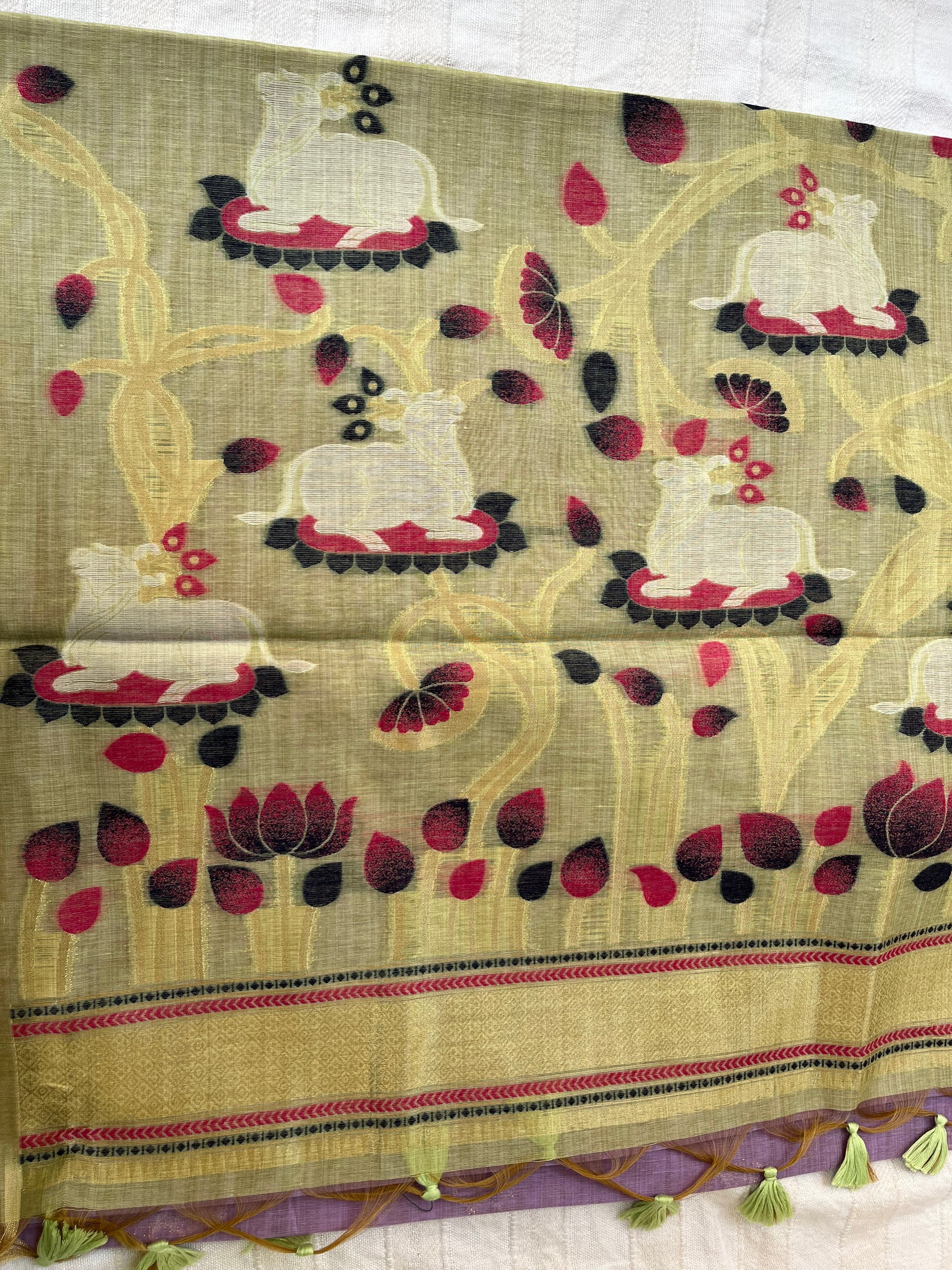 Chanderi Cotton Jamdani Saree - Lavender-Olive Green Pichwai