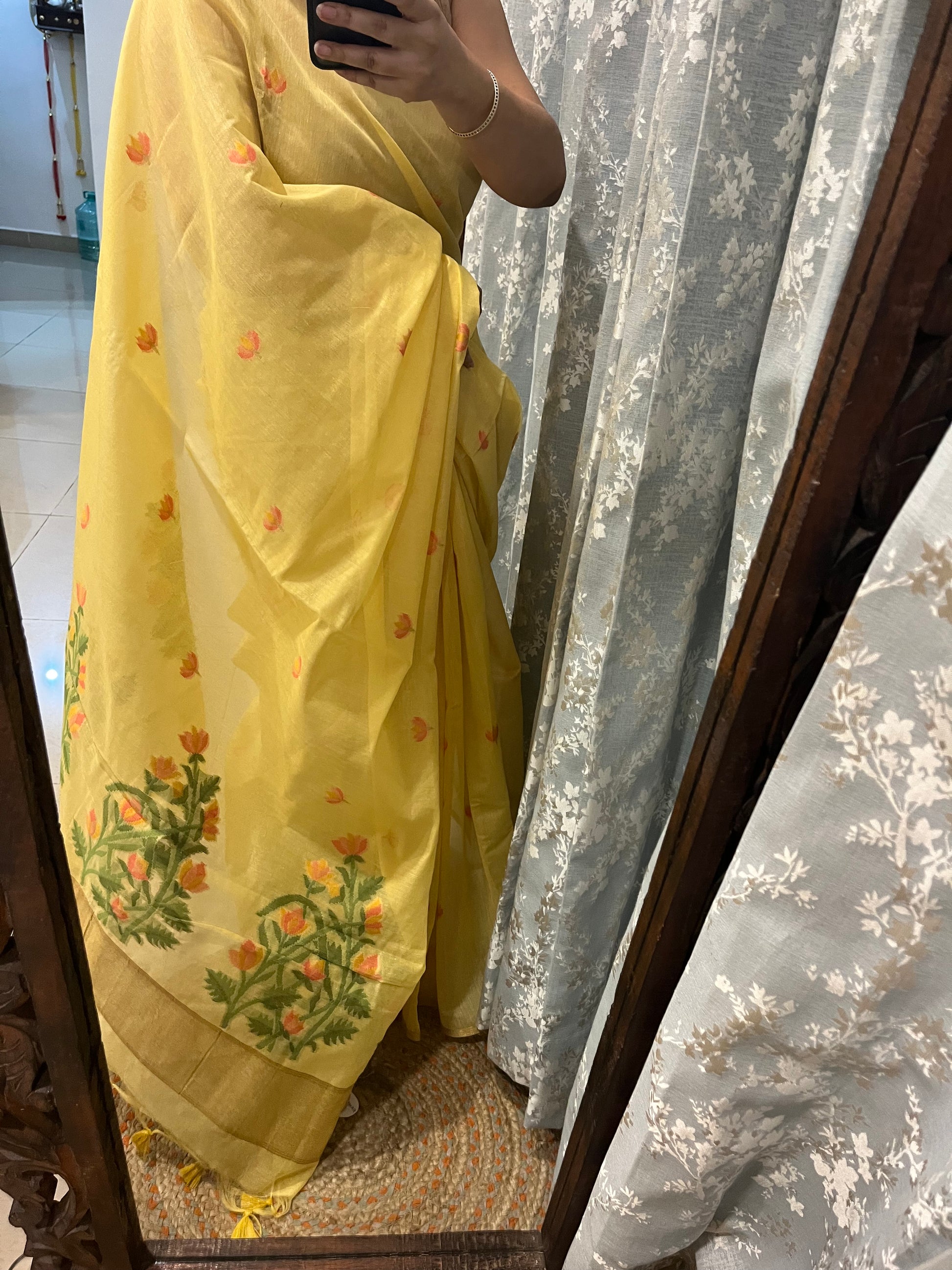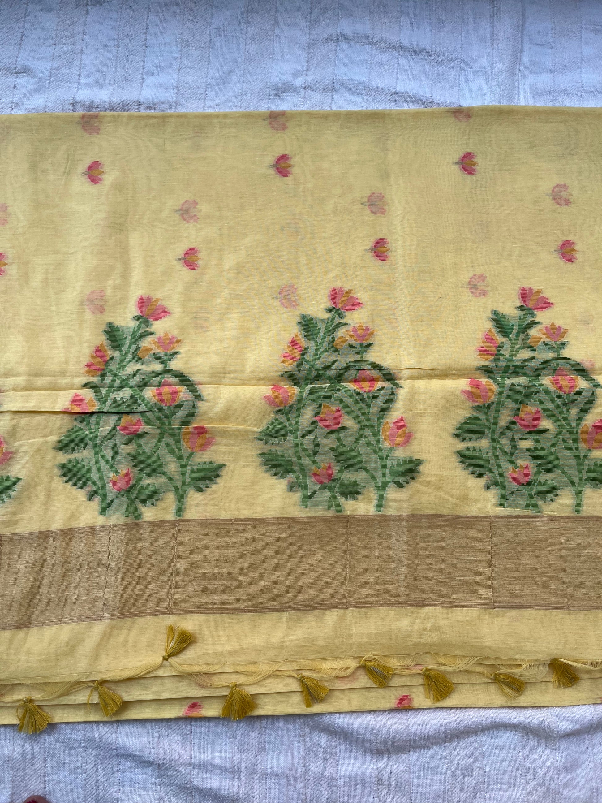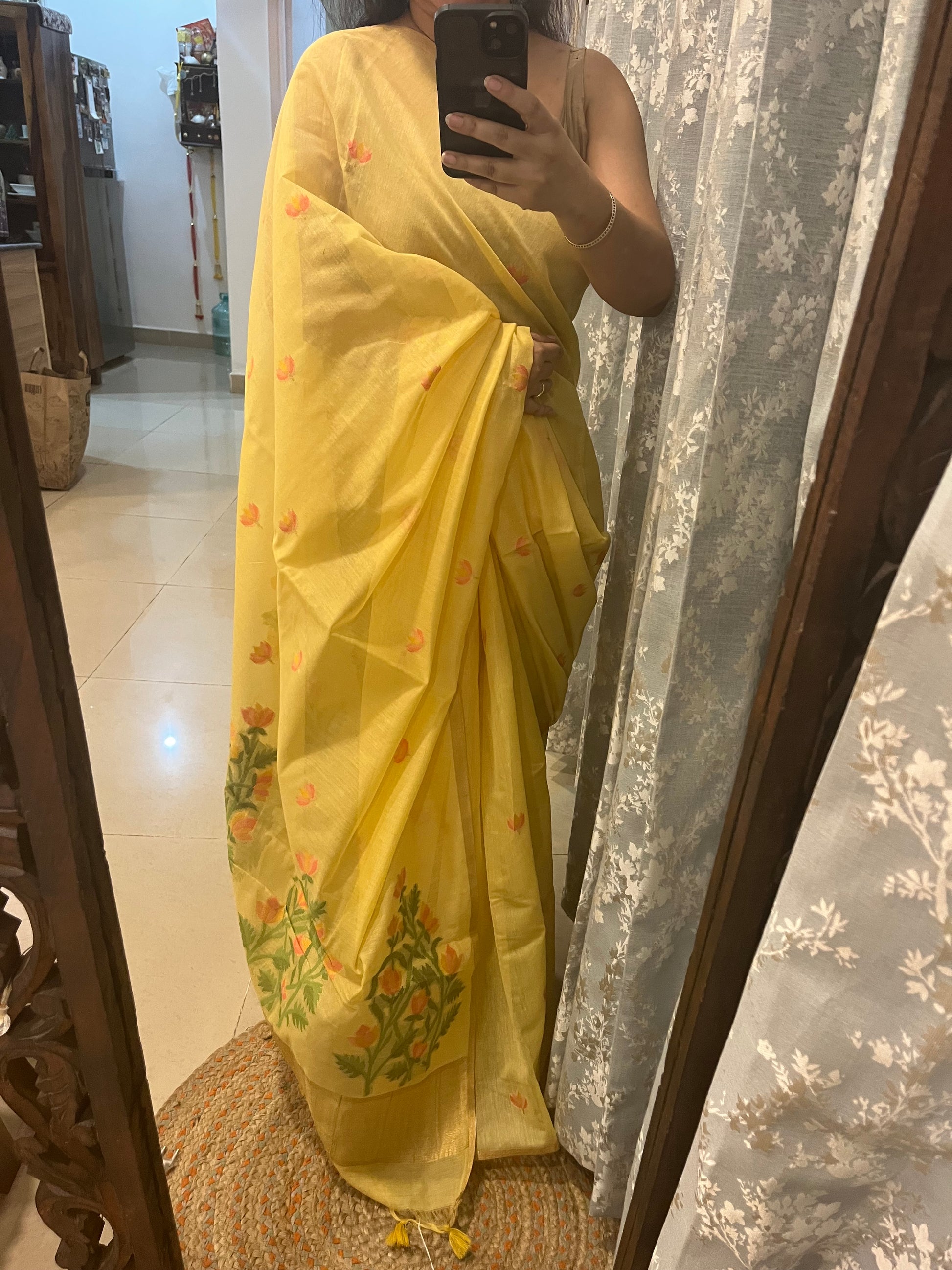 Chanderi Cotton Jamdani Saree - Lemon Yellow Lotus Motifs