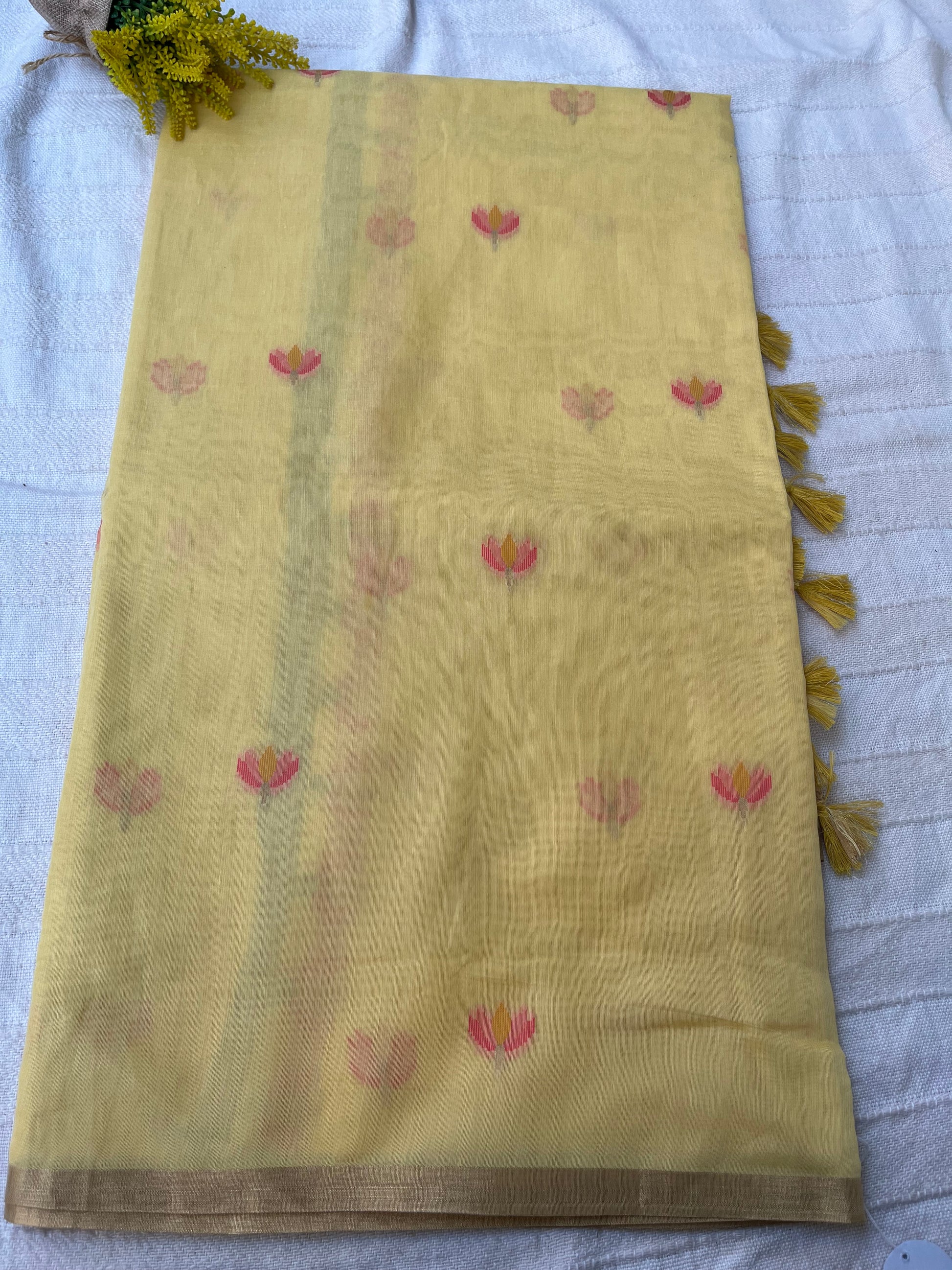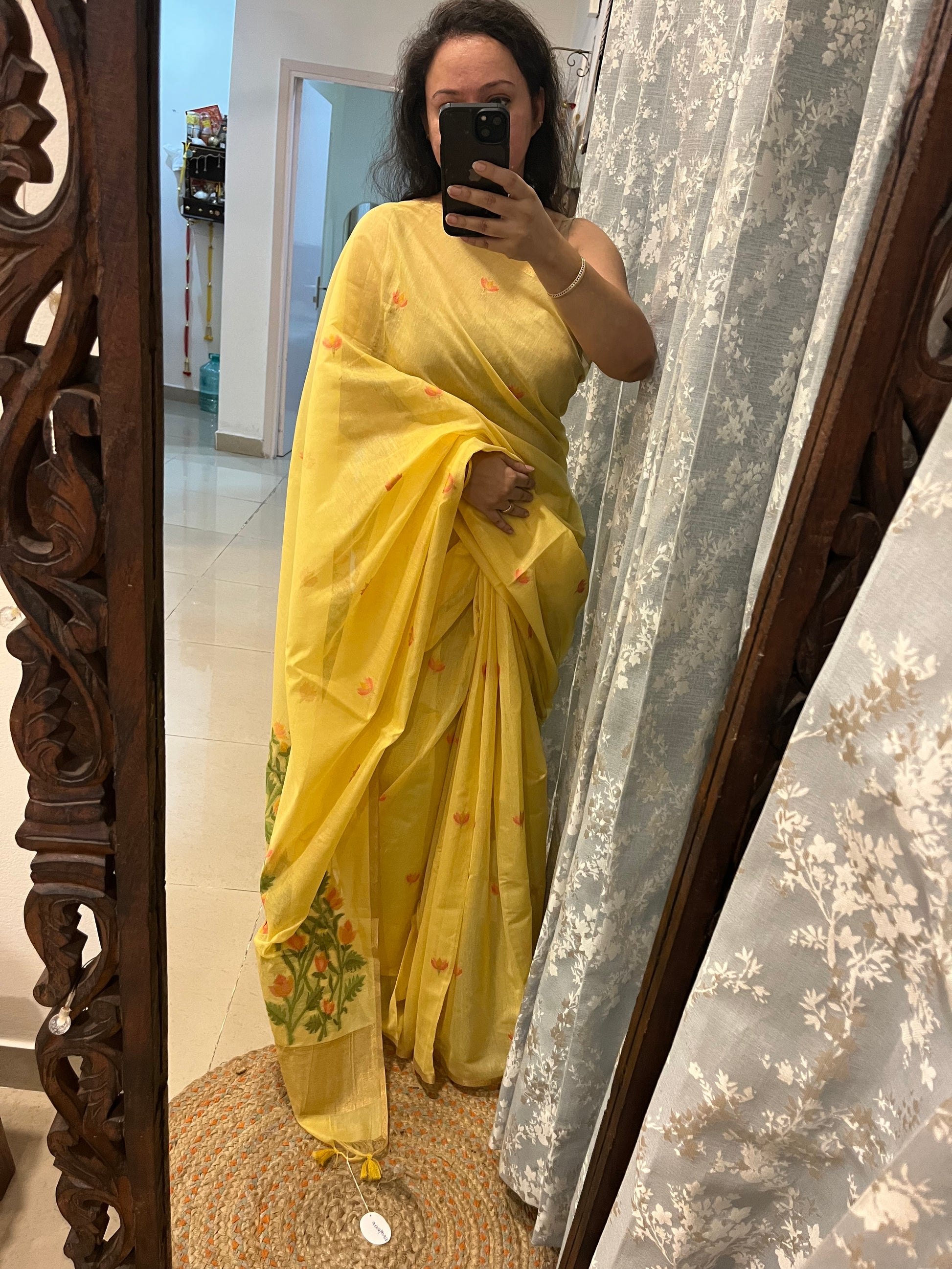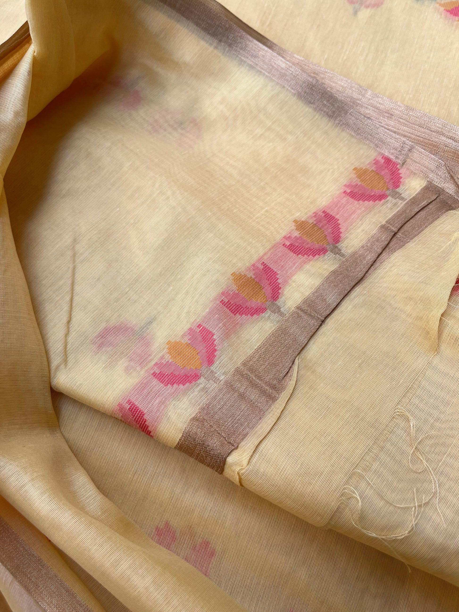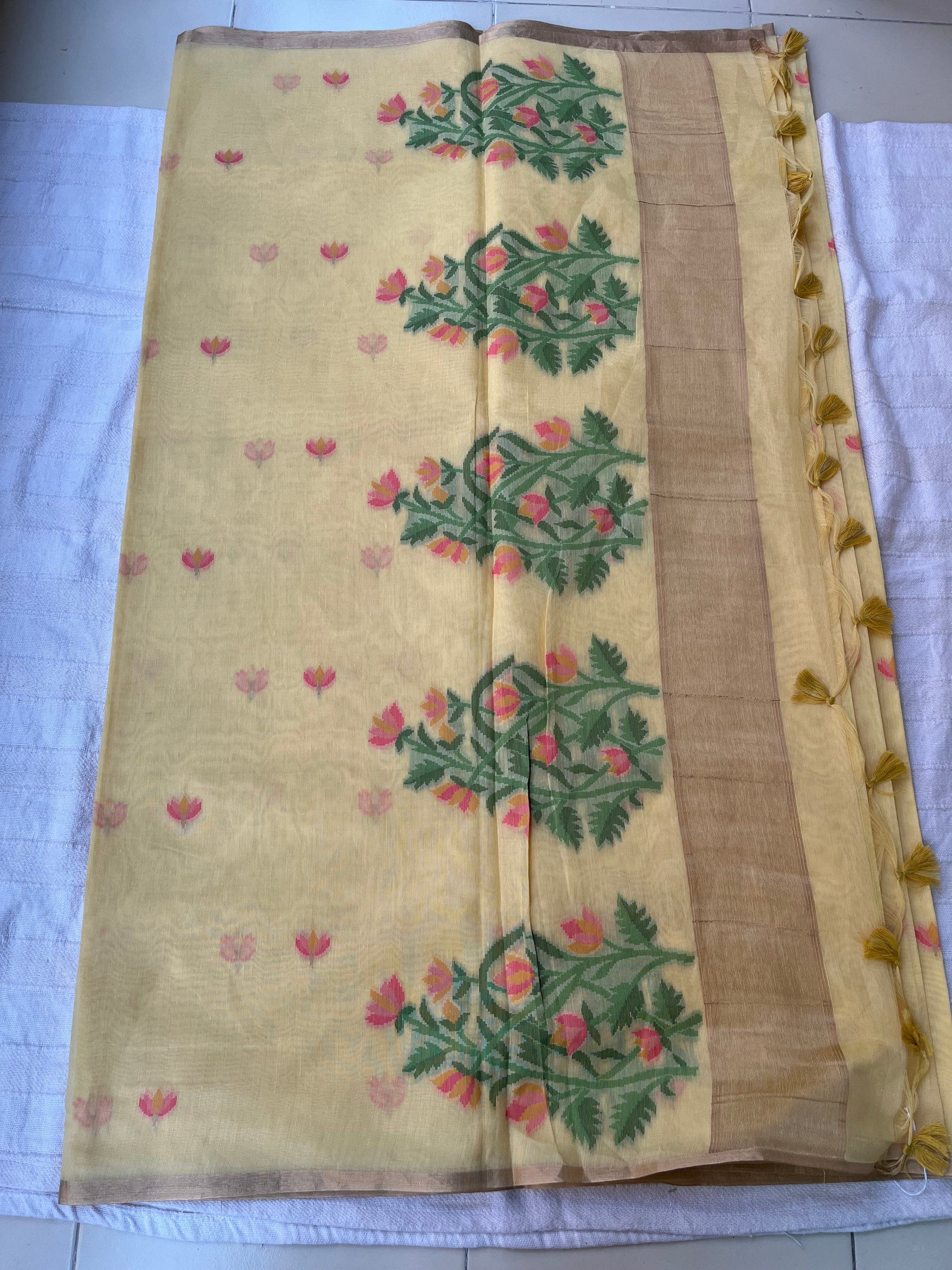 Chanderi Cotton Jamdani Saree - Lemon Yellow Lotus Motifs