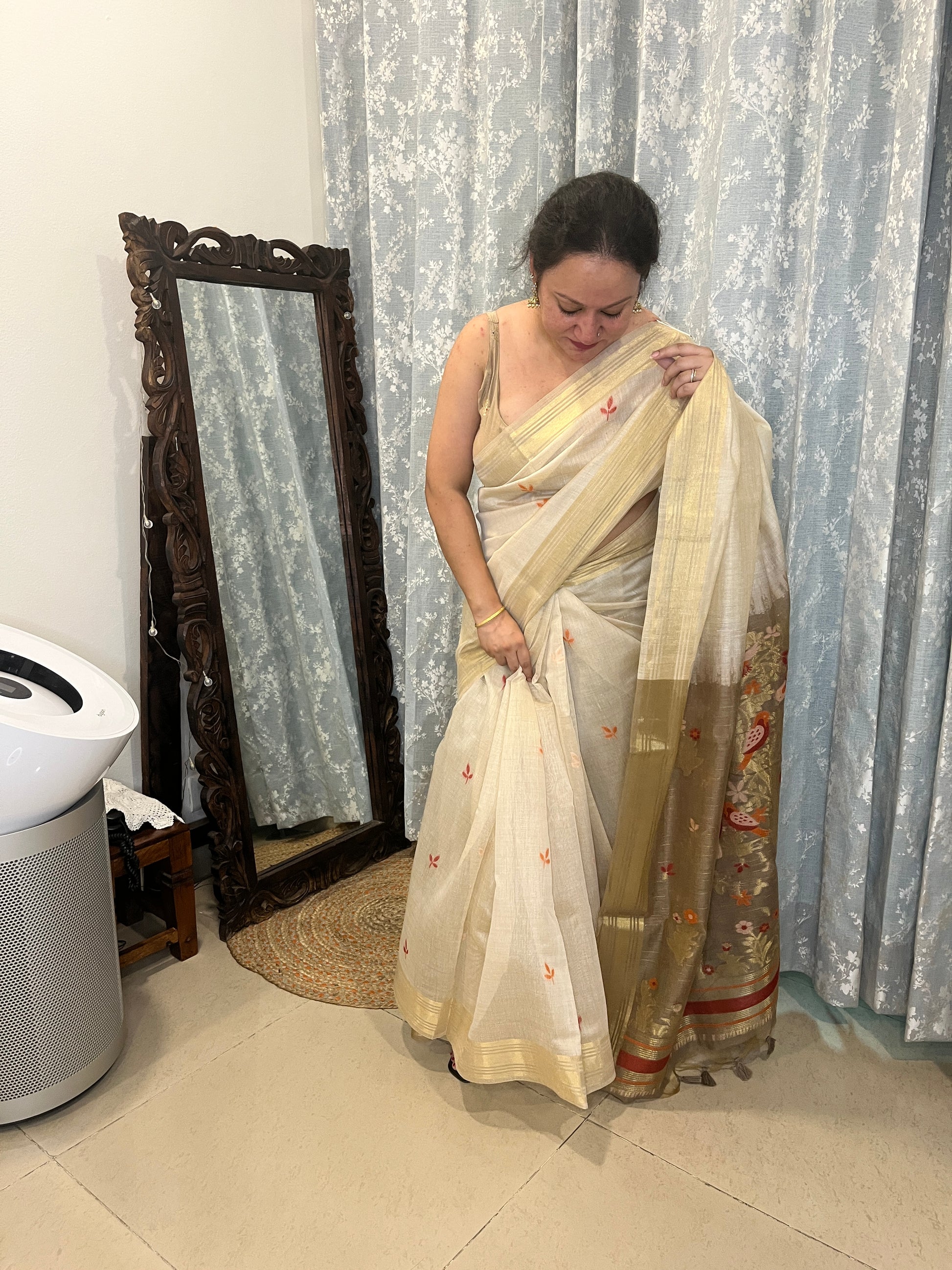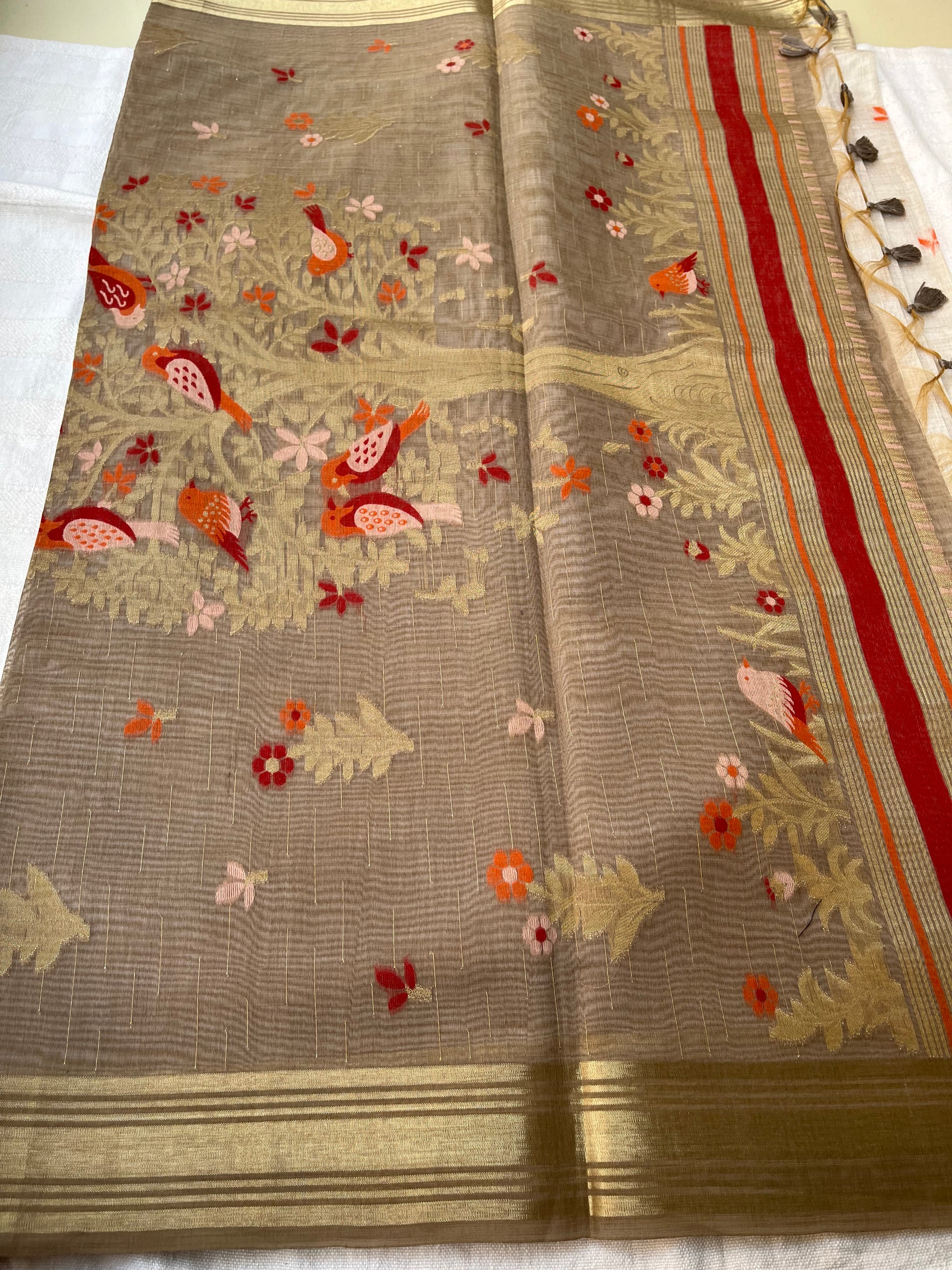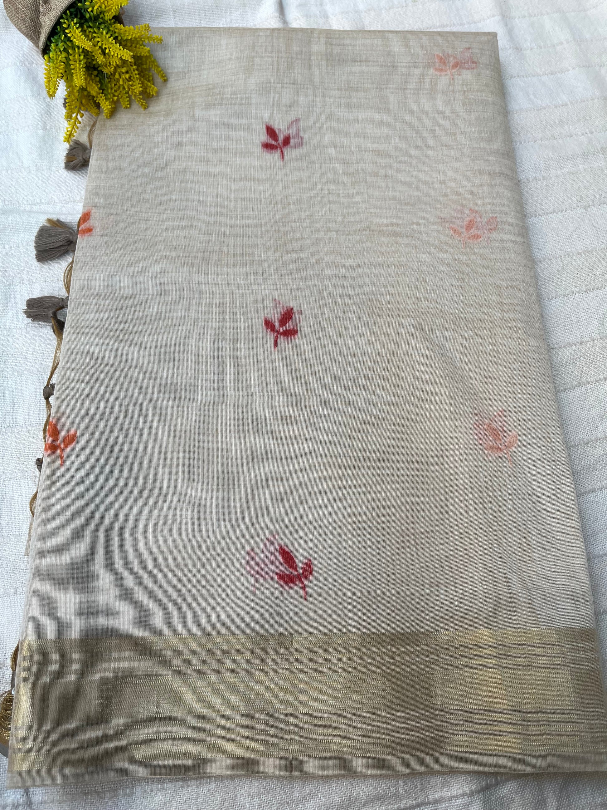 Chanderi Cotton Jamdani Saree - Ivory-Brown Bageecha