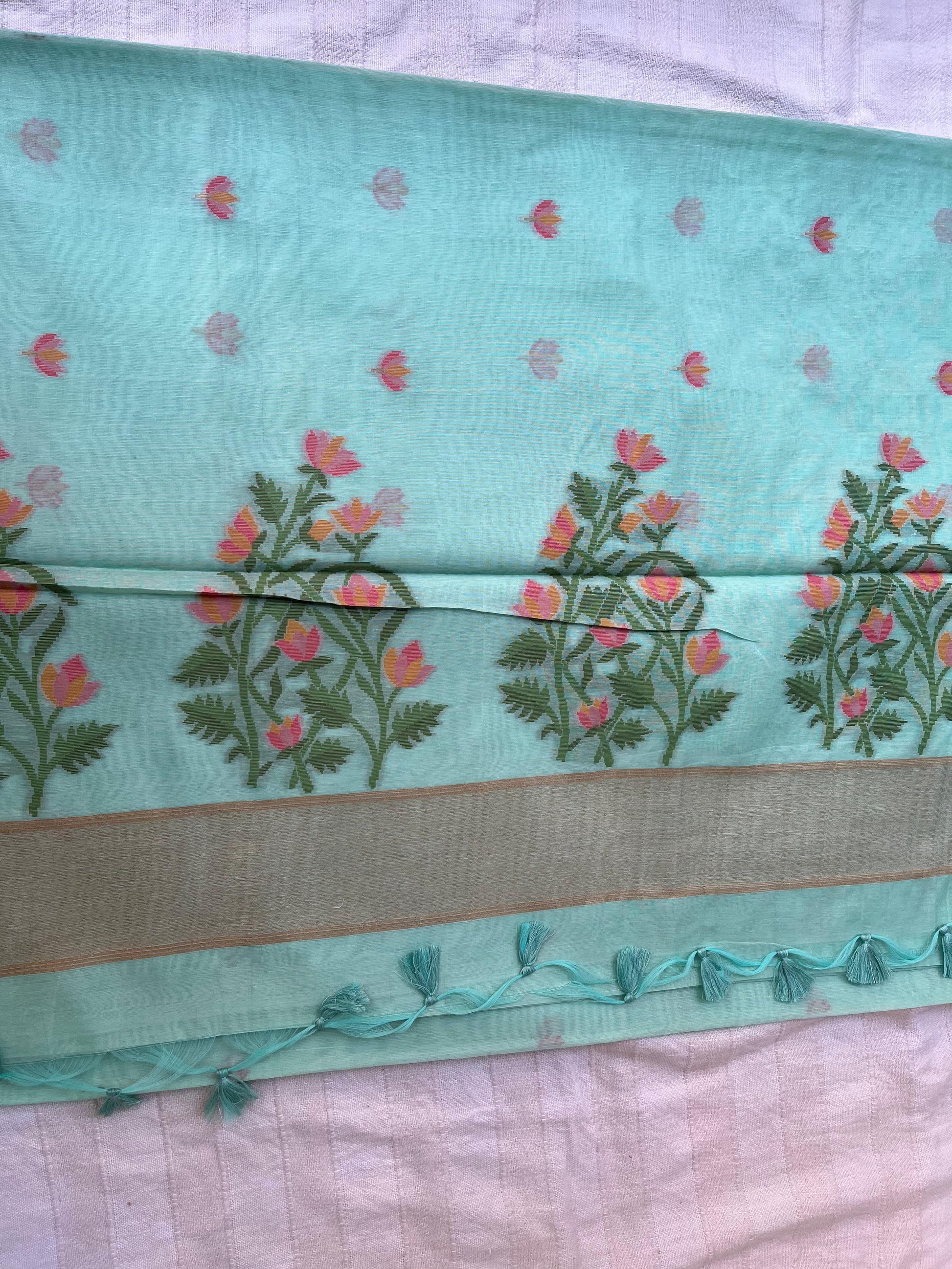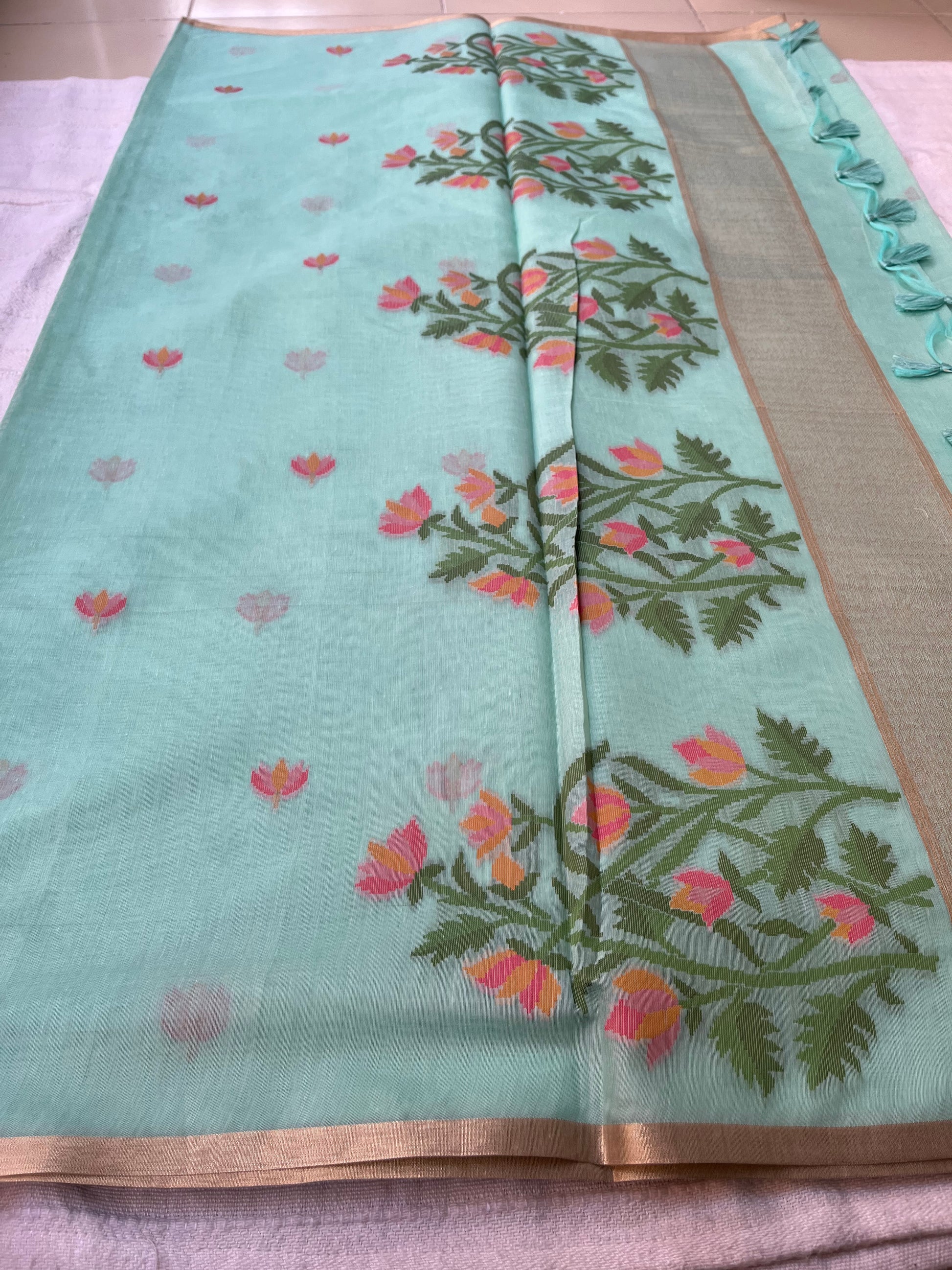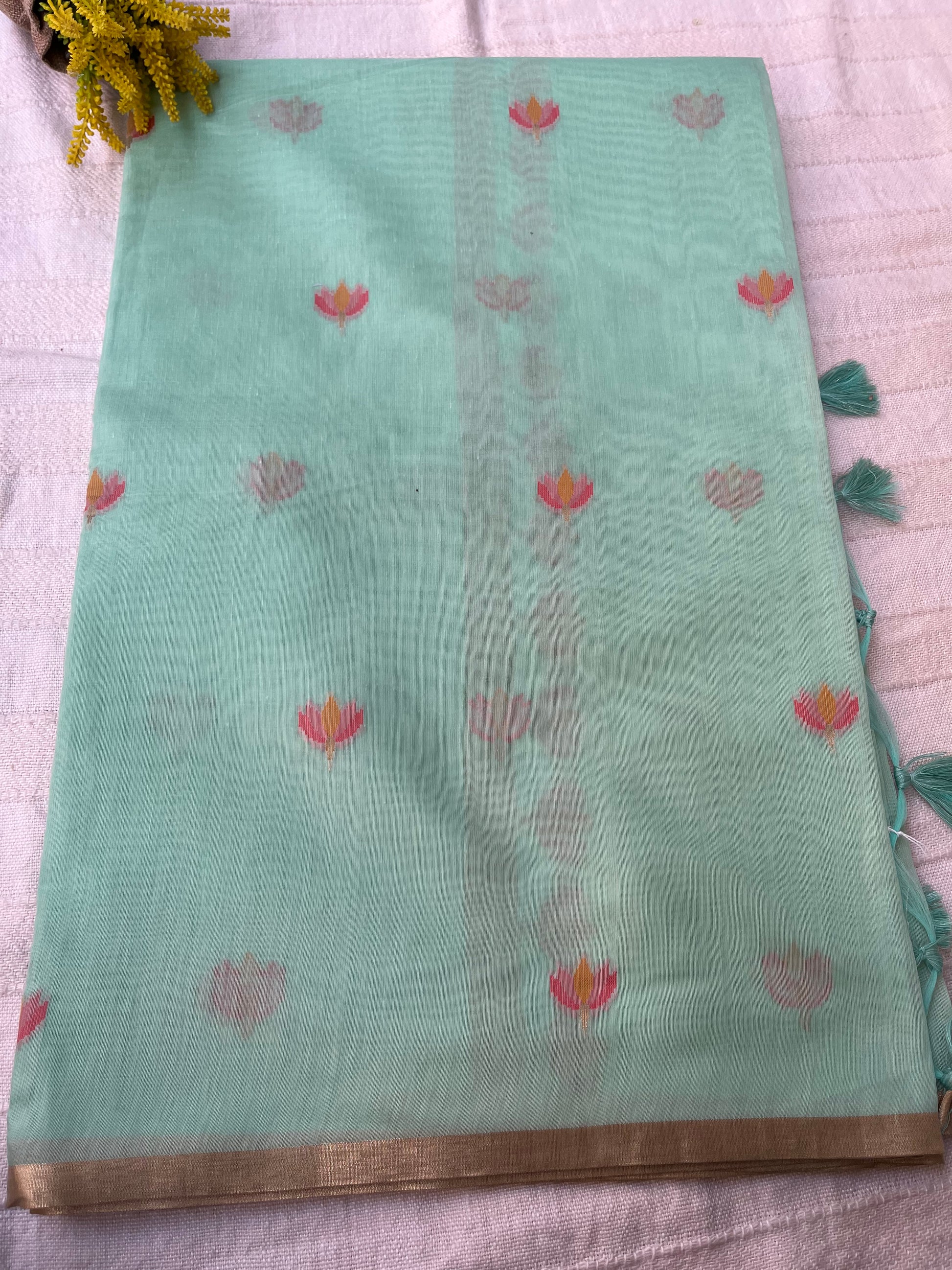 Chanderi Cotton Jamdani Saree - Pastel Sea-Green Lotus Motifs