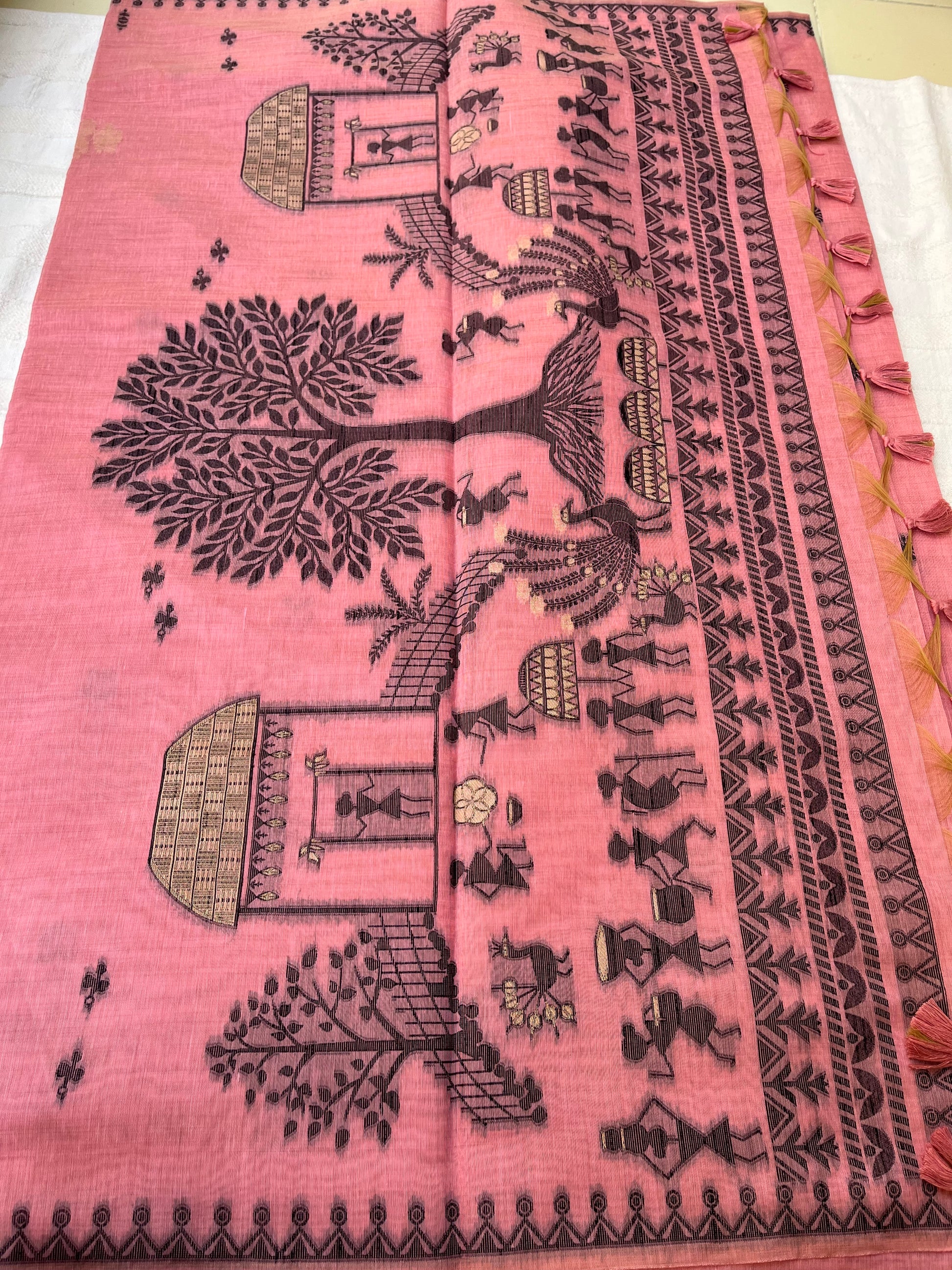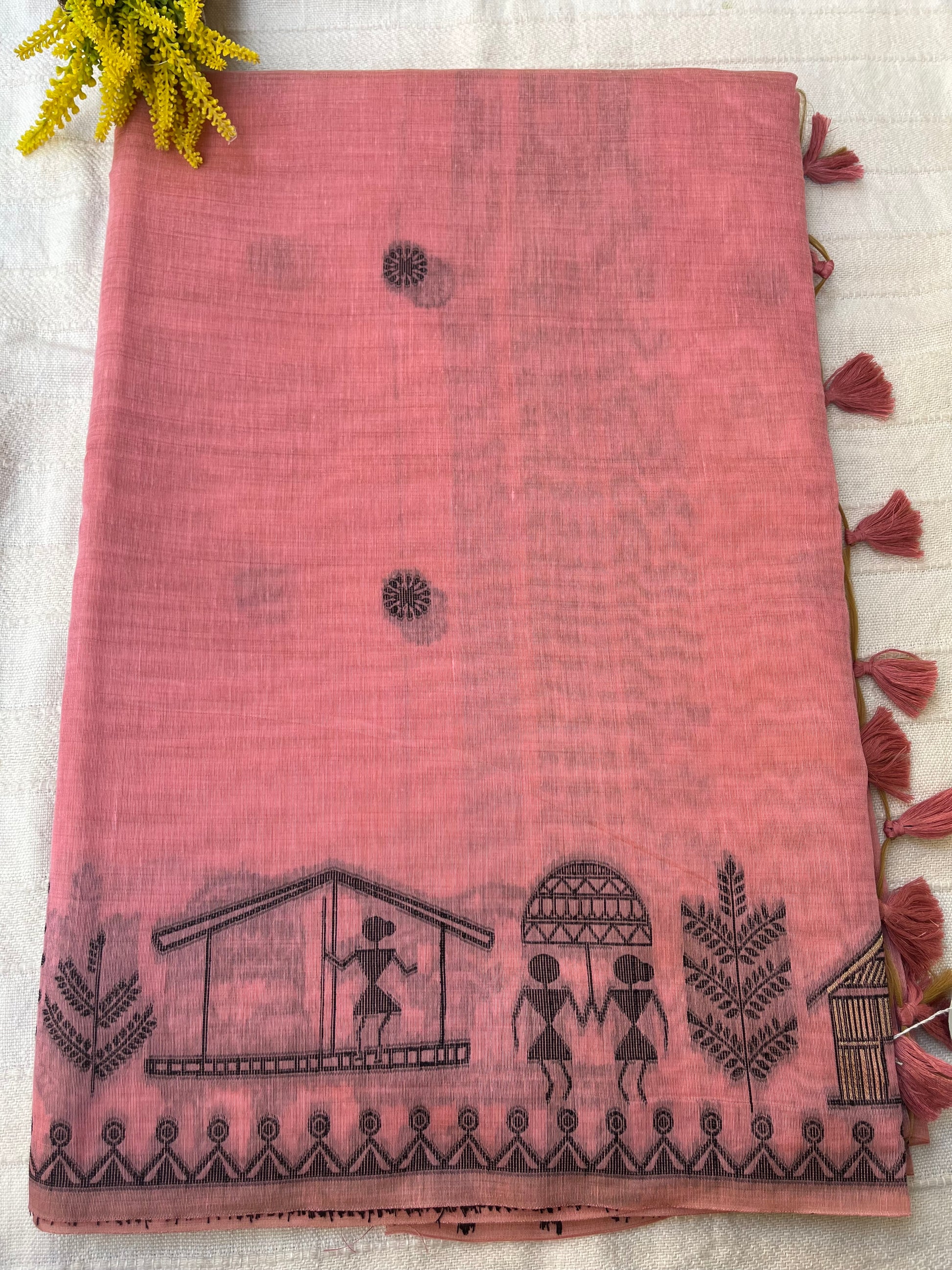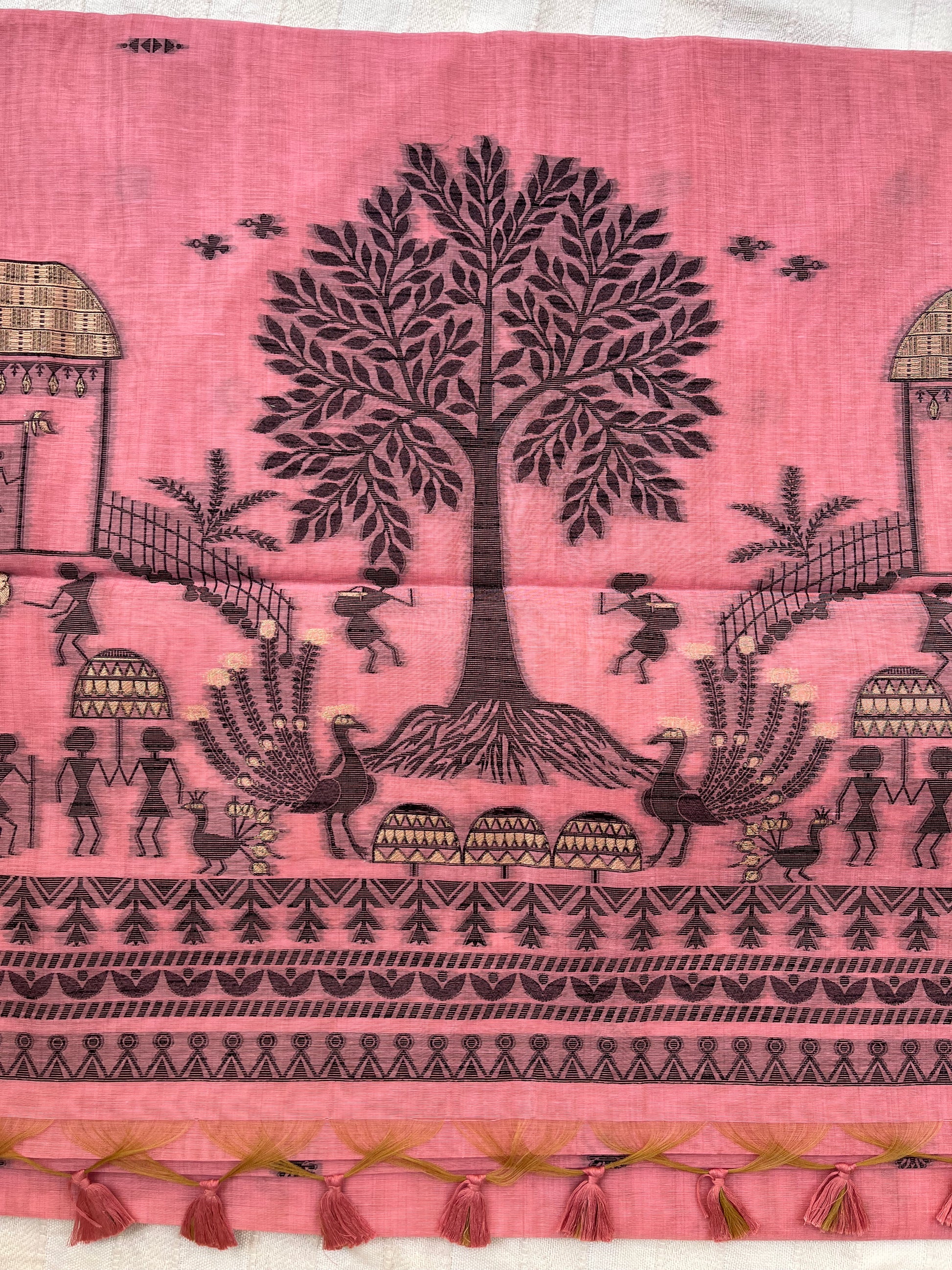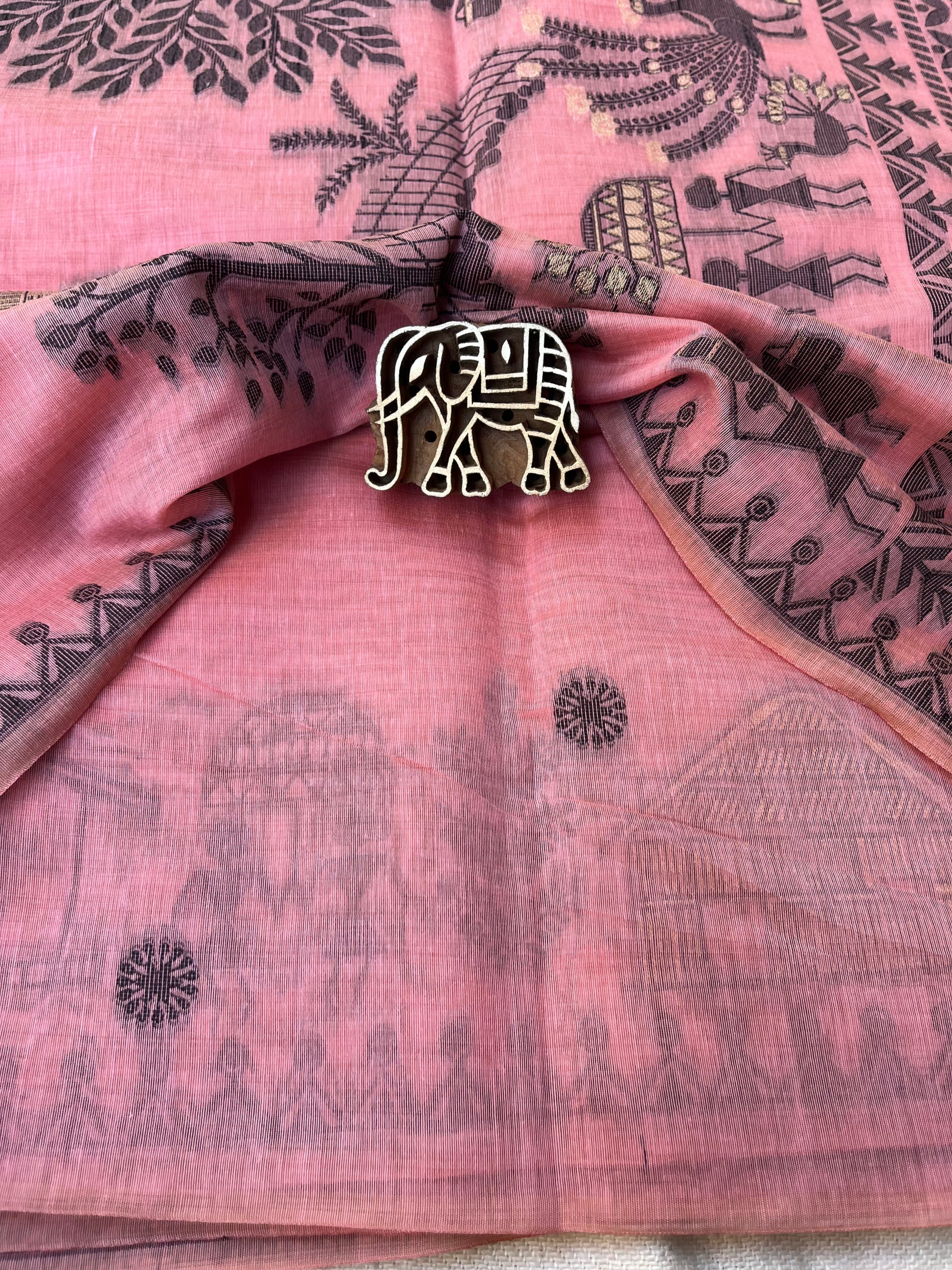 Chanderi Cotton Jamdani Saree - Pink Tribal Art