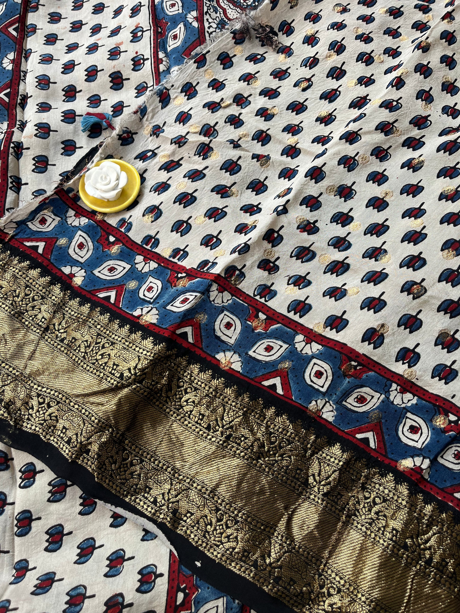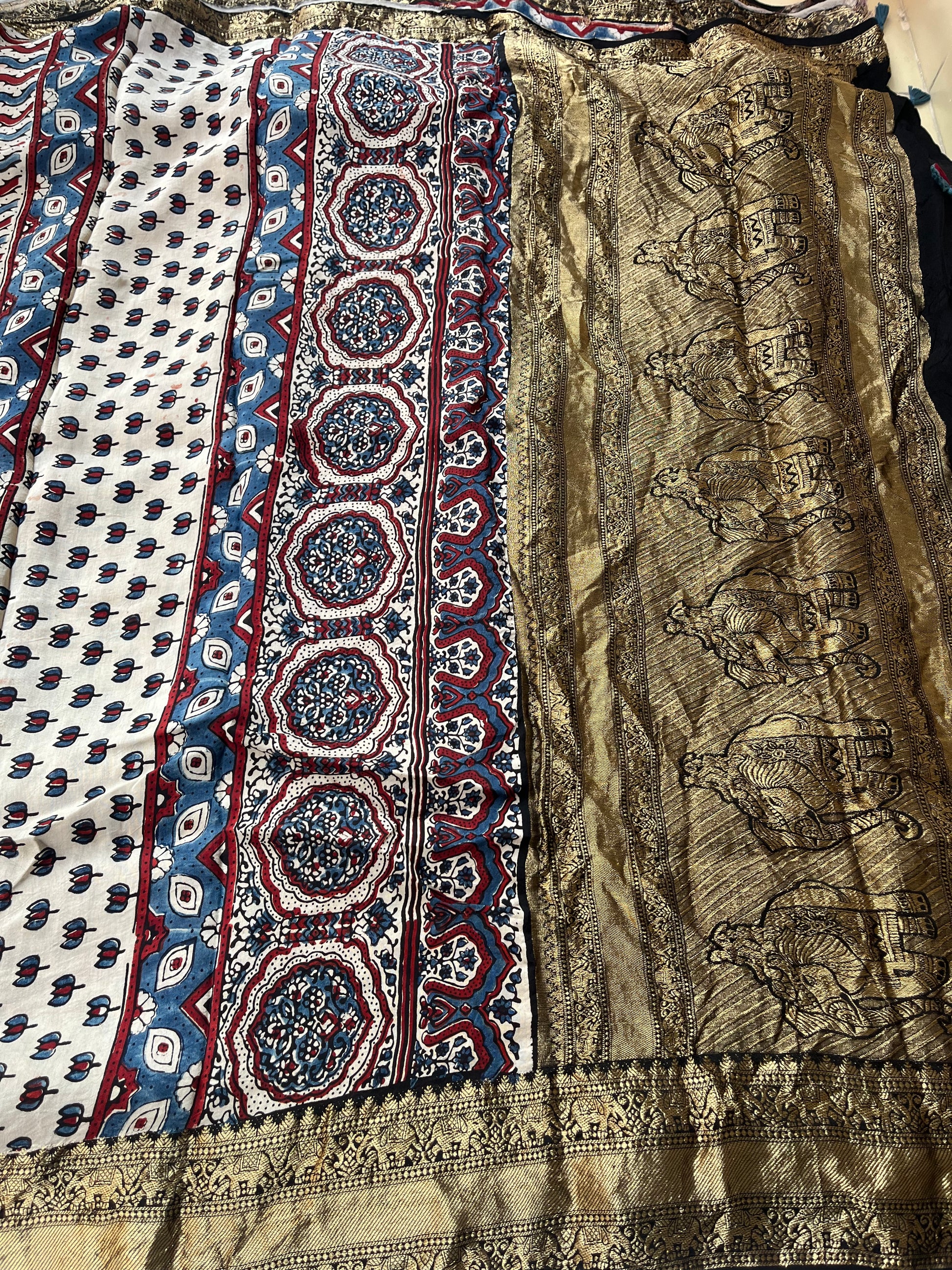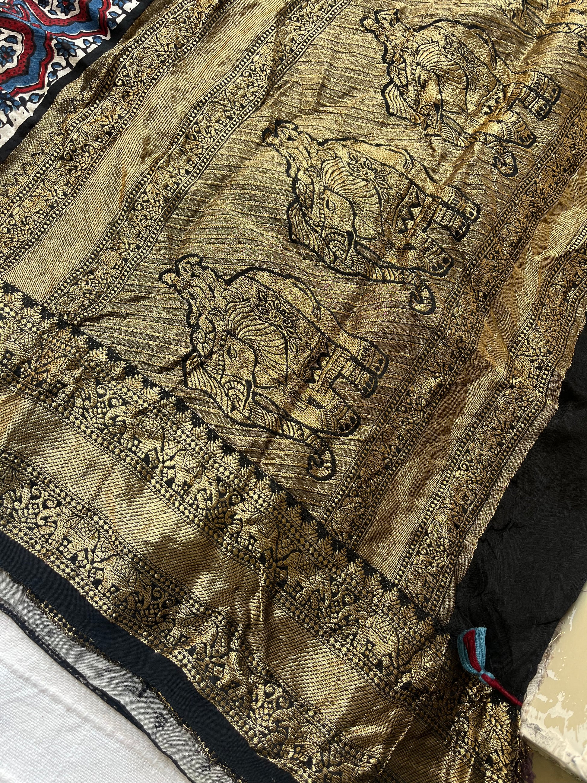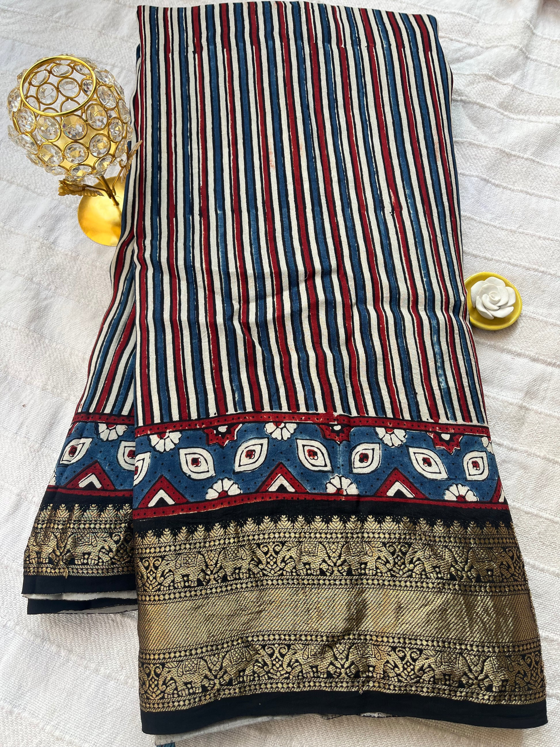Contemporary Ajrakh Dola Silk Saree - Black Stripes (with tassels)