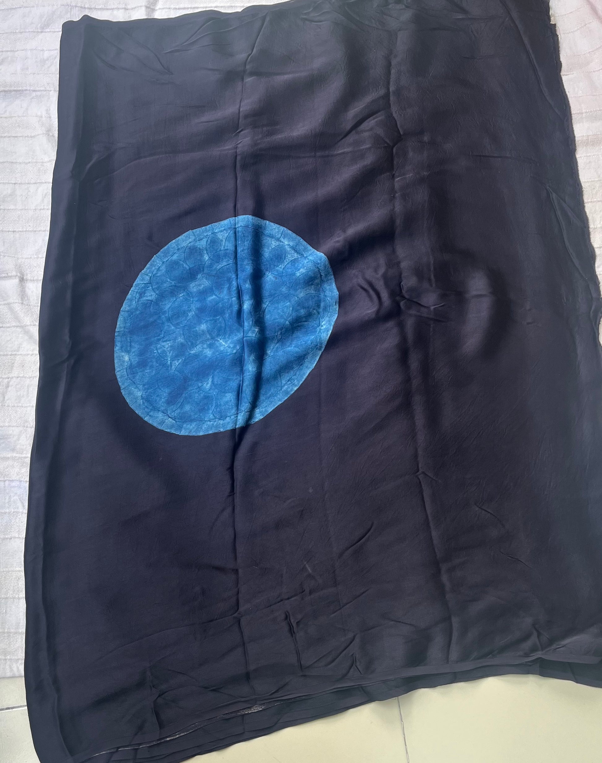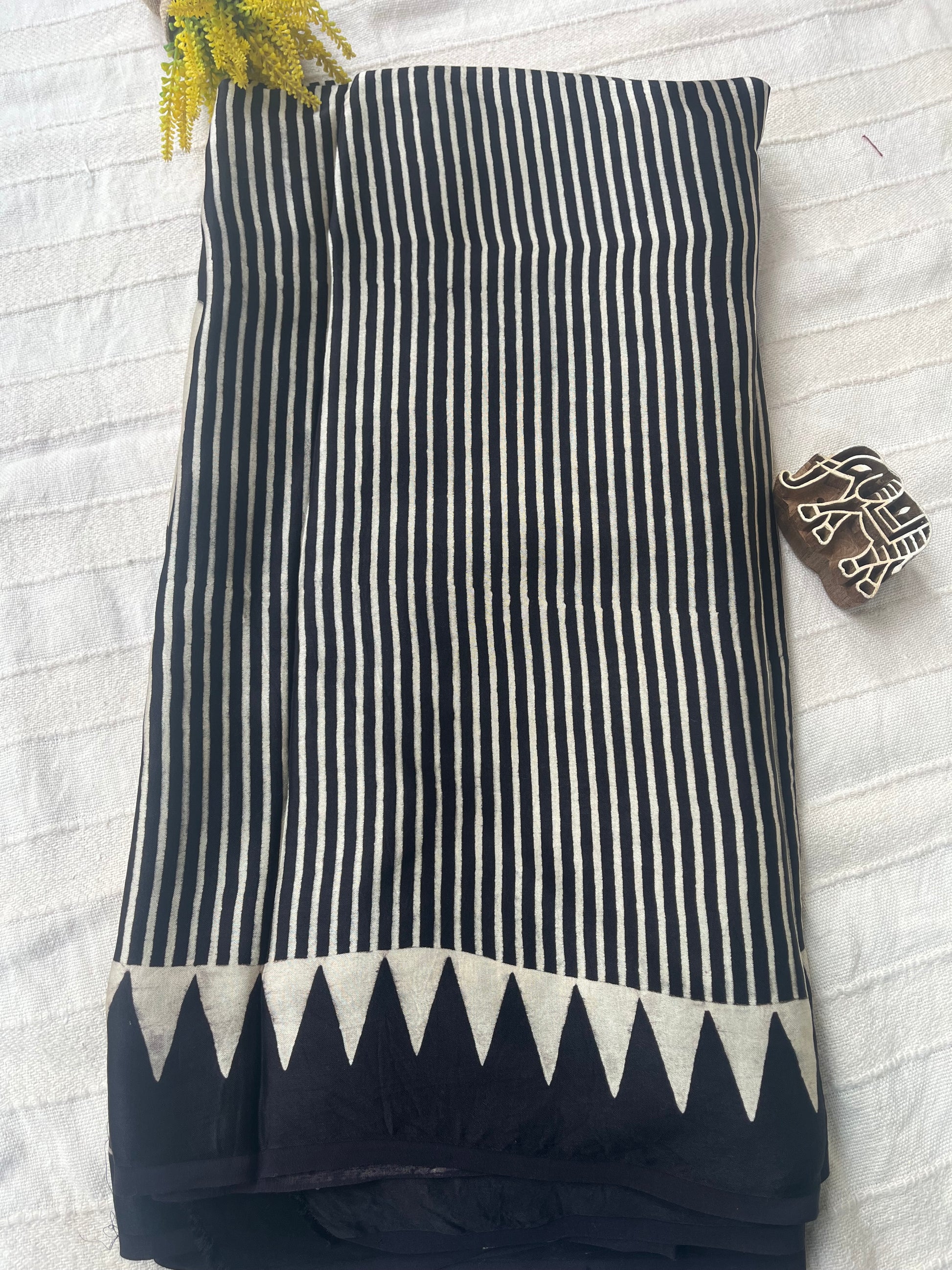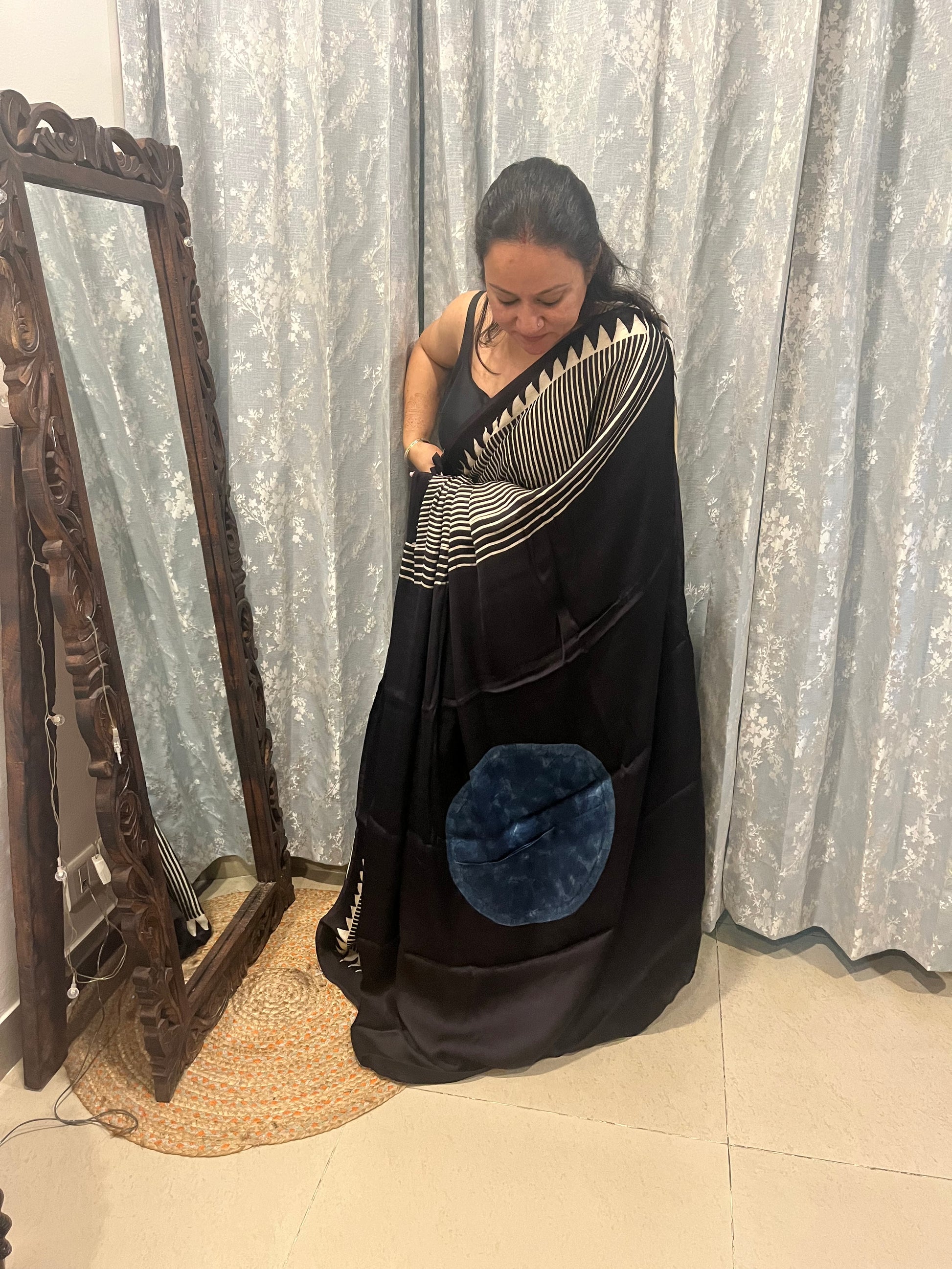 Contemporary Ajrakh Modal Silk Saree - Black Stripes with Big Blue Dot Palla