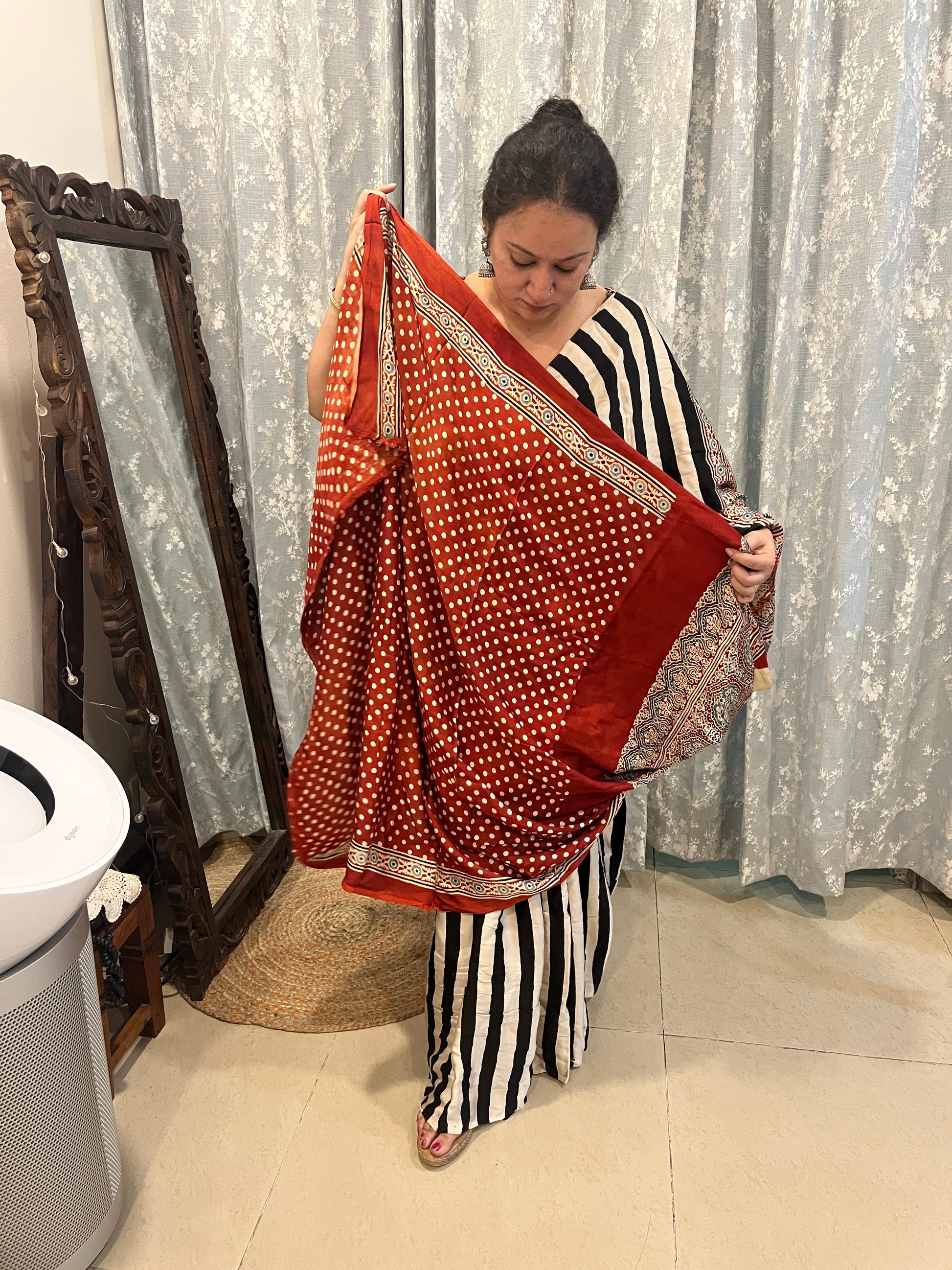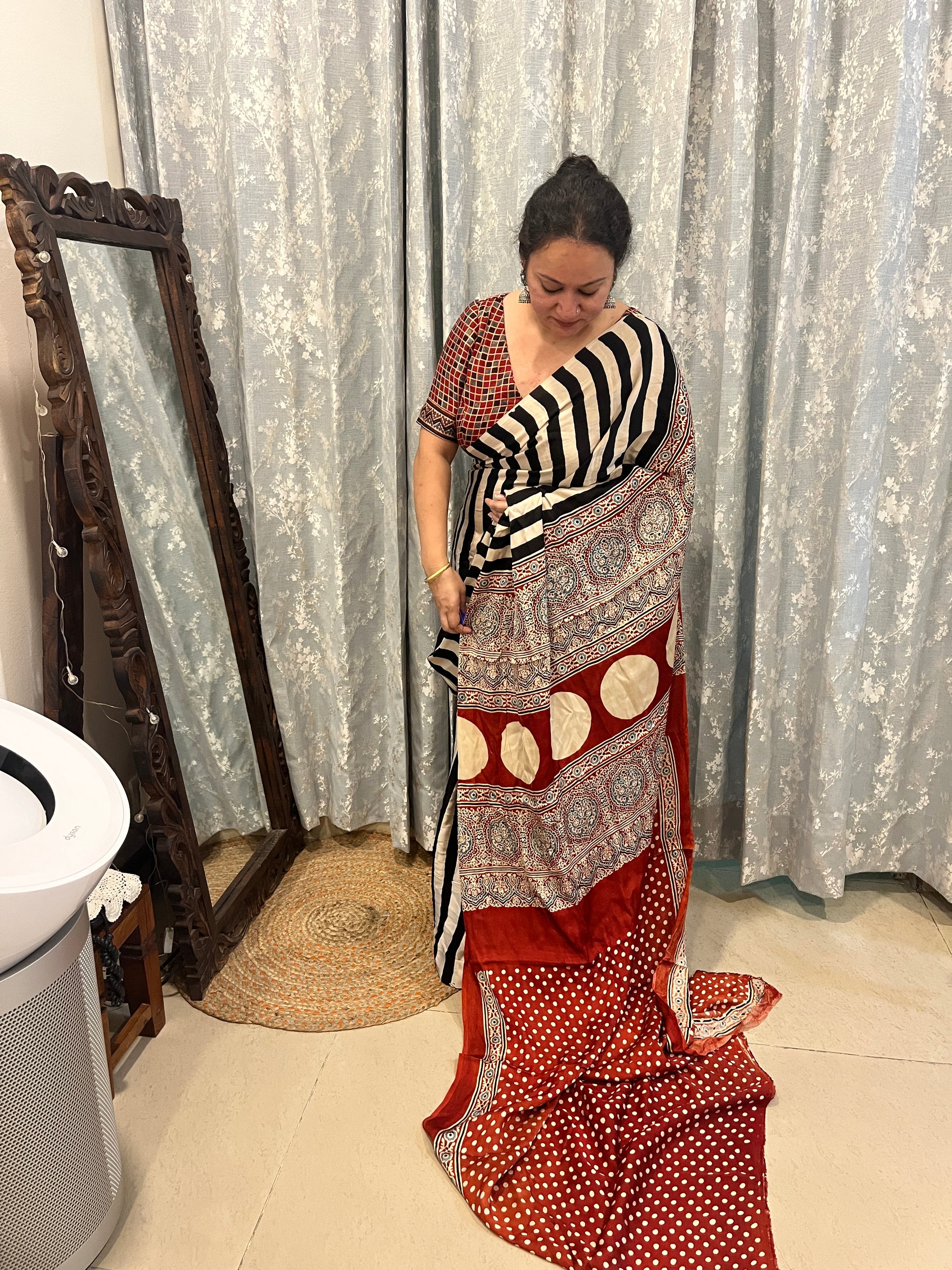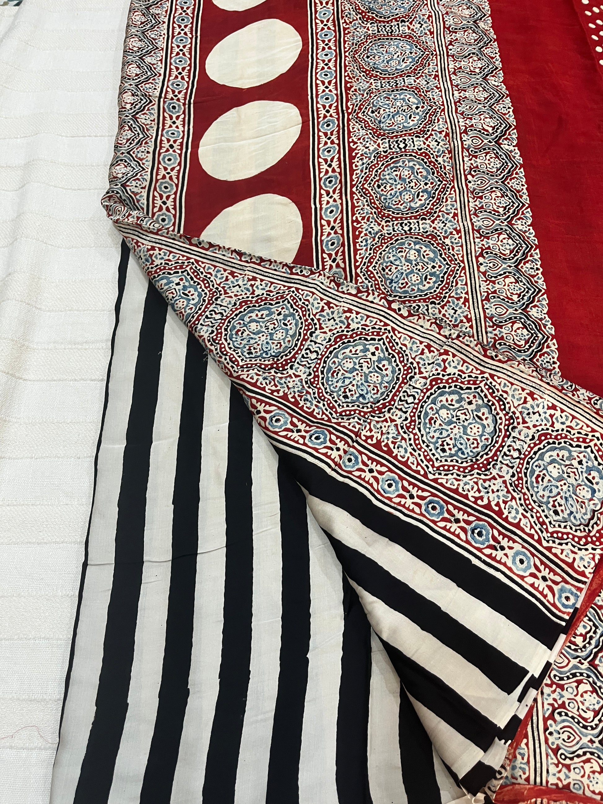 Discover the exquisite elegance of our Ajrakh modal silk sarees, where traditional artistry meets modern sophistication.