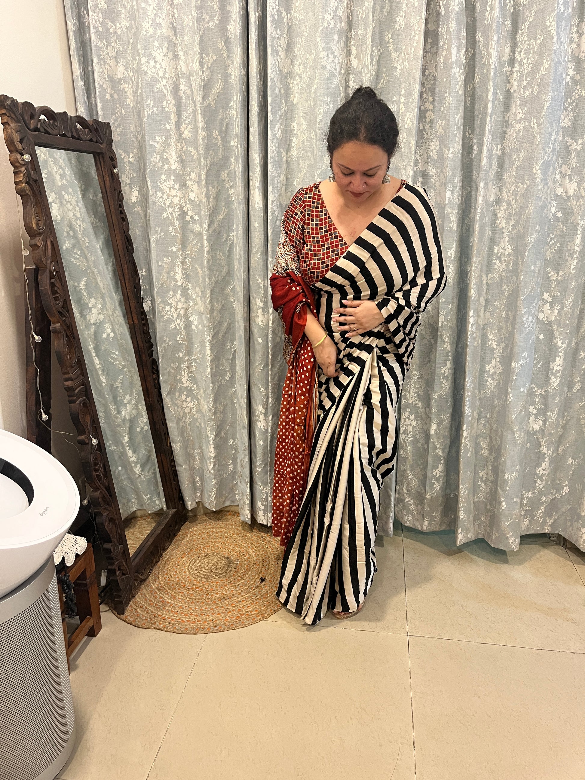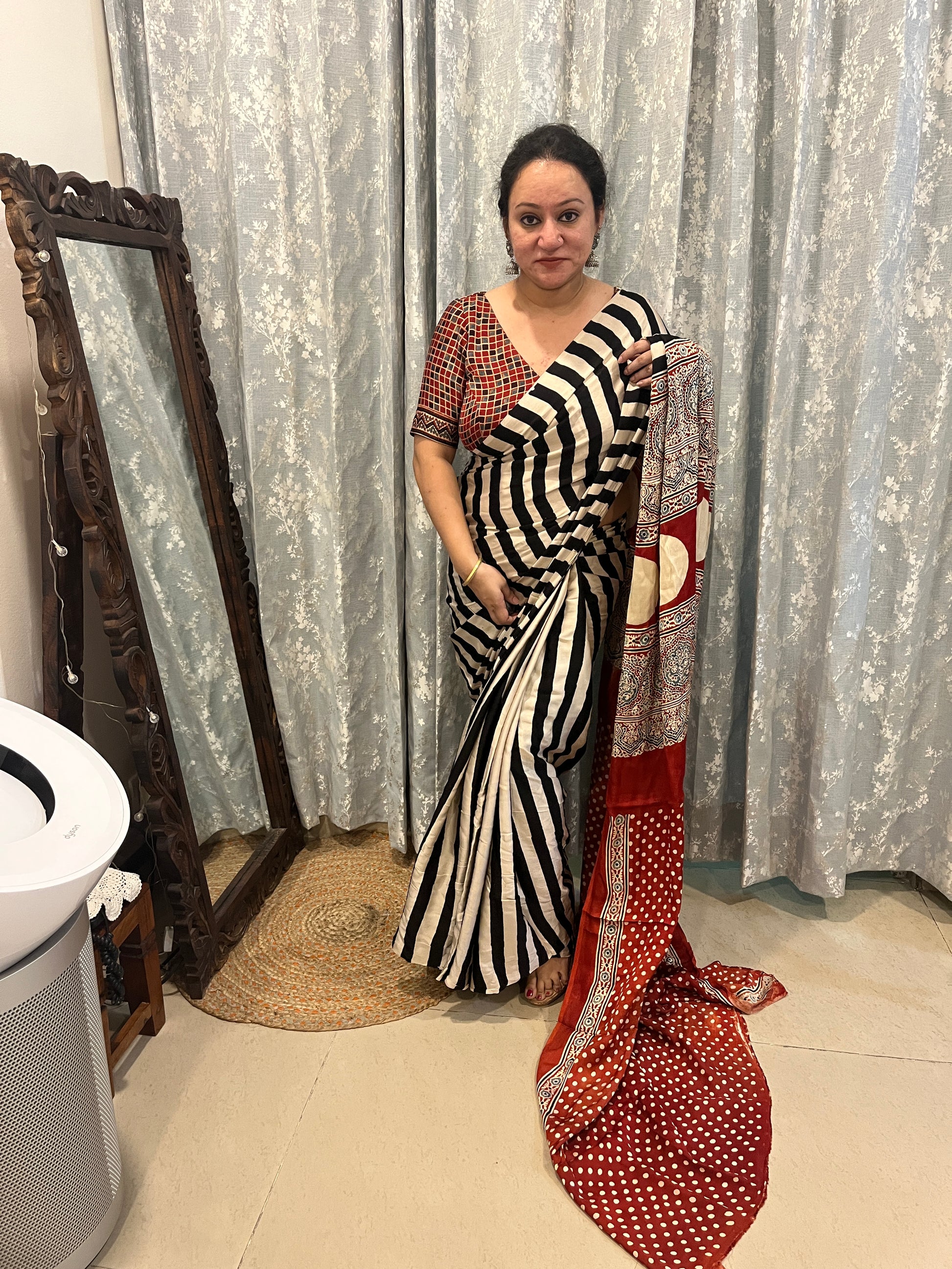 Contemporary Ajrakh Modal Silk Saree - Black Stripes with Red Palla
