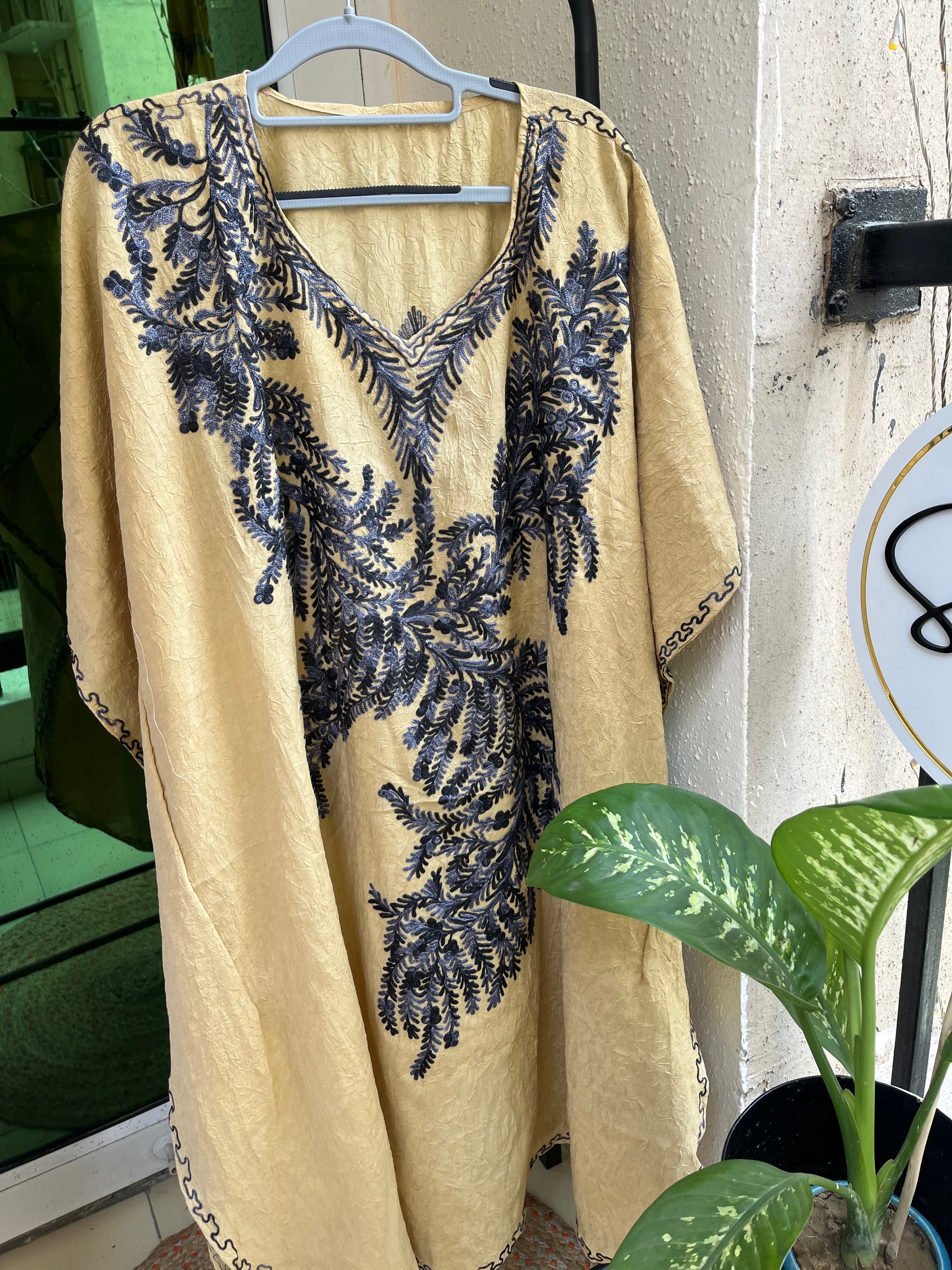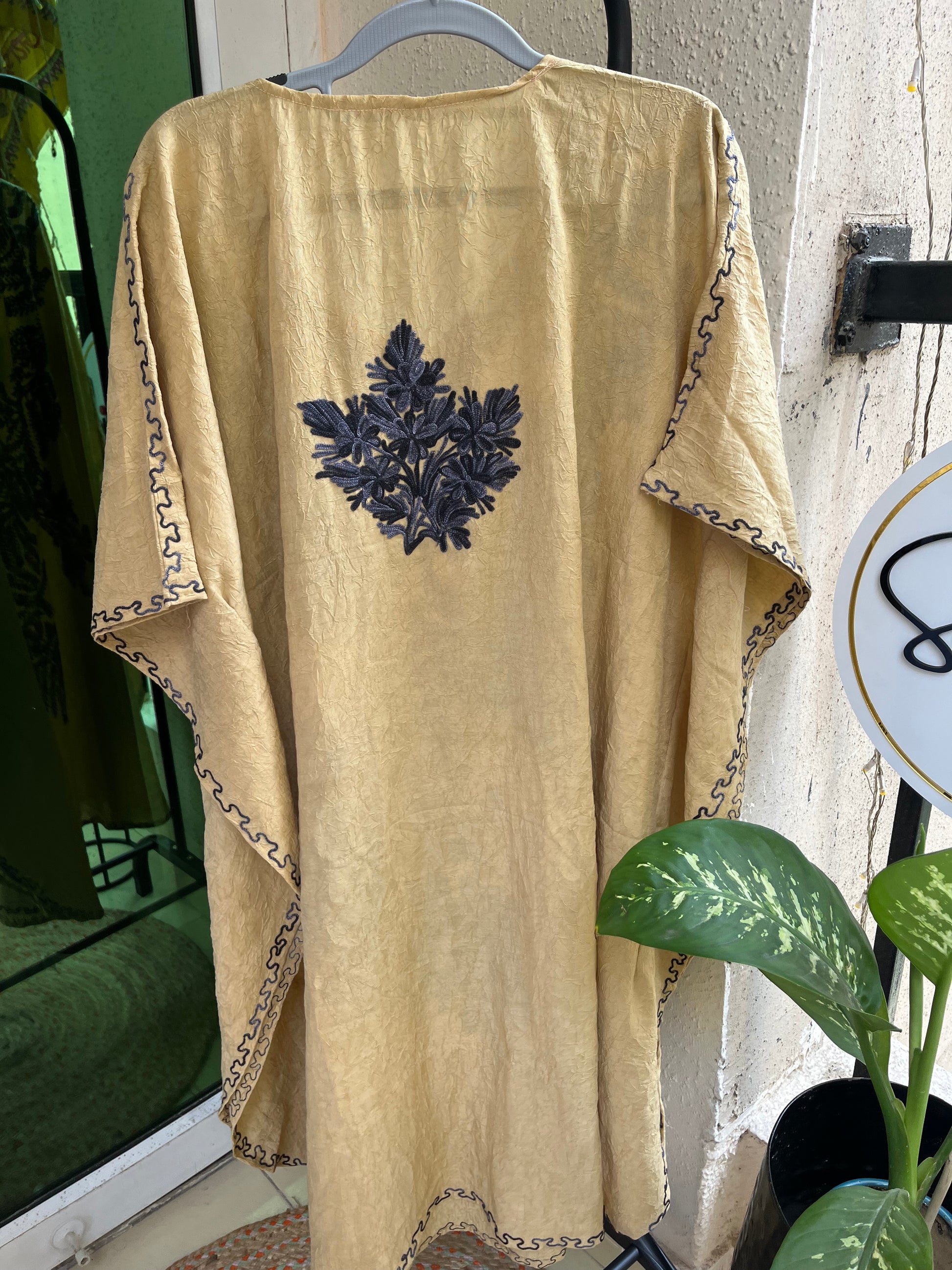 Effortlessly elegant and incredibly comfortable, our Crush Cotton Kashmiri Aariwork Kaftans are a beautiful blend of tradition and ease.