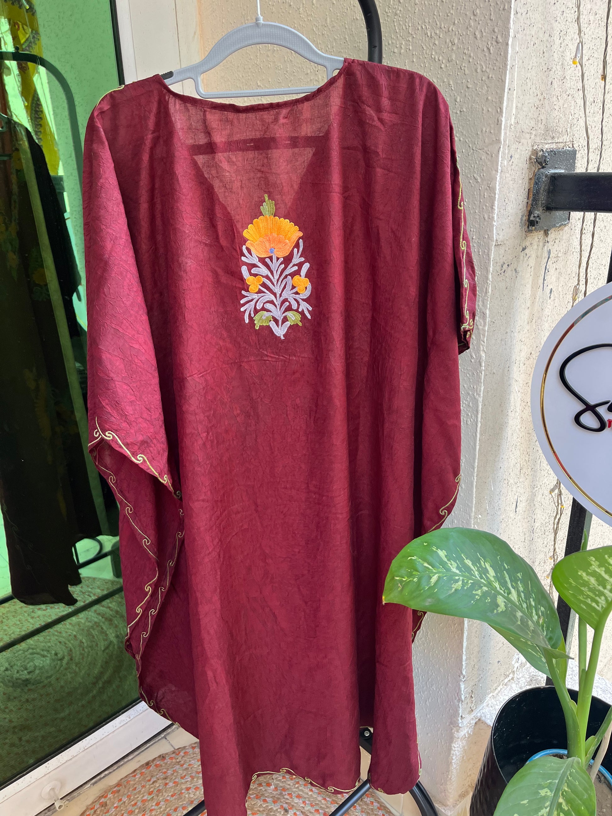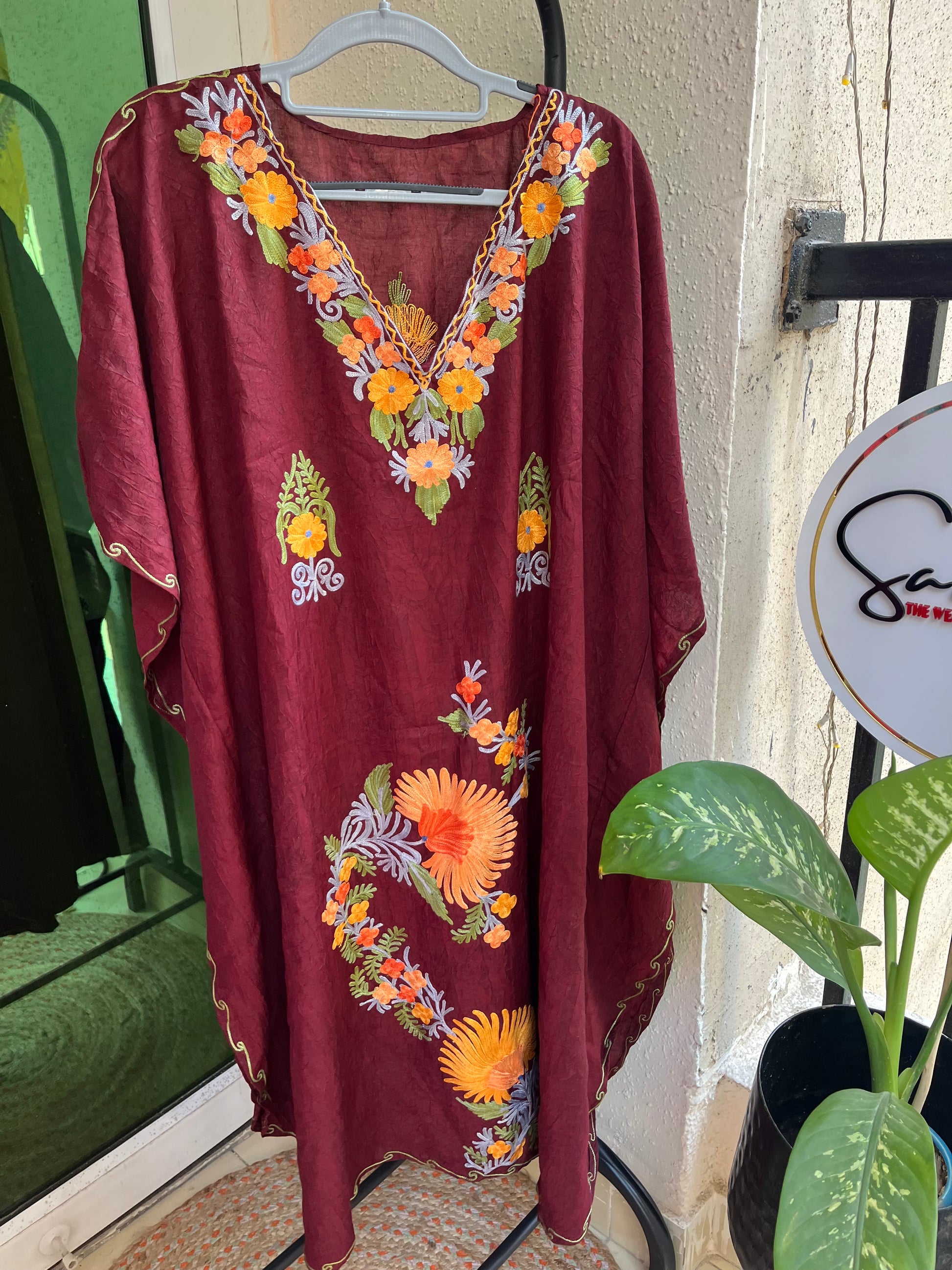 Effortlessly elegant and incredibly comfortable, our Crush Cotton Kashmiri Aariwork Kaftans are a beautiful blend of tradition and ease.