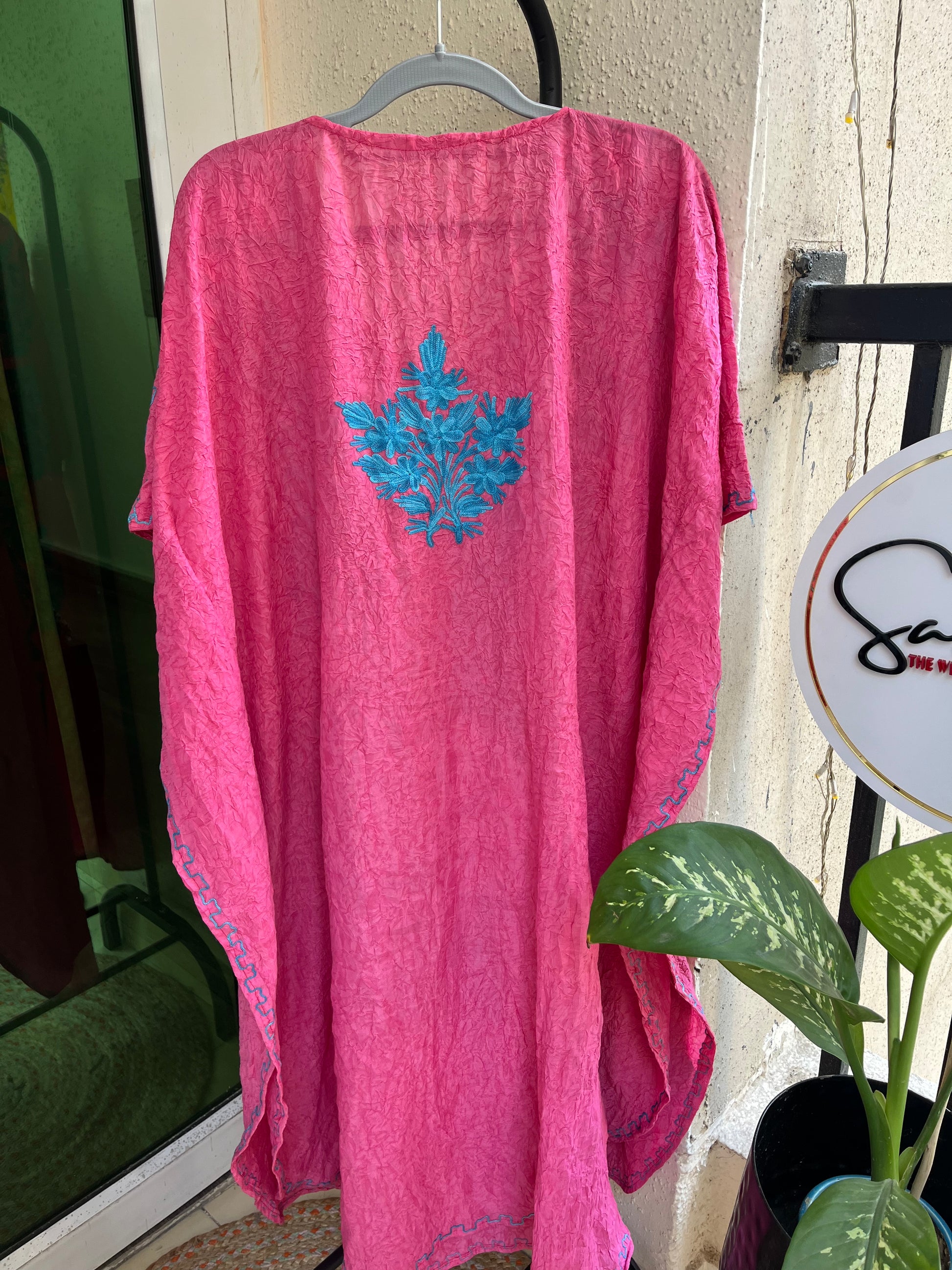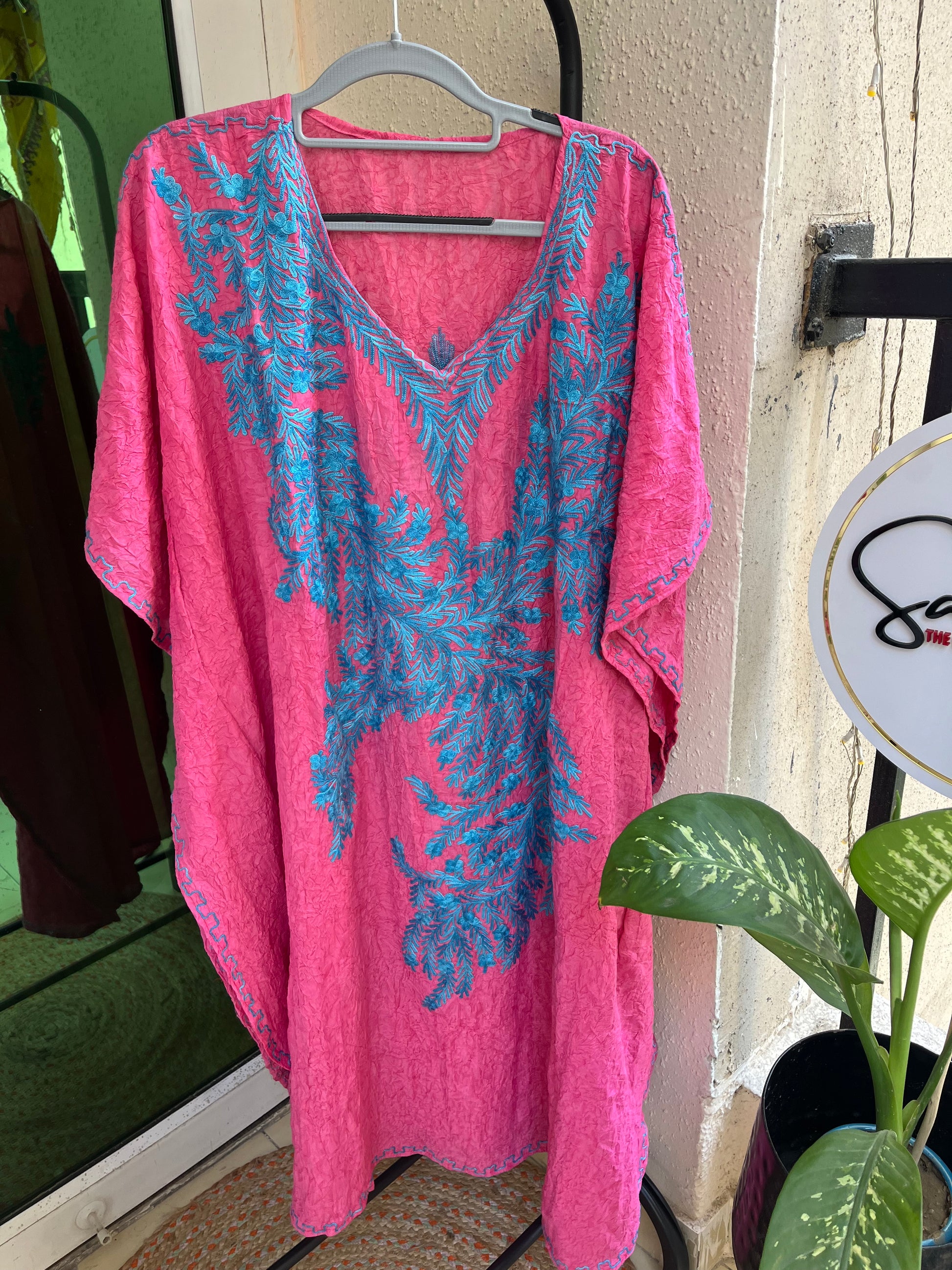 Effortlessly elegant and incredibly comfortable, our Crush Cotton Kashmiri Aariwork Kaftans are a beautiful blend of tradition and ease.