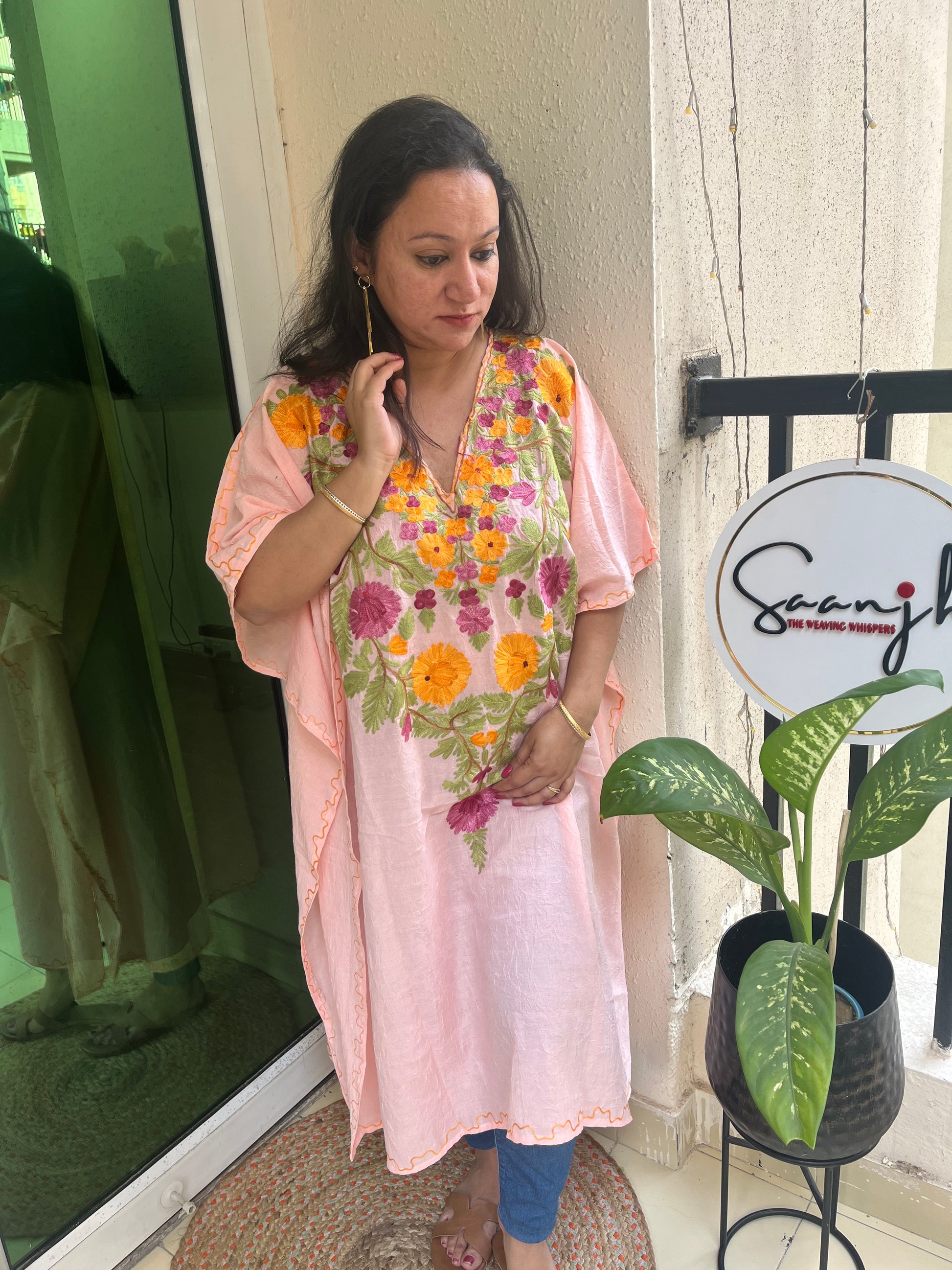Effortlessly elegant and incredibly comfortable, our Crush Cotton Kashmiri Aariwork Kaftans are a beautiful blend of tradition and ease.