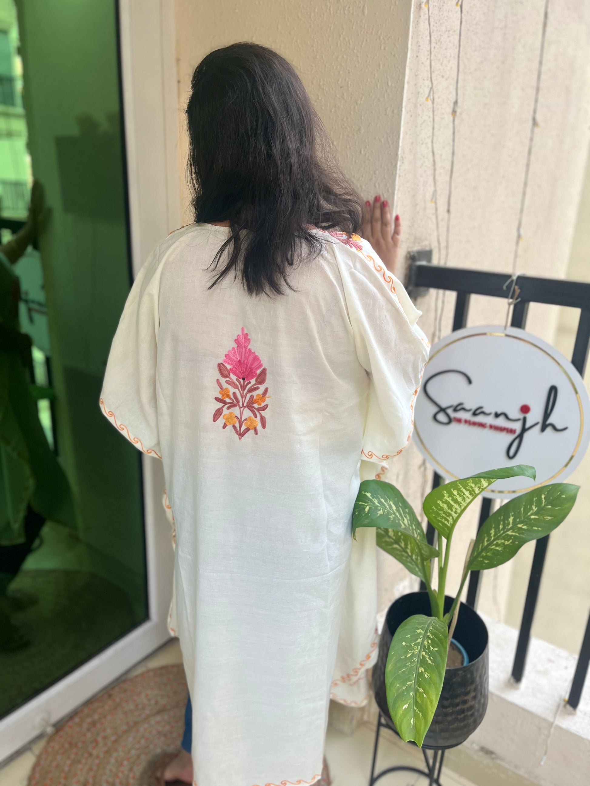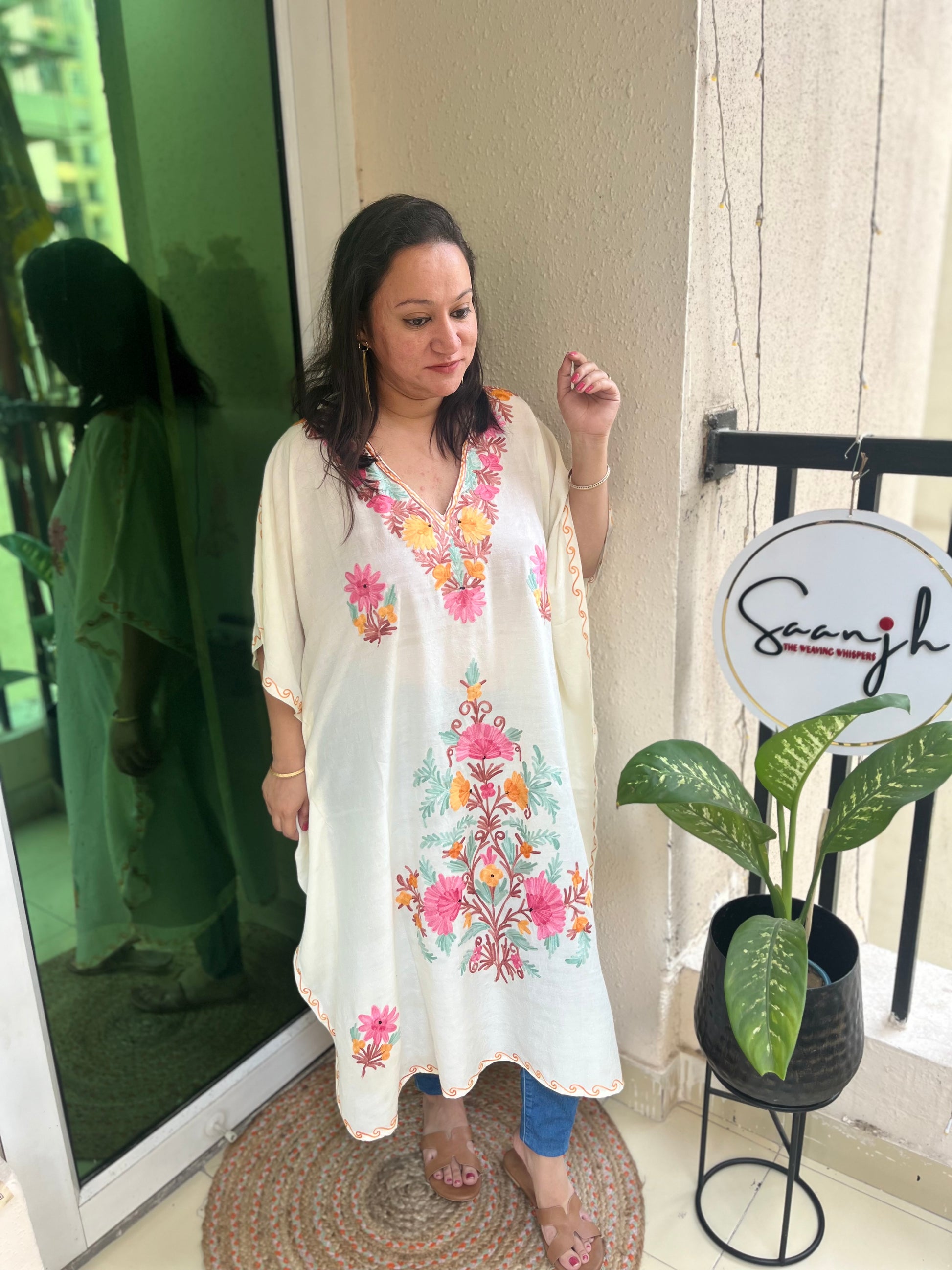 Effortlessly elegant and incredibly comfortable, our Crush Cotton Kashmiri Aariwork Kaftans are a beautiful blend of tradition and ease.