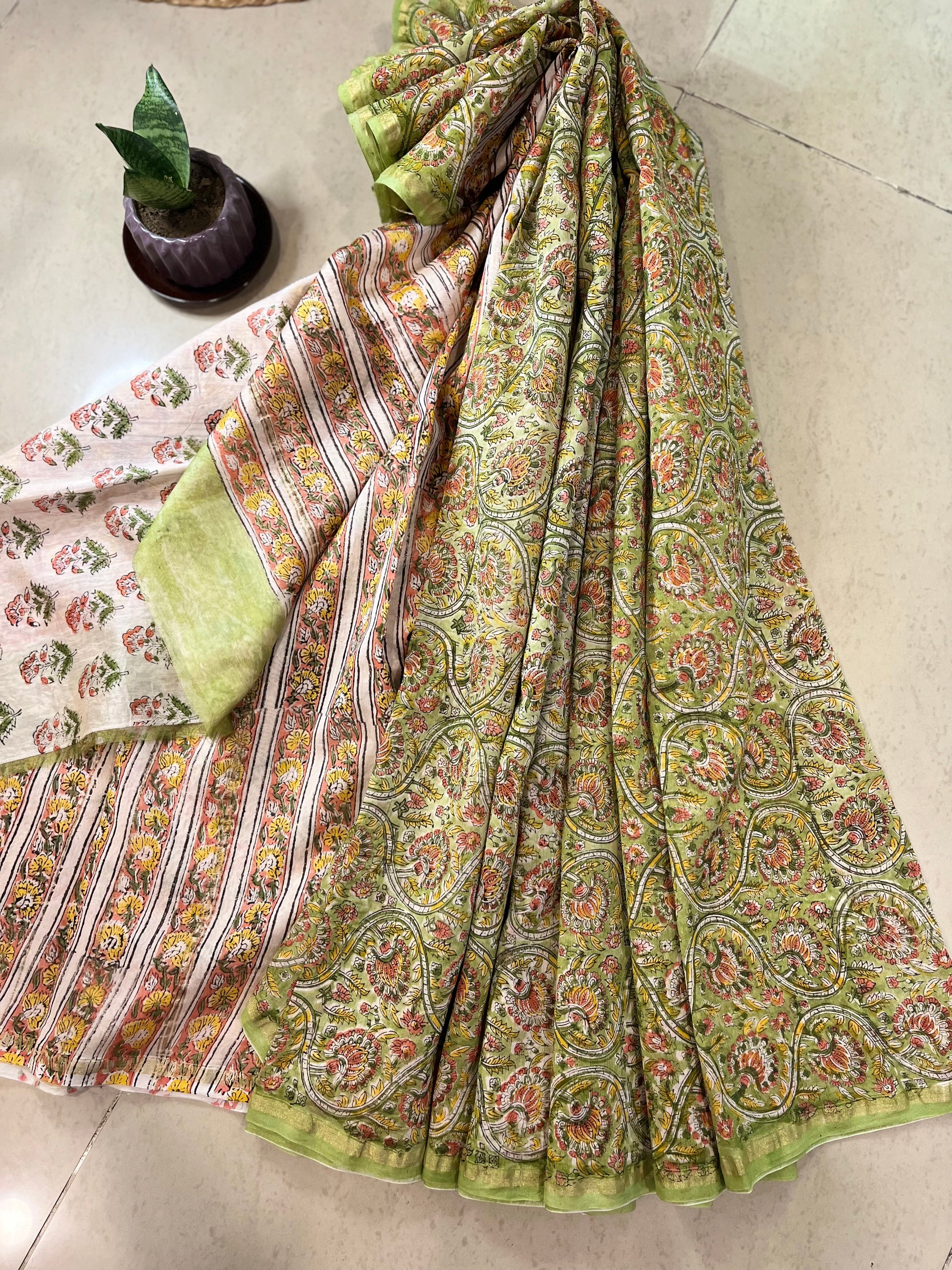 Green Sanganer Handblock Chanderi Cotton Silk Saree
