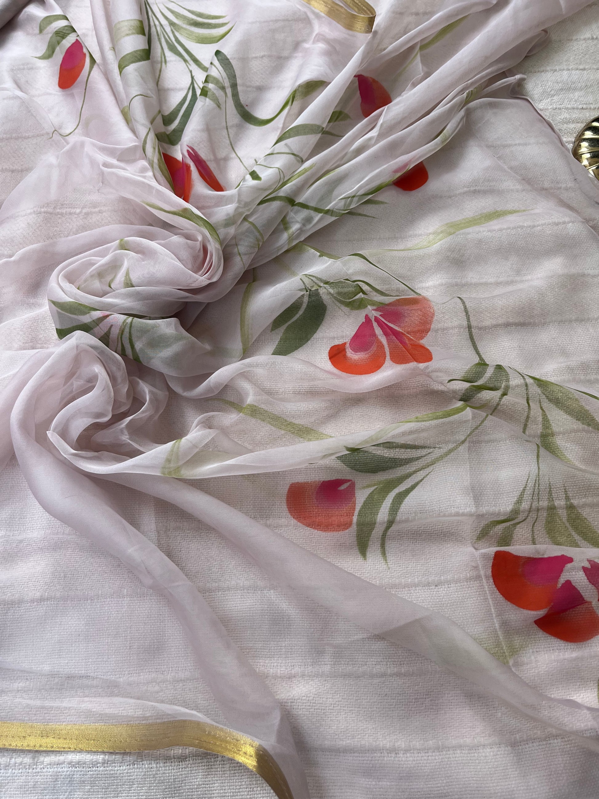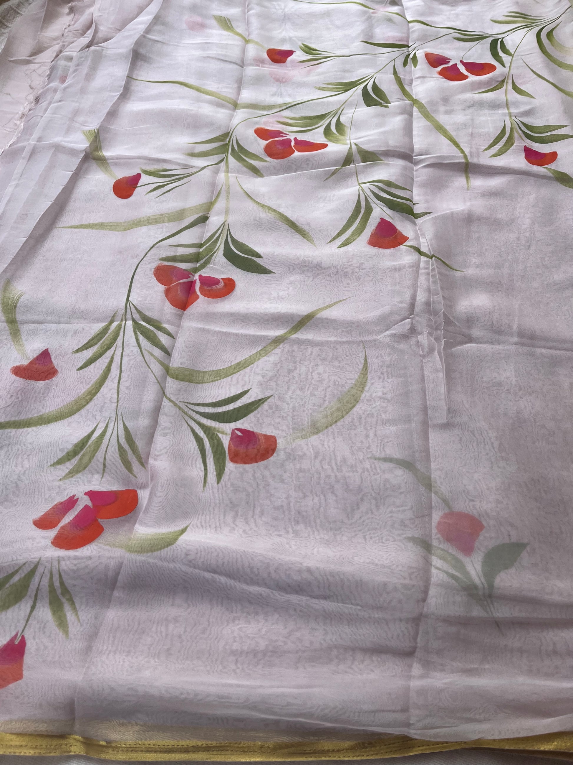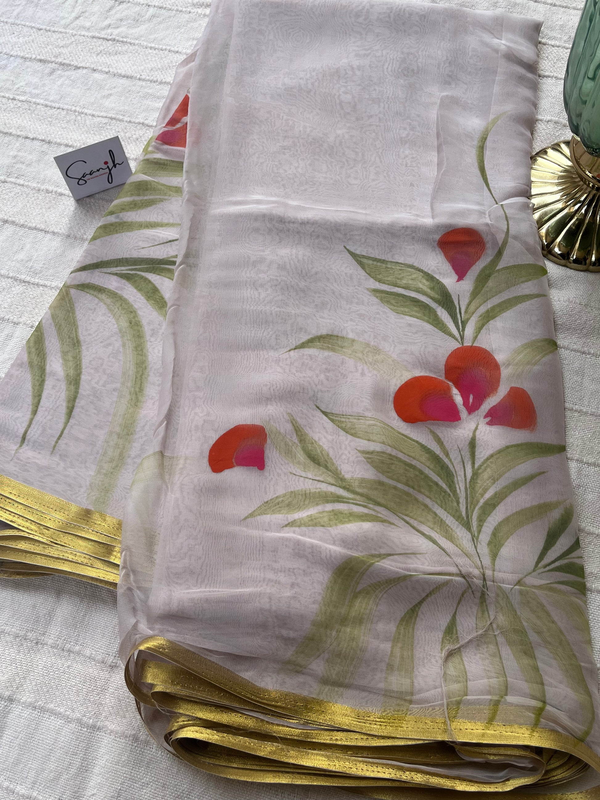 Drape yourself in elegance with our exquisite Hand-Painted Chiffon Saree, a true masterpiece of craftsmanship and artistry. Each saree is meticulously hand-painted by skilled artisans, ensuring that every piece is unique and tells its own story.
