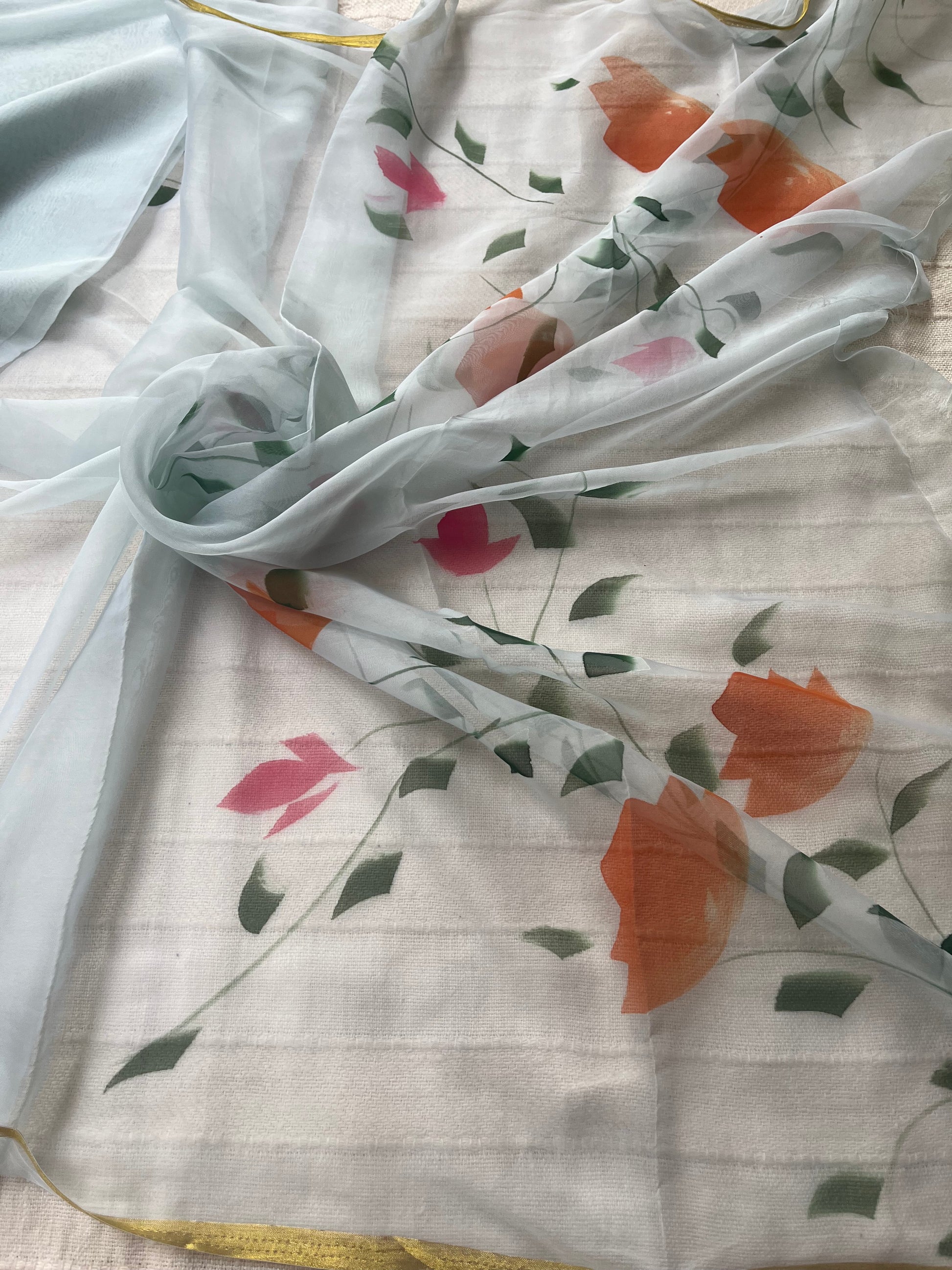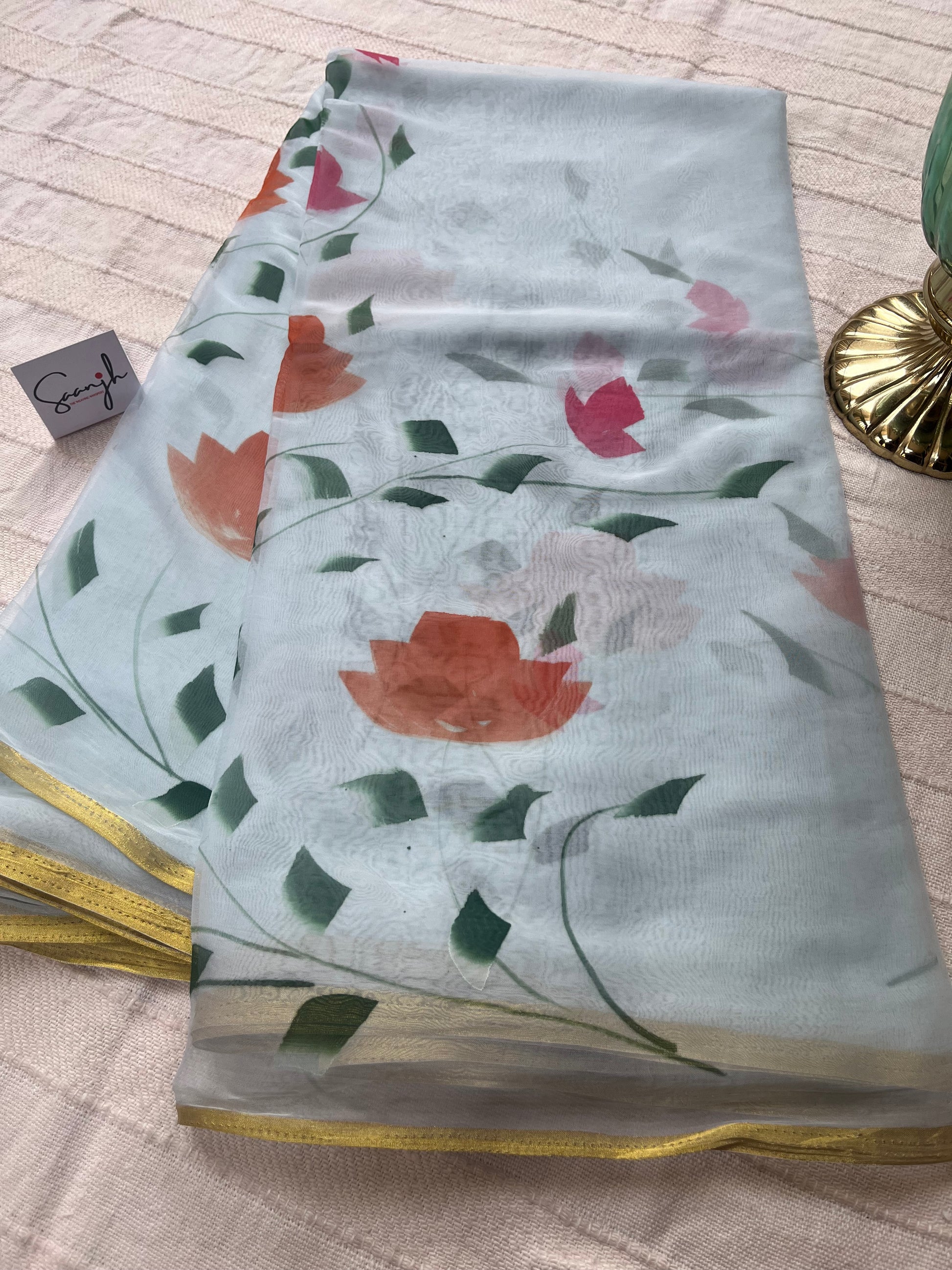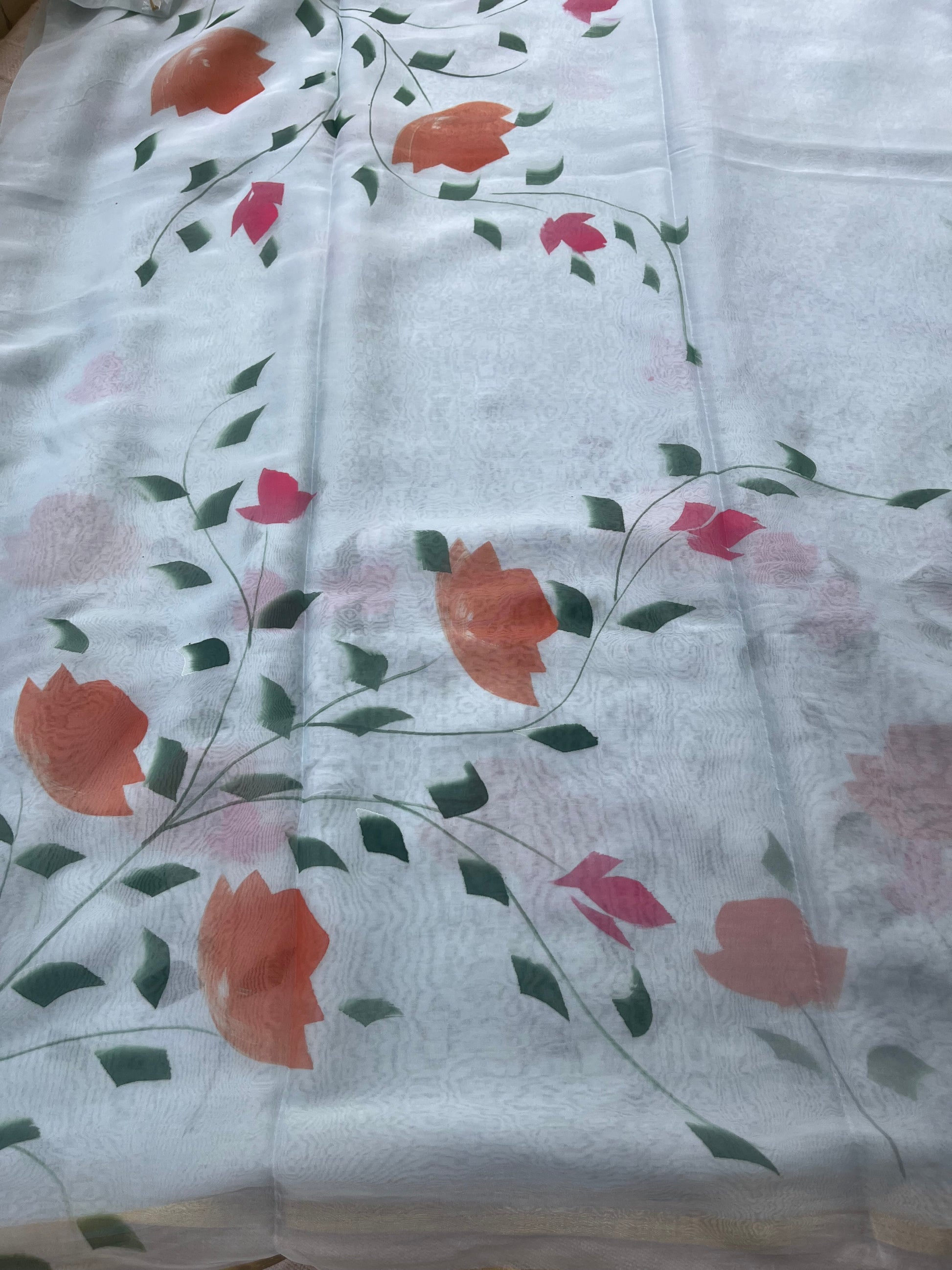 Drape yourself in elegance with our exquisite Hand-Painted Chiffon Saree, a true masterpiece of craftsmanship and artistry. Each saree is meticulously hand-painted by skilled artisans, ensuring that every piece is unique and tells its own story.
