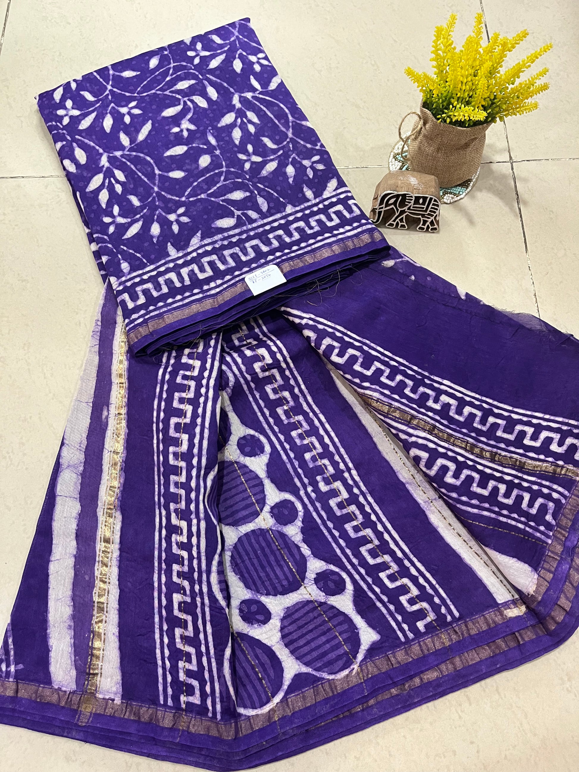 Experience the timeless elegance of our Handblock Chanderi Cotton Silk Saree. This exquisite piece combines the soft, luxurious feel of silk with the lightness and comfort of cotton, creating a perfect blend for any occasion.