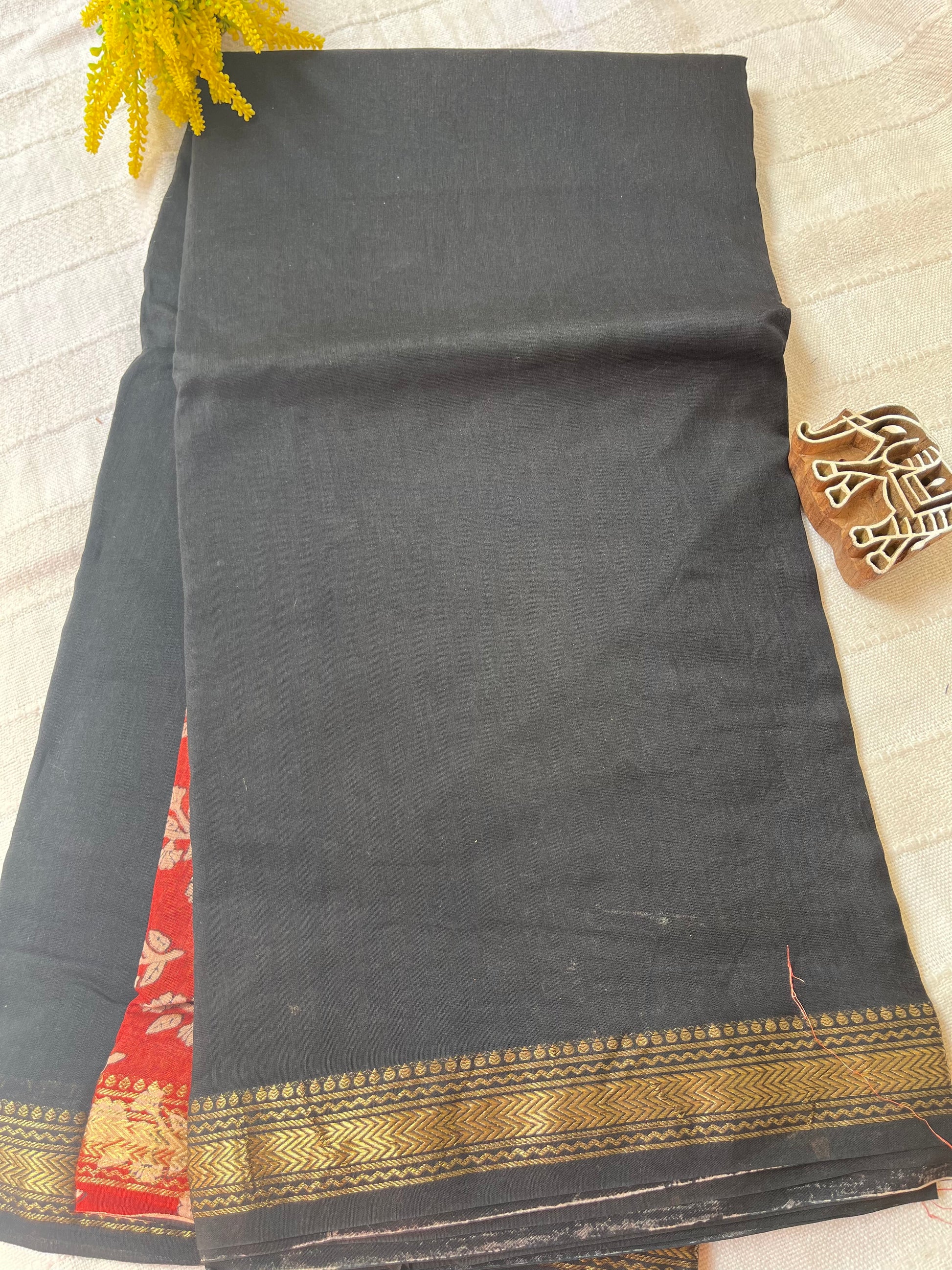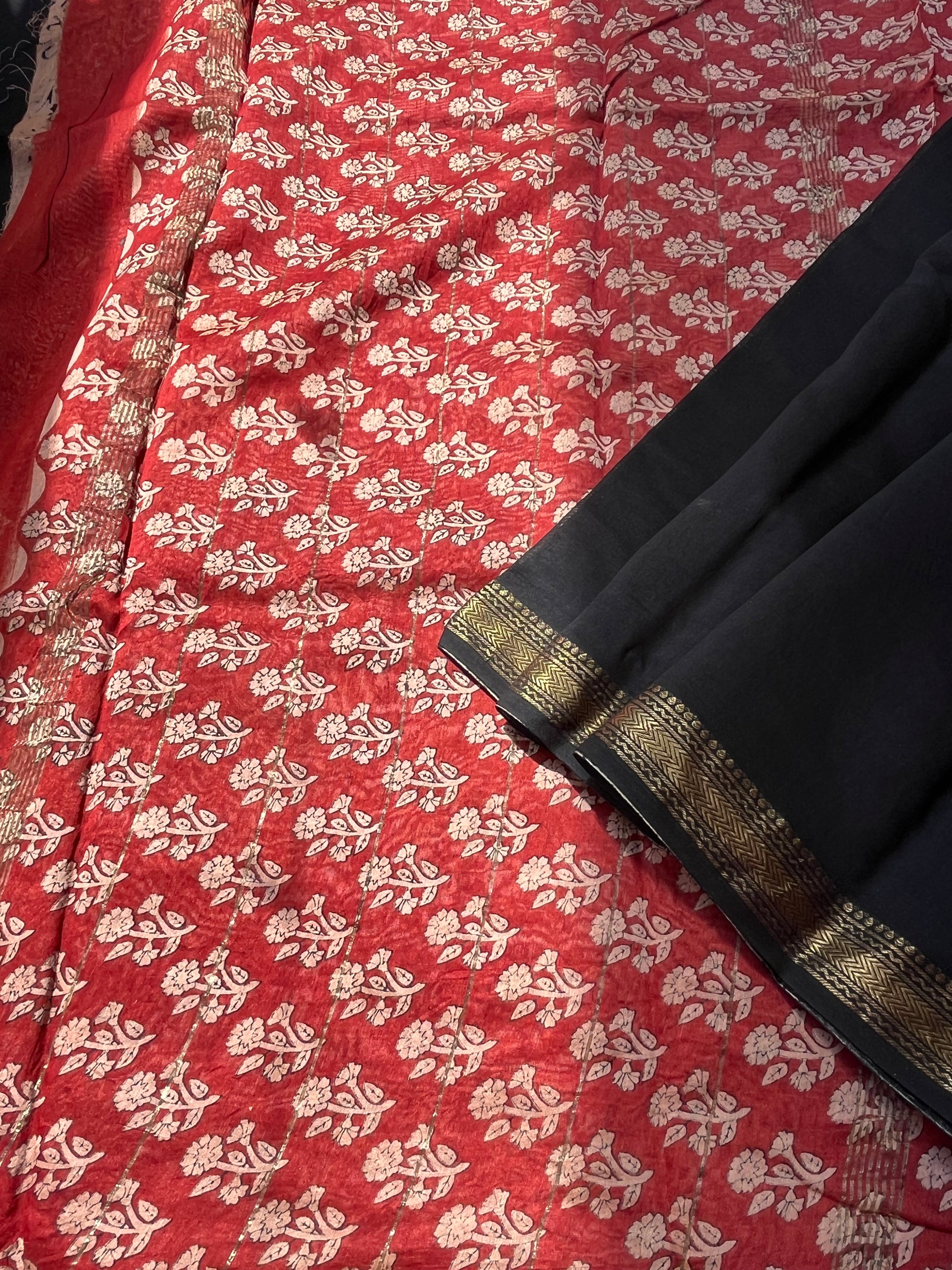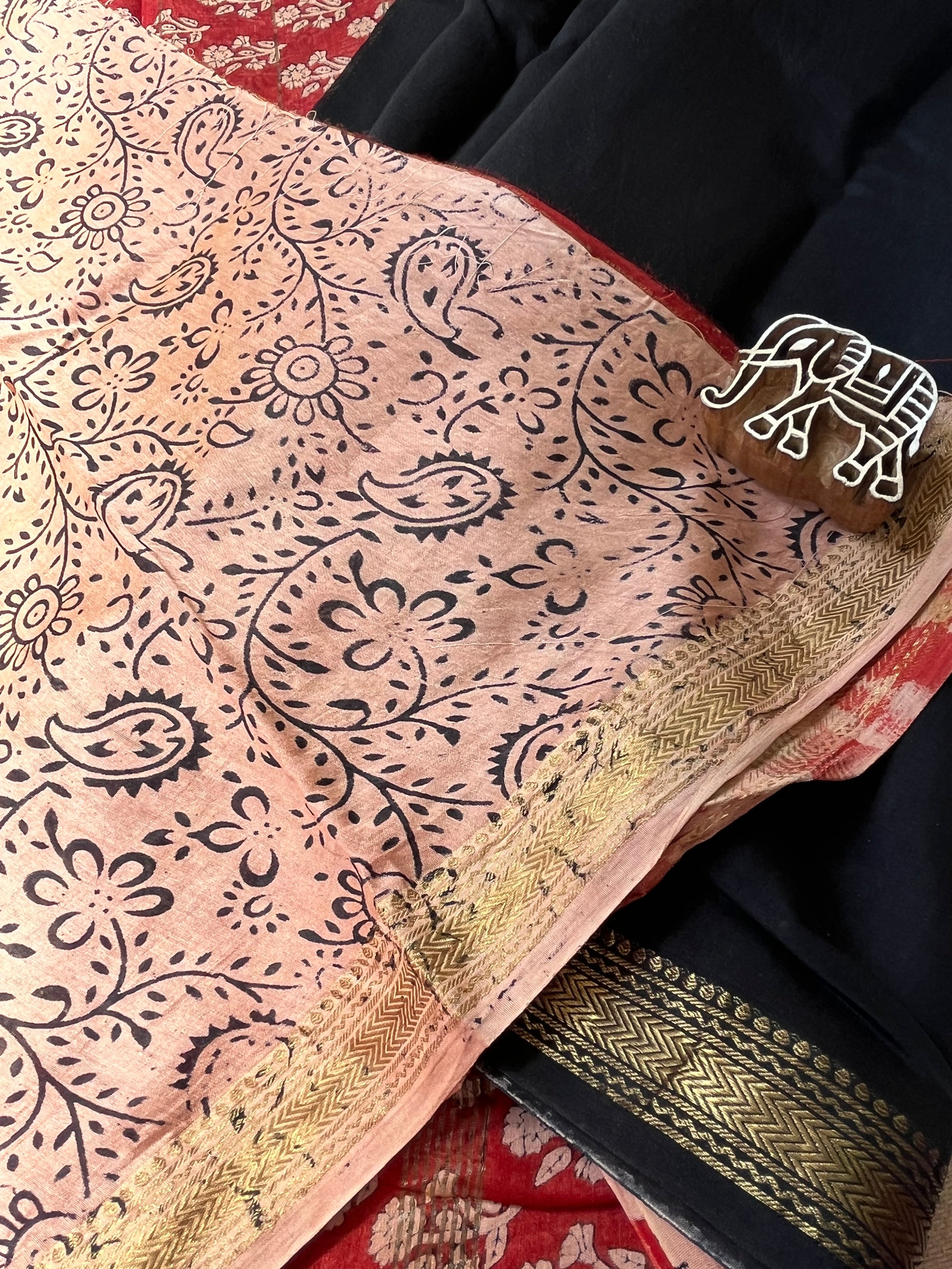 Experience the timeless elegance of our Handblock Maheshwari Cotton Silk Saree. This exquisite piece combines the soft, luxurious feel of silk with the lightness and comfort of cotton, creating a perfect blend for any occasion.