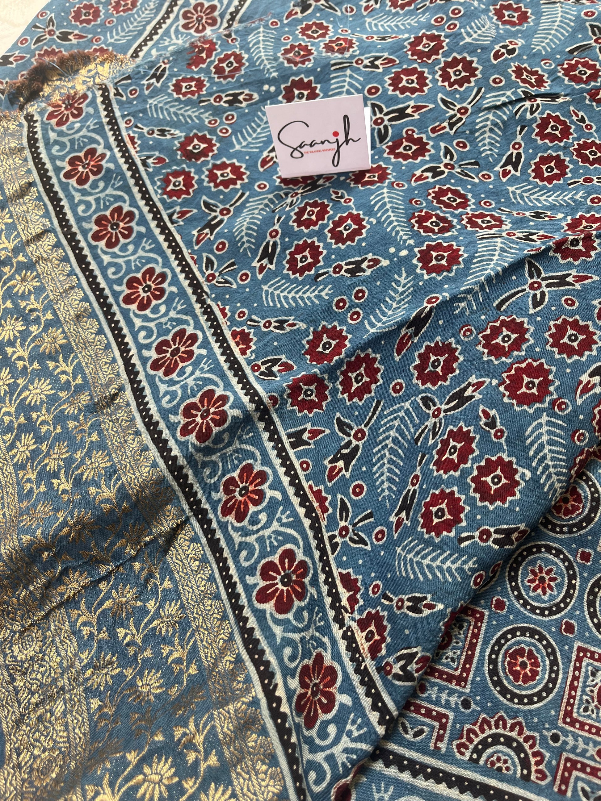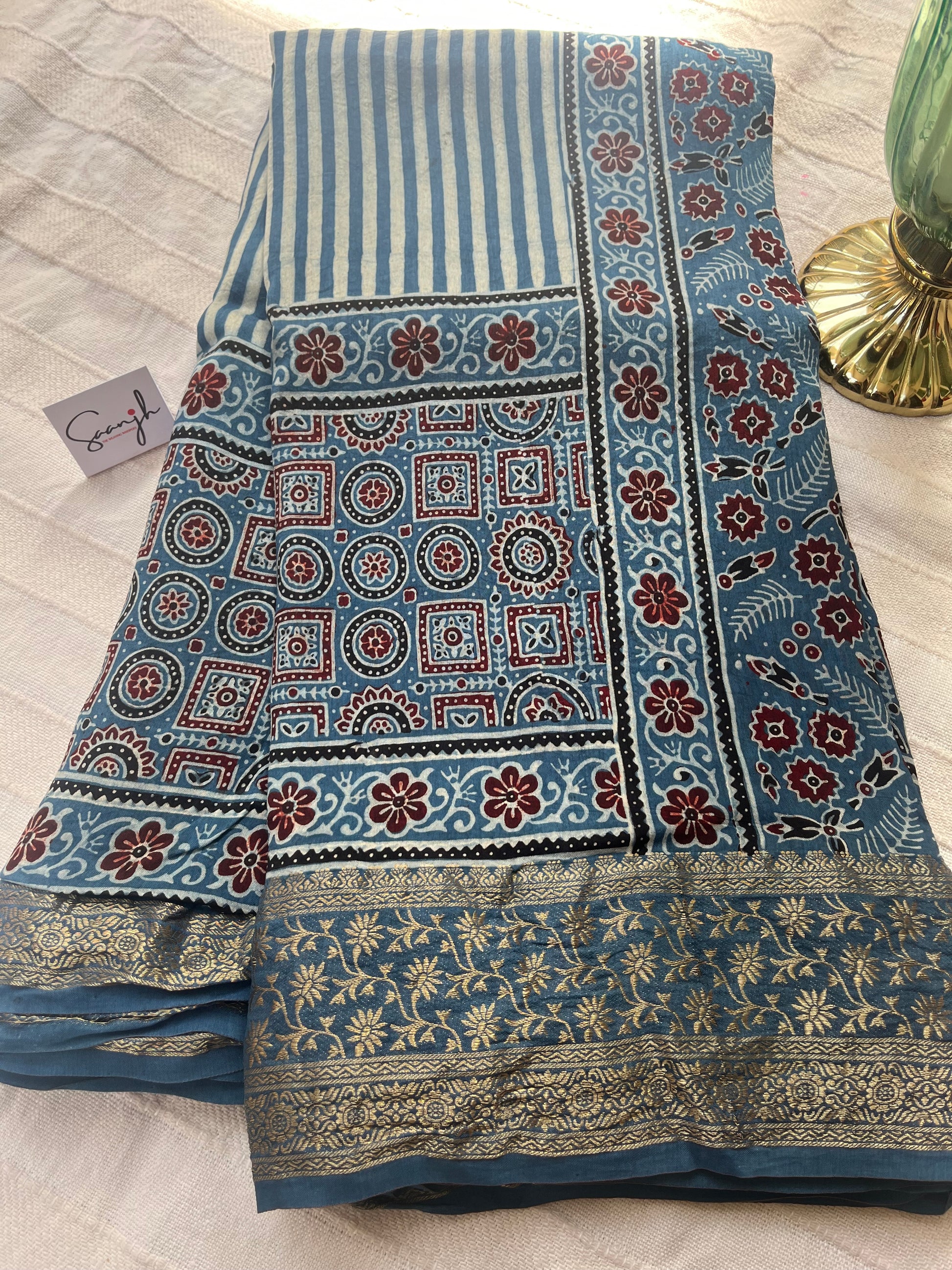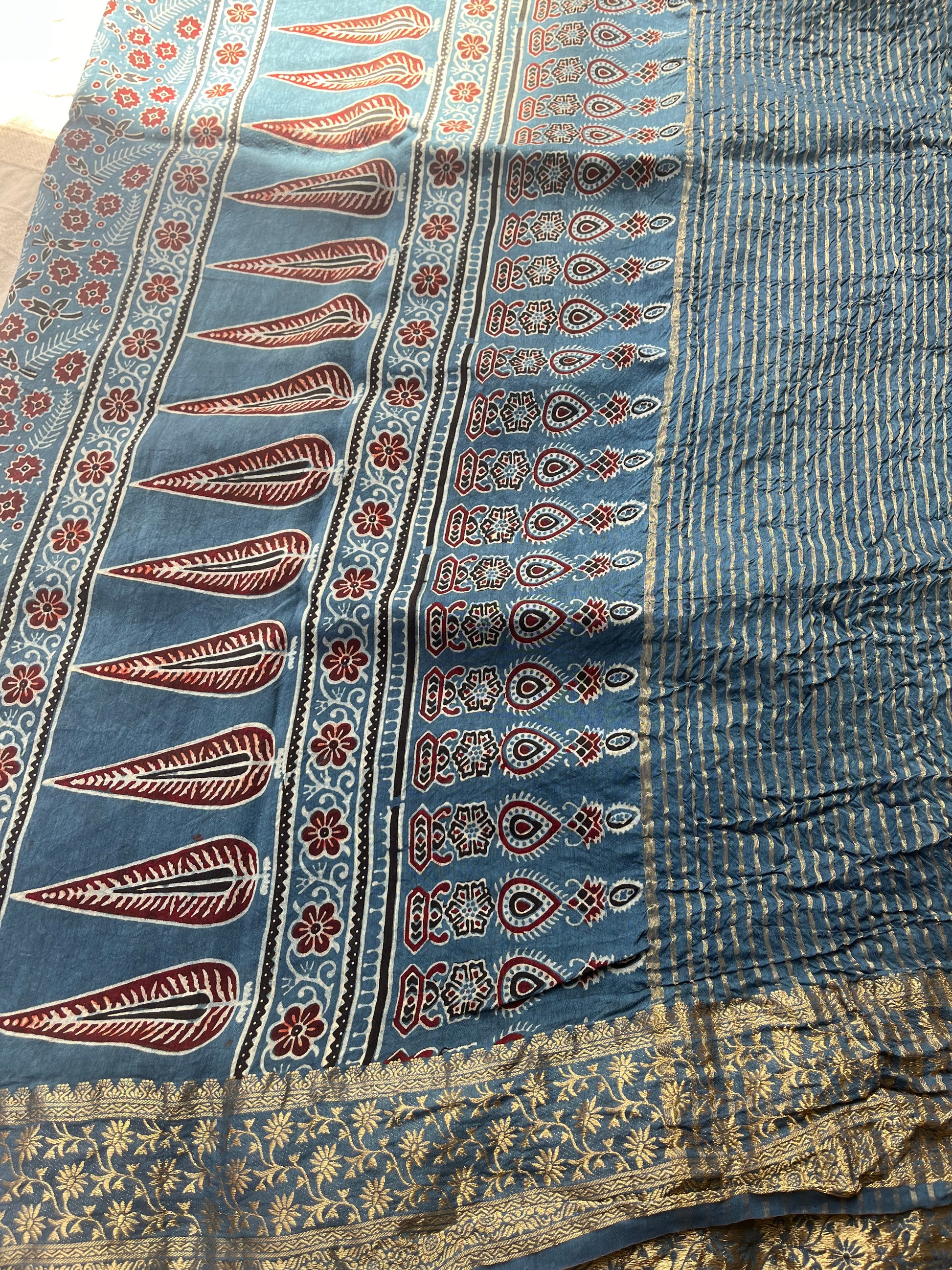 Indigo Ajrakh Dola Silk Saree - Stripes and Badam Block