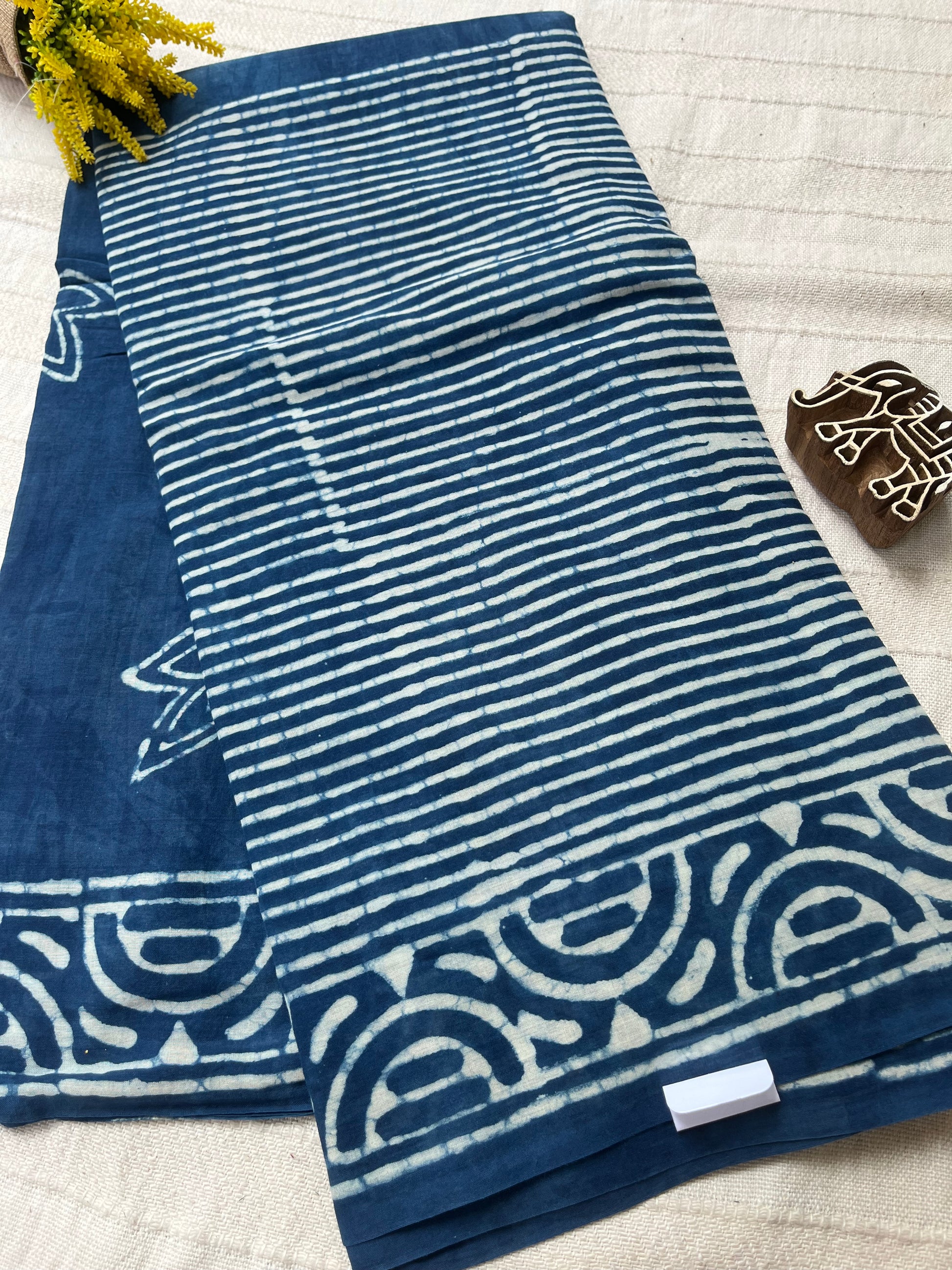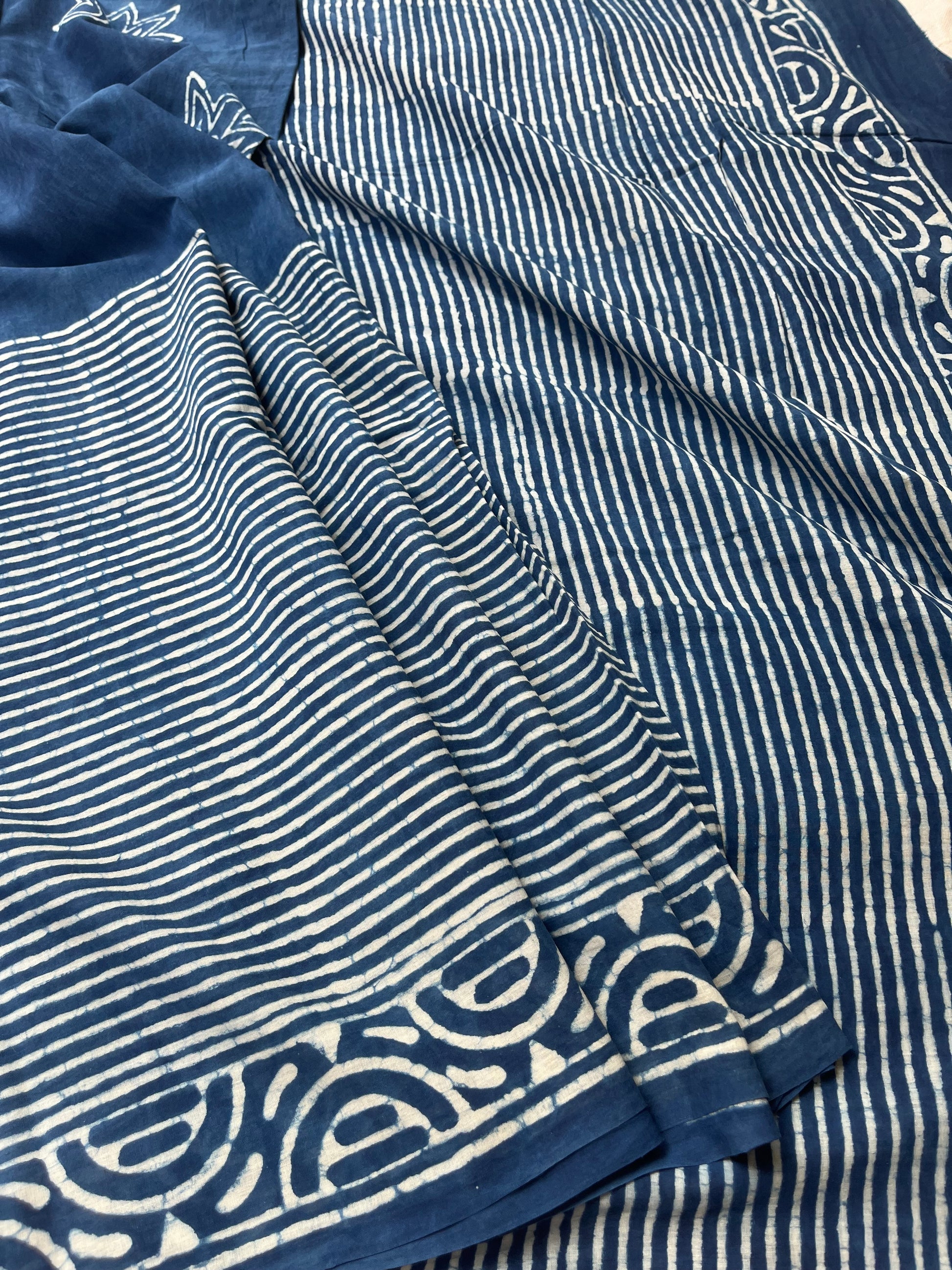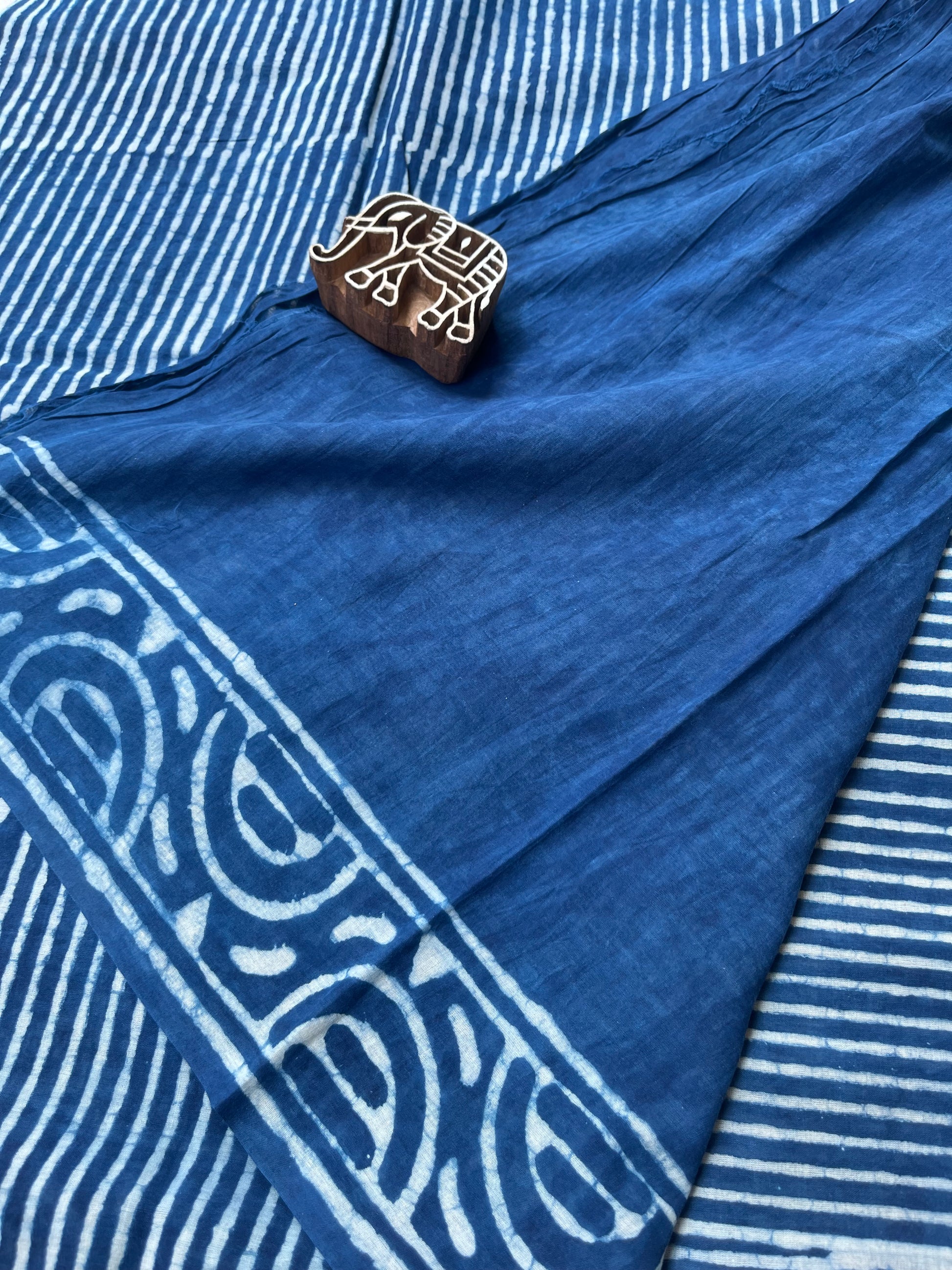 Indigo Handblock Mul Mul Saree with Stripes