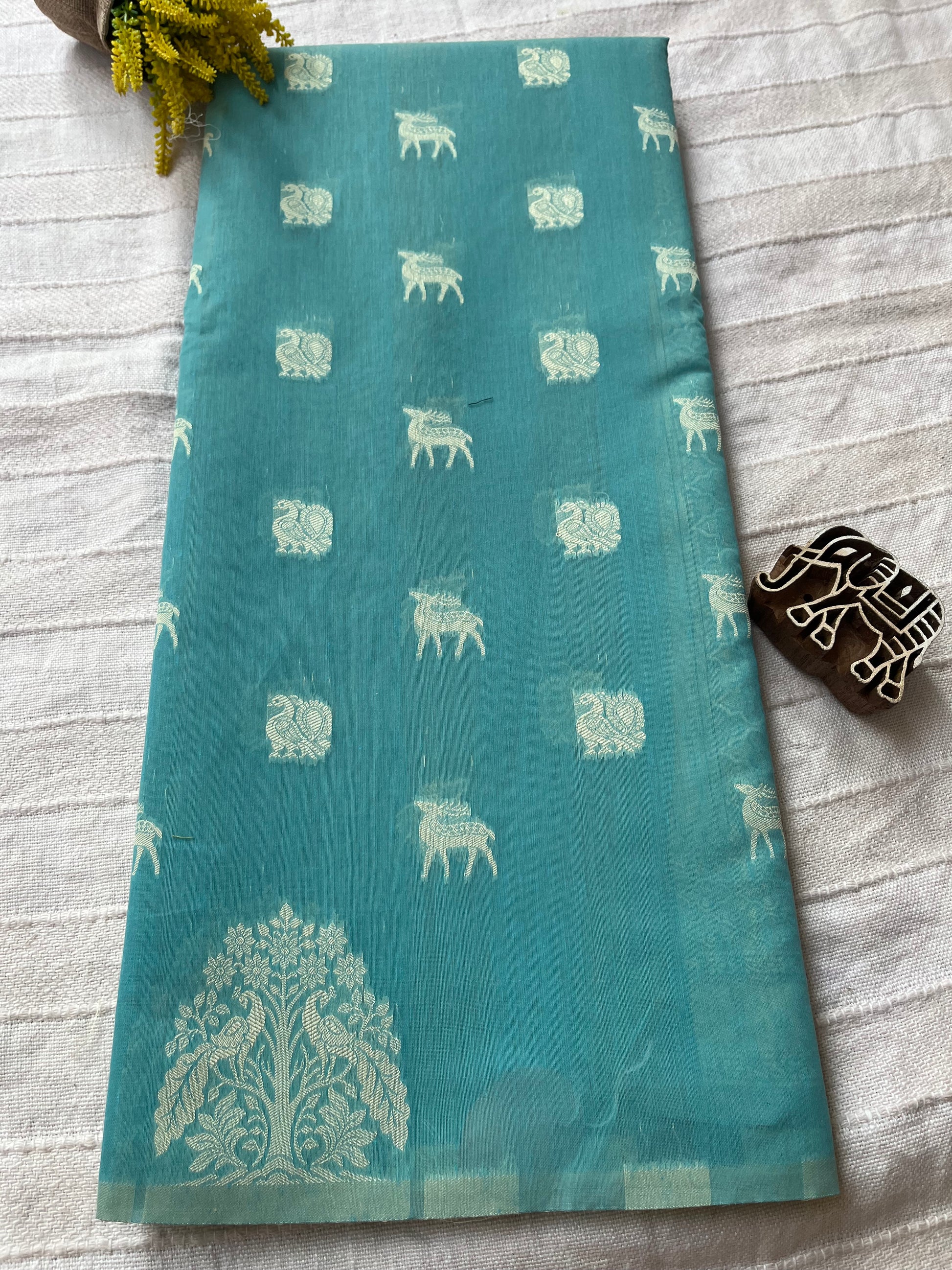 Mercerised Cotton Saree with Dear & Peacock Weaving - Aqua Blue